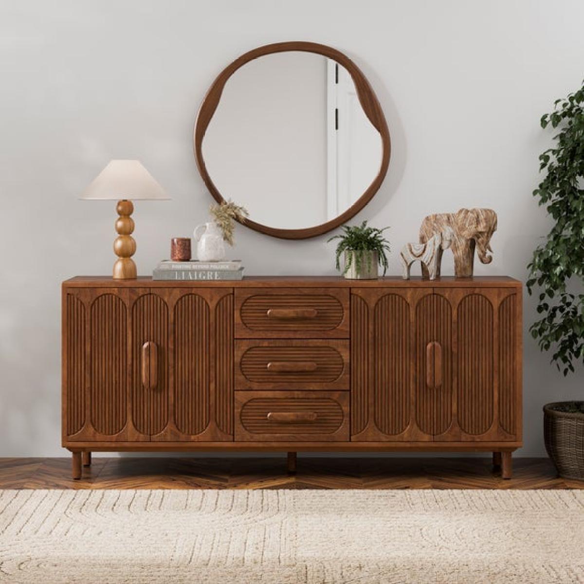 The Khari Sideboard is a fantastic piece for adding warmth and texture to a variety of interiors, thanks to its rich midtone mango wood finish. I love its wide, practical design, making it great for both storage and display. It works particularly well in contemporary spaces with a touch of natural or coastal decor, but can also add a modern edge to more eclectic or bohemian interiors. Styling tips include using the top surface for curated decorative items like vases, lamps, or artwork, while keeping its clever drawers and cabinets free for essentials. Combining it with textured or patterned rugs and a mix of natural materials can really help it stand out as a statement piece.