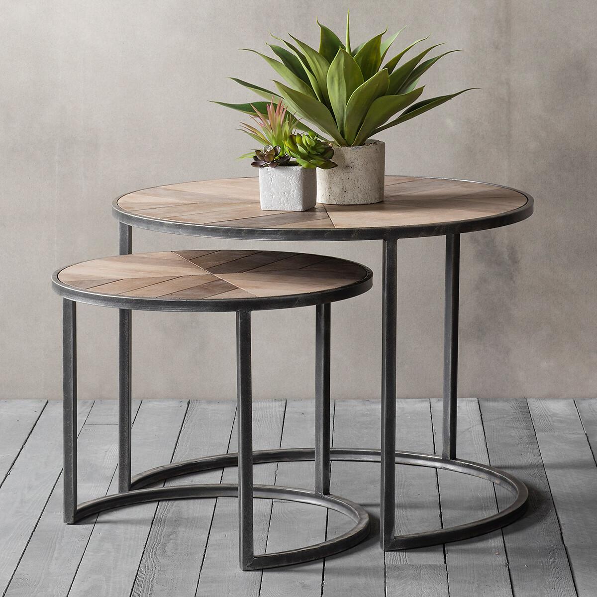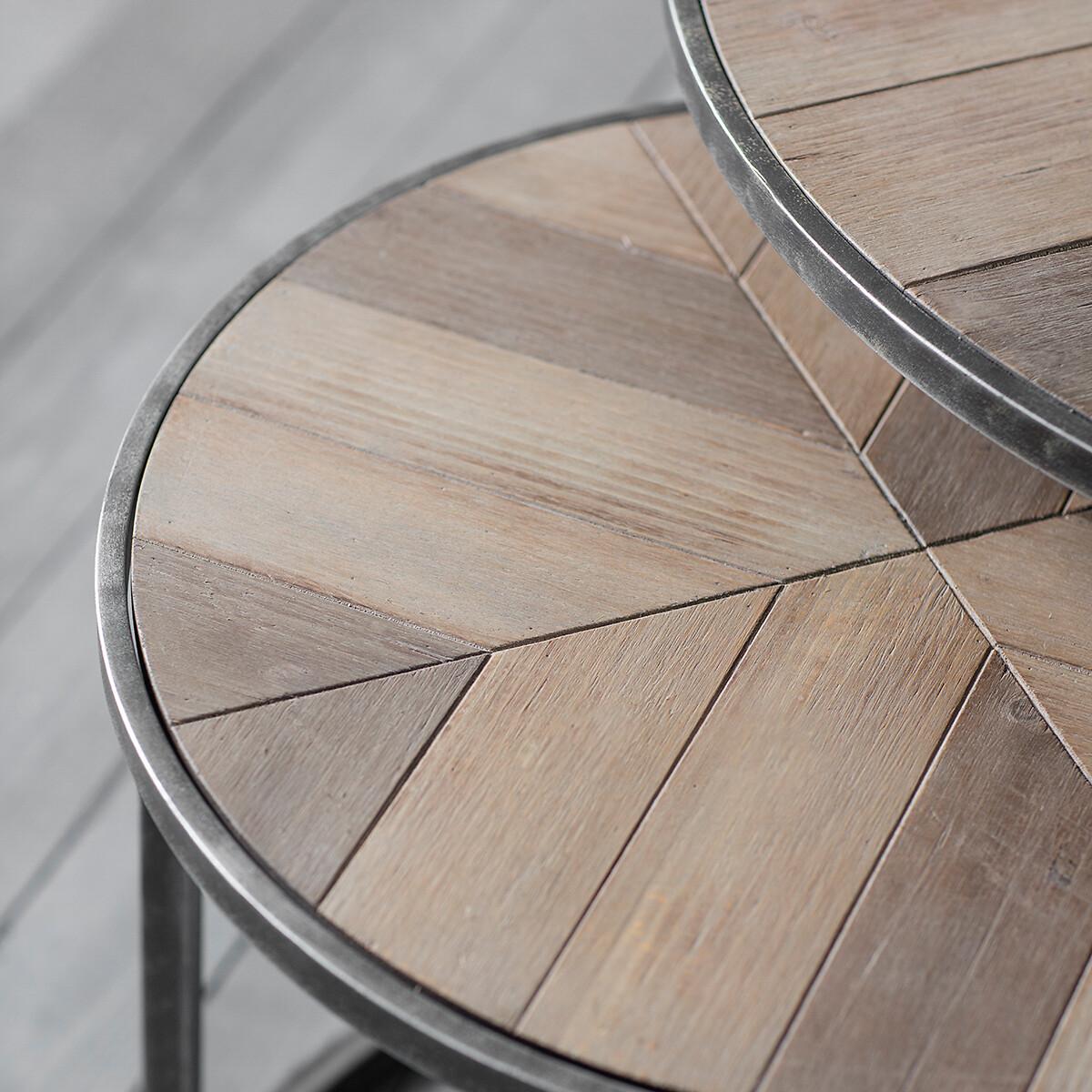 This functional nest of 2 tables features a chevron effect weathered timber inlaid top and gun-metal metallic base that suits any interior with nod towards industrial and eclectic design. Product details. These tables nest under each other for the perfect space saving solution Assembly required. Product Composition - Iron, MDFProduct dimensions. Larger table - 55 x 75 x 75 cm, 6.6 kg. Smaller table - 43 x 40 x 40 cm, 4.1 kg. Package Dimensions - 80 cm x 80 cm x 60 cm, Weight - 12.95 kg. This product will be dispatched by one of our trusted suppliers. You’ll be contacted by their selected courier about your delivery. Please note: this product cannot be delivered to all Offshore Islands, Northern Ireland or Republic of Ireland. GALLE01