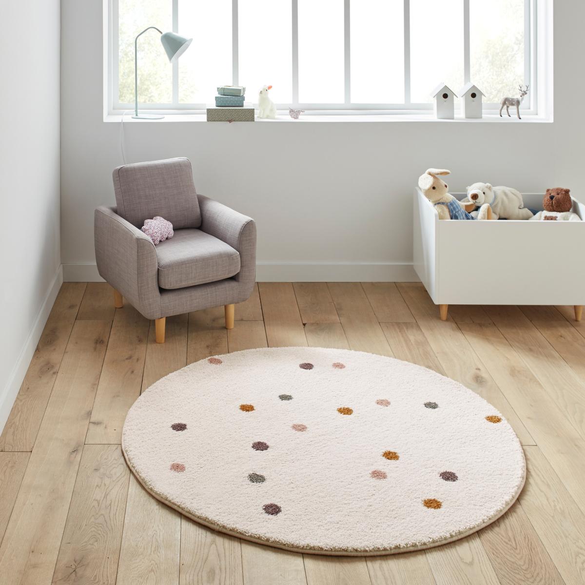Add warmth and fun to your child's room with this round rug from our Khelia range. Ideal for nurseries or bedrooms, it's dotted with multicolour spots in an irregular pattern for a cheery and playful touch.