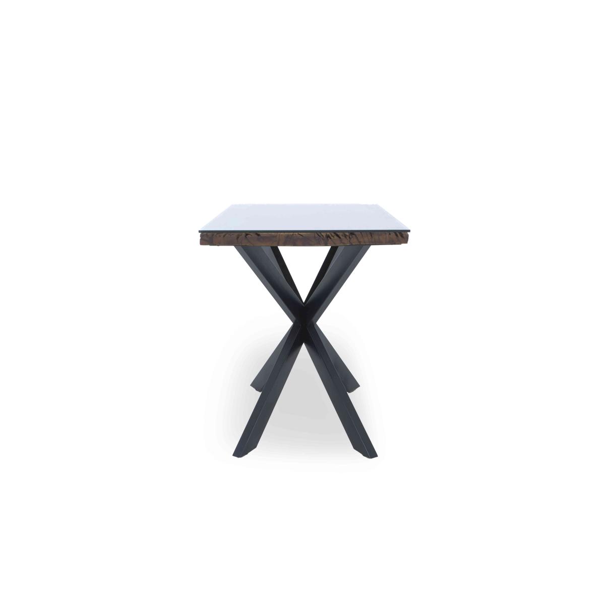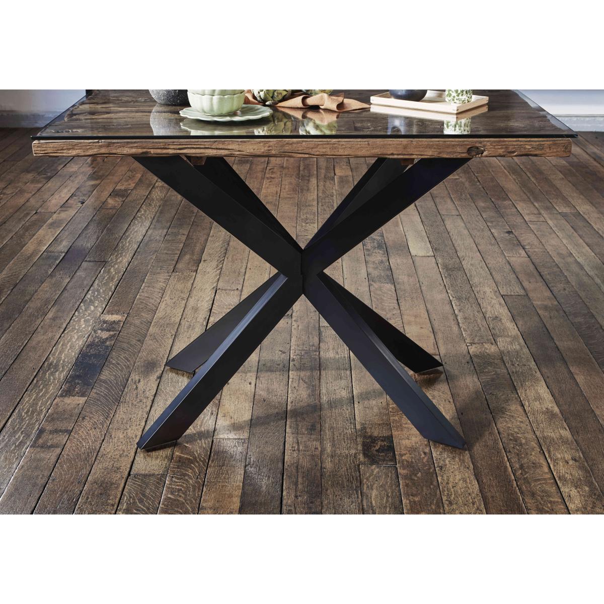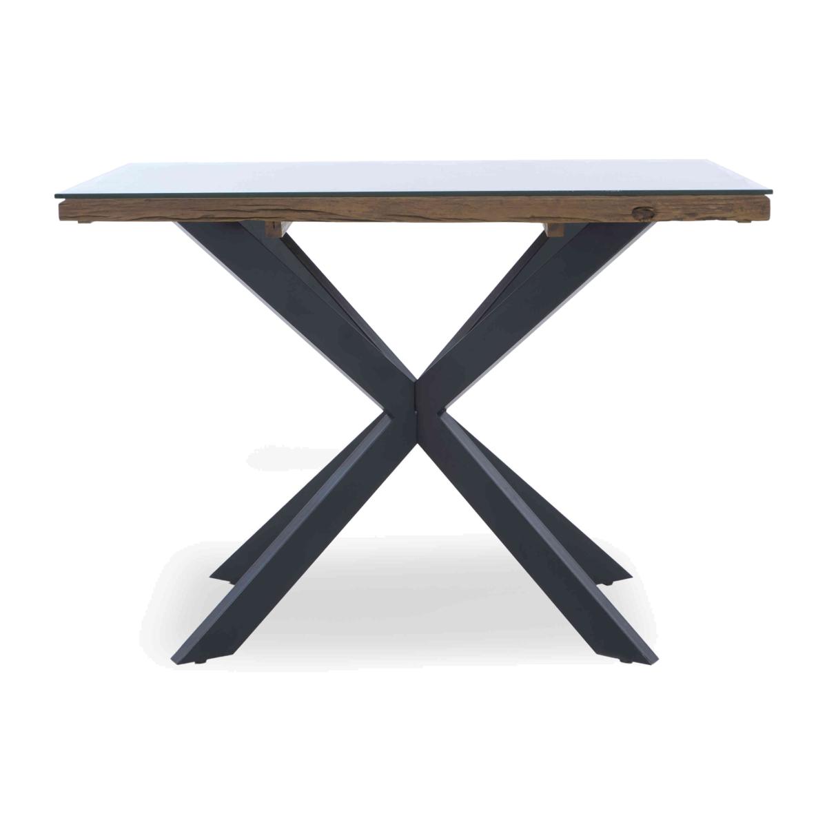 Handcrafted from reclaimed railway sleepers sourced from India and showcasing a creative and striking combination of wood, glass and metal, the furniture in our Kiara collection will appeal to anyone who loves rustic, vintage or bohemian furniture that has a more ethical footprint. Dining tables and living room tables are topped with glass for a touch of sleek style – and to better appreciate the glorious woodgrain beneath – and have sturdy metal bases. This extensive range features a wide selection of dining tables, dining sets, storage furniture and occasional tables for a characterful look that you can enjoy in both your living room and dining room. Perfect for casual breakfasts and relaxed dinners, this characterful bar table has a vintage wood top and black metal star-shaped base. Why you'll love it Statement style for industrial, eclectic and bohemian homes. Fabulous combination of wood, glass and metal. Made from reclaimed railway sleepers sourced from India. Every table is unique. The glass top adds contemporary flair and helps preserve the surface. Black metal star-shaped base. Seats 6. Handcrafted. This bar table is part of the Kiara range. What you need to know This bar table’s wood top will vary in shade and texture across its surface. Filler is used in certain areas to improve the appearance of the wood. The glass top may not be exactly the same size as the wood table top.