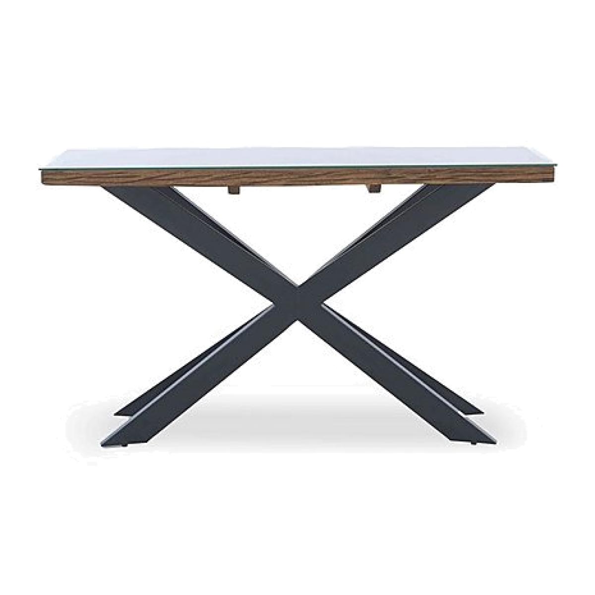 Welcome guests into your home with this hallway console table made with reclaimed wood and set on a bold black metal star- shaped base. Why you'll love it Statement style for industrial, eclectic and bohemian homes. Fabulous combination of wood, glass and metal. Made from reclaimed railway sleepers sourced from India. Every table is unique. The glass top adds contemporary flair and helps preserve the surface. Black metal star- shaped base. Handcrafted. This console table is part of the Kiara range. What you need to know This console table’s wood top will vary in shade and texture across its surface. Filler is used in certain areas to improve the appearance of the wood. The glass top may not be exactly the same size as the wood table top.