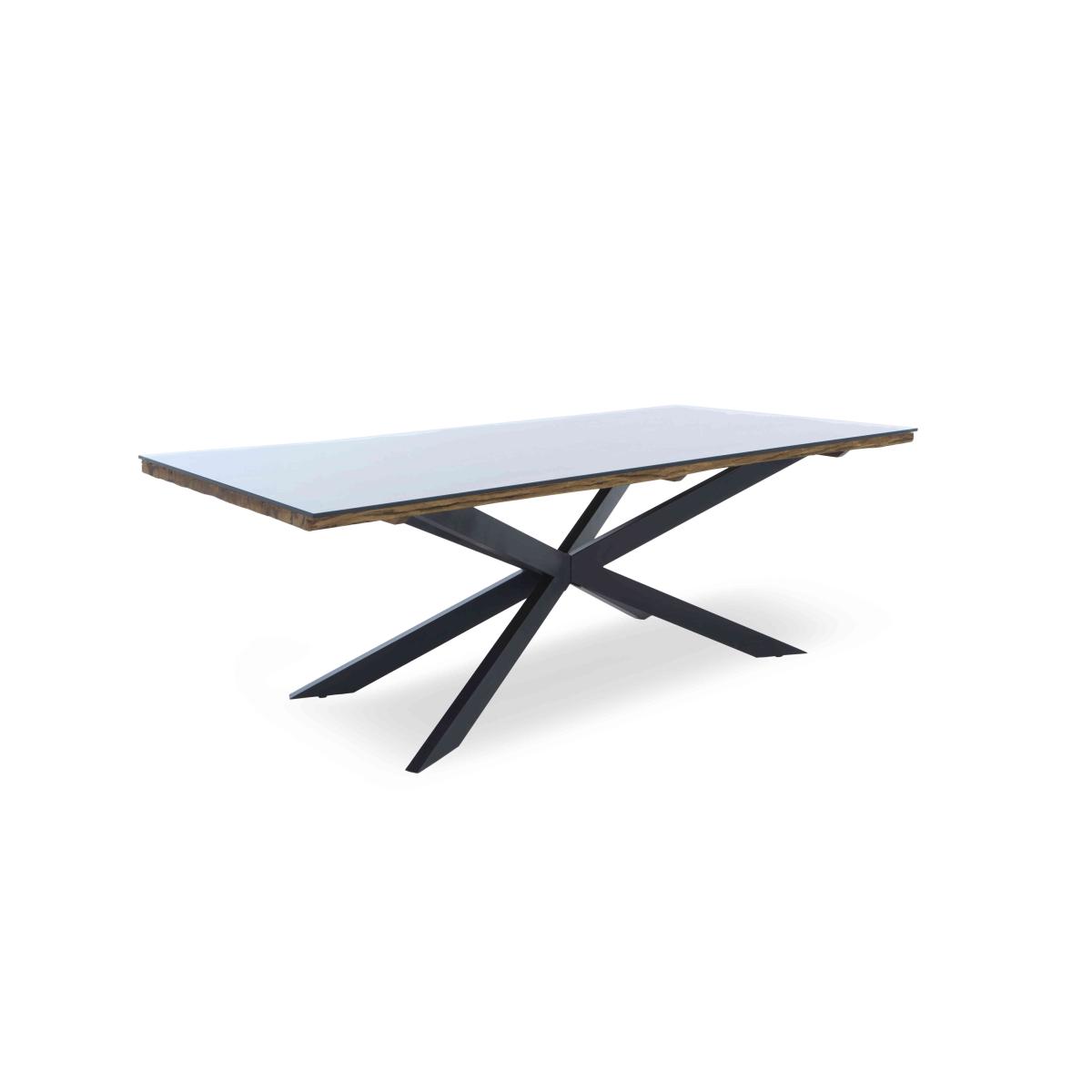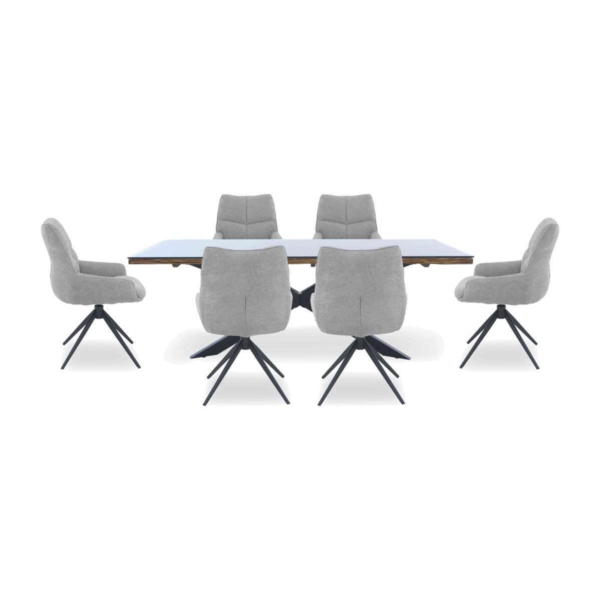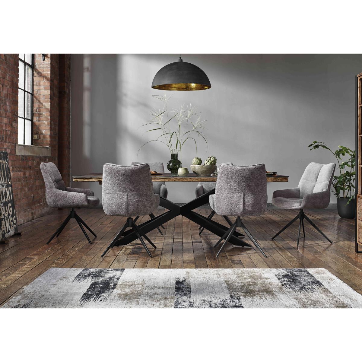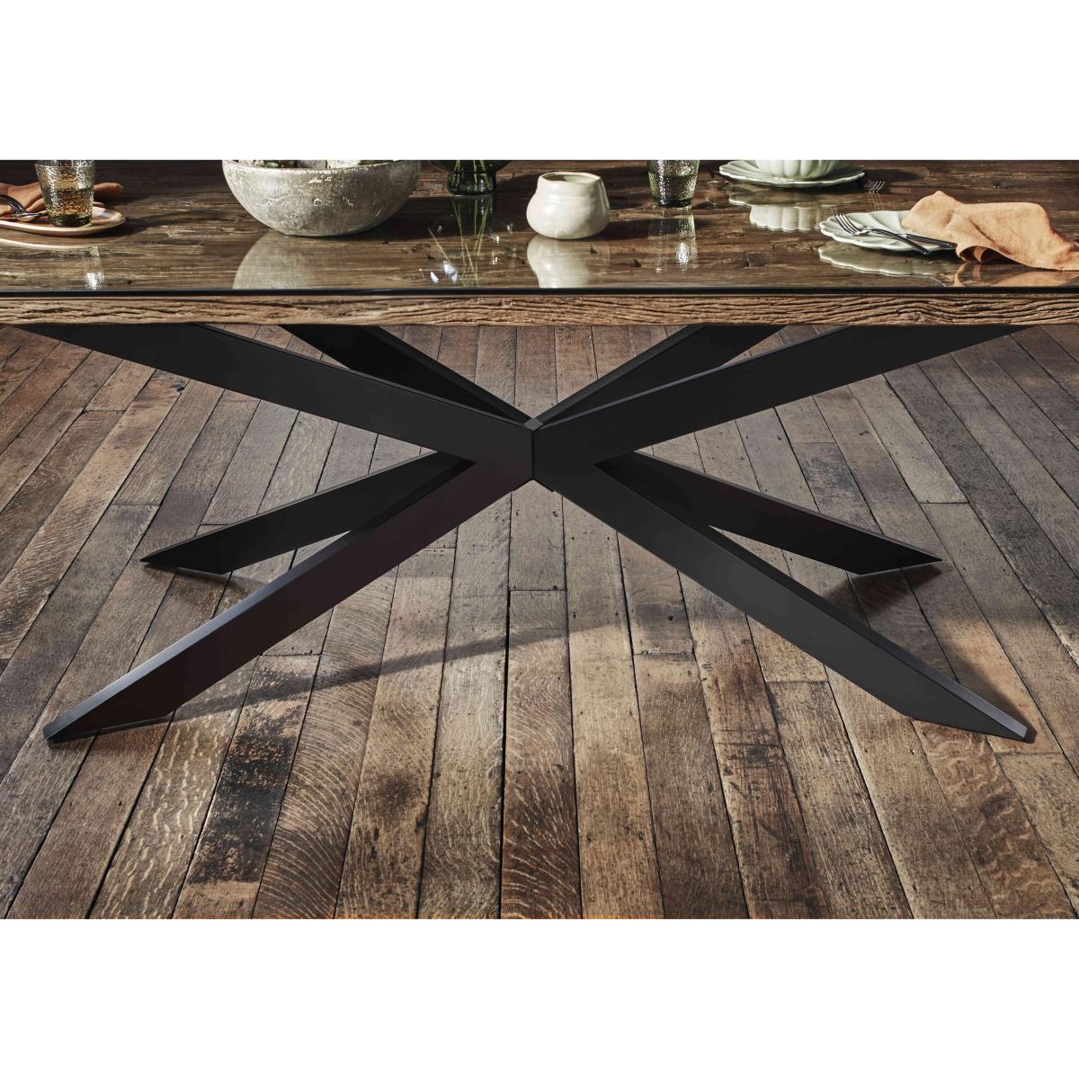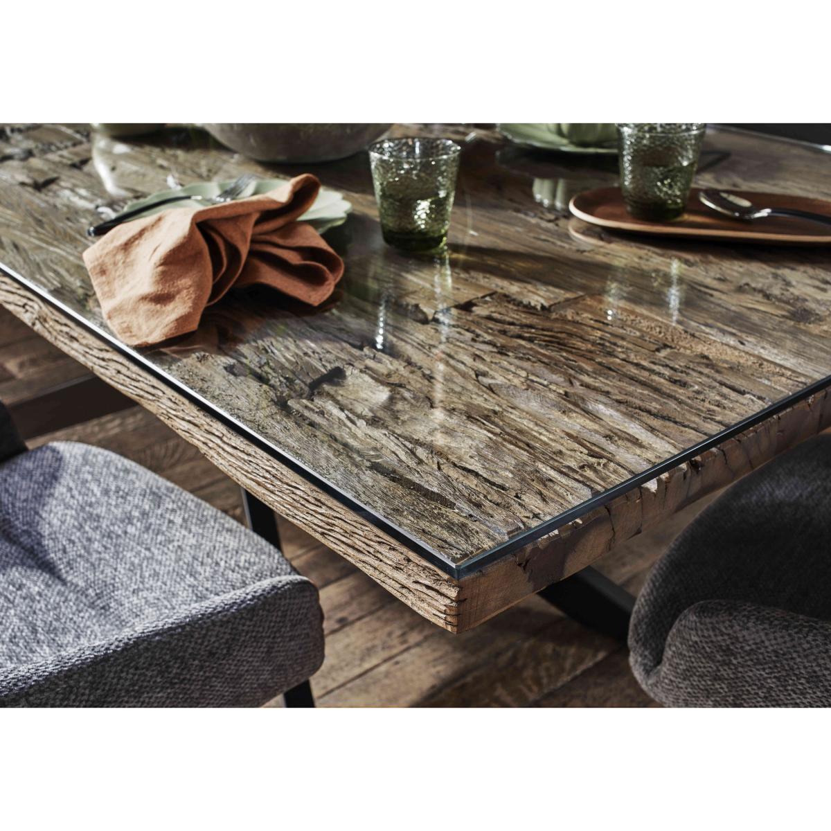 Handcrafted from reclaimed railway sleepers sourced from India and showcasing a creative and striking combination of wood, glass and metal, the furniture in our Kiara collection will appeal to anyone who loves rustic, vintage or bohemian furniture that has a more ethical footprint. Dining tables and living room tables are topped with glass for a touch of sleek style – and to better appreciate the glorious woodgrain beneath – and have sturdy metal bases. This extensive range features a wide selection of dining tables, dining sets, storage furniture and occasional tables for a characterful look that you can enjoy in both your living room and dining room. Make a statement with this characterful dining set. The large dining table is made with reclaimed railway sleeper wood and the set includes six swivel dining chairs. Why you'll love it Statement dining style for industrial, eclectic and bohemian homes. Dining table showcases a fabulous combination of wood, glass and metal. Made from reclaimed railway sleepers sourced from India. Every table is unique. The glass top adds contemporary flair and helps preserve the surface. Black metal star-shaped base is a practical design for dining comfort. Dining set includes 6 wonderfully comfortable and very versatile dining chairs. Chairs have ergonomic swivel bases and black metal legs. Soft fabric upholstery in a choice of colours. Handcrafted. This dining set is part of the Kiara range. What you need to know Dining chairs have metal frames and legs and are cushioned with foam. This large 220 cm dining table seats 8. This dining table’s wood top will vary in shade and texture across its surface. Filler is used in certain areas to improve the appearance of the wood. The glass top may not be exactly the same size as the wood table top.