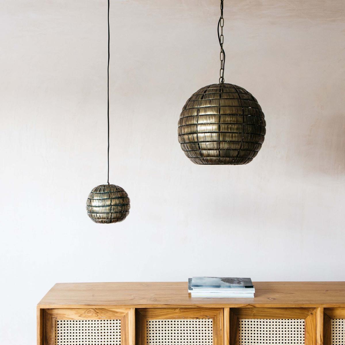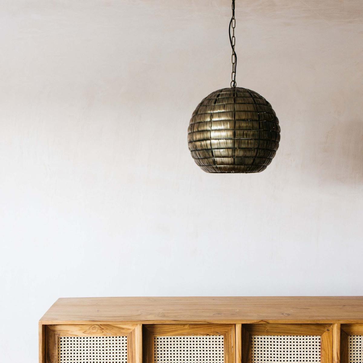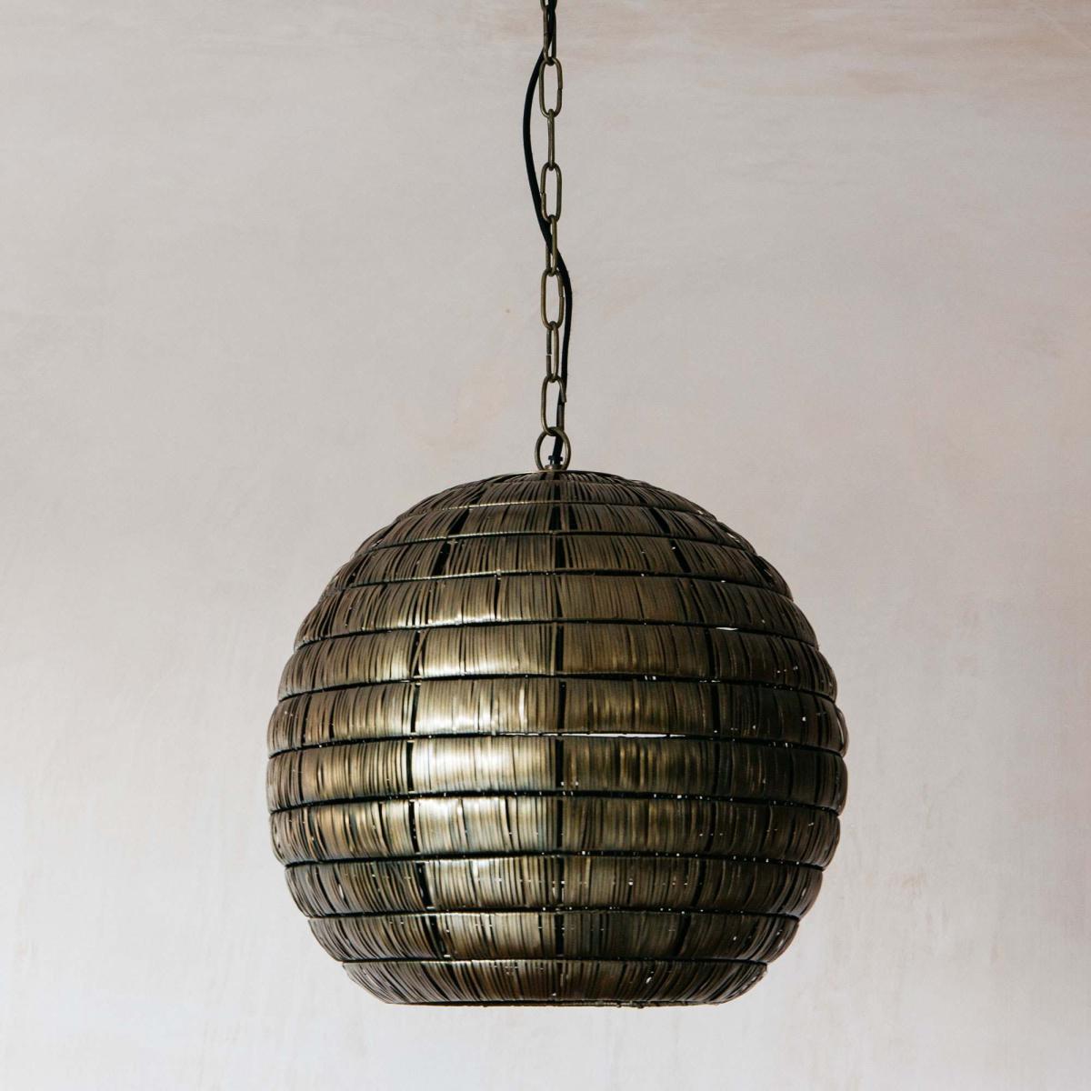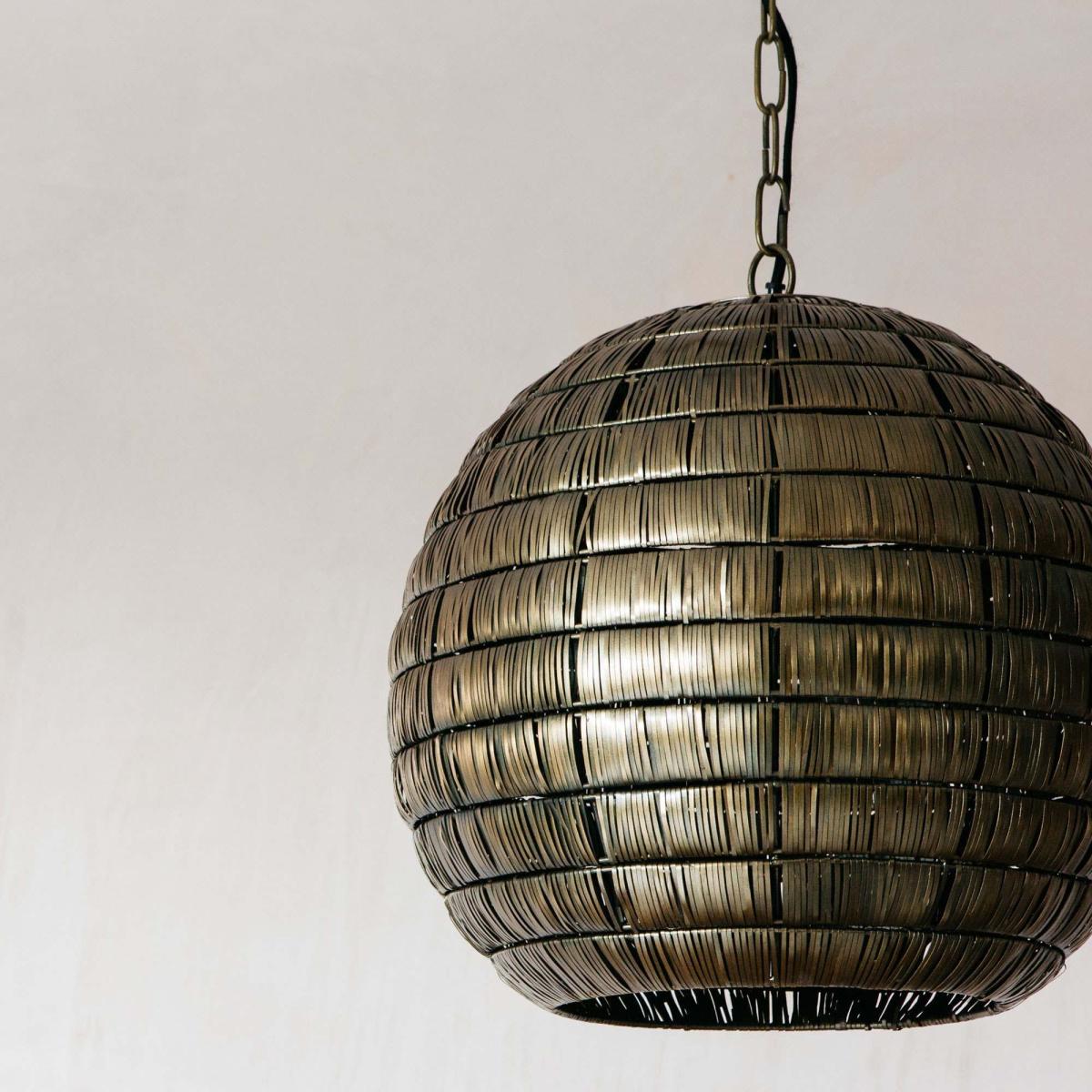 Our Kiara hanging pendant lamp in antiqued bronze is handmade in Kerala. Size medium.