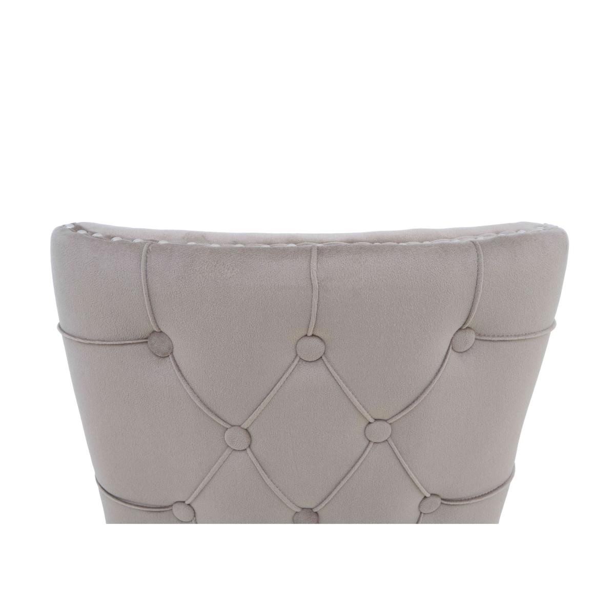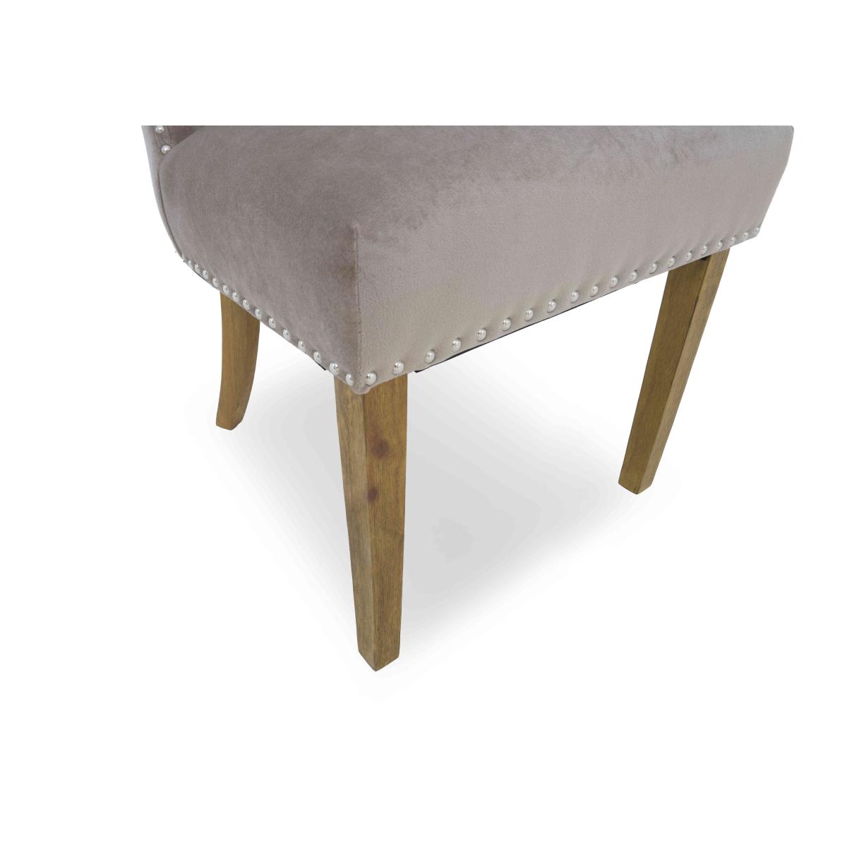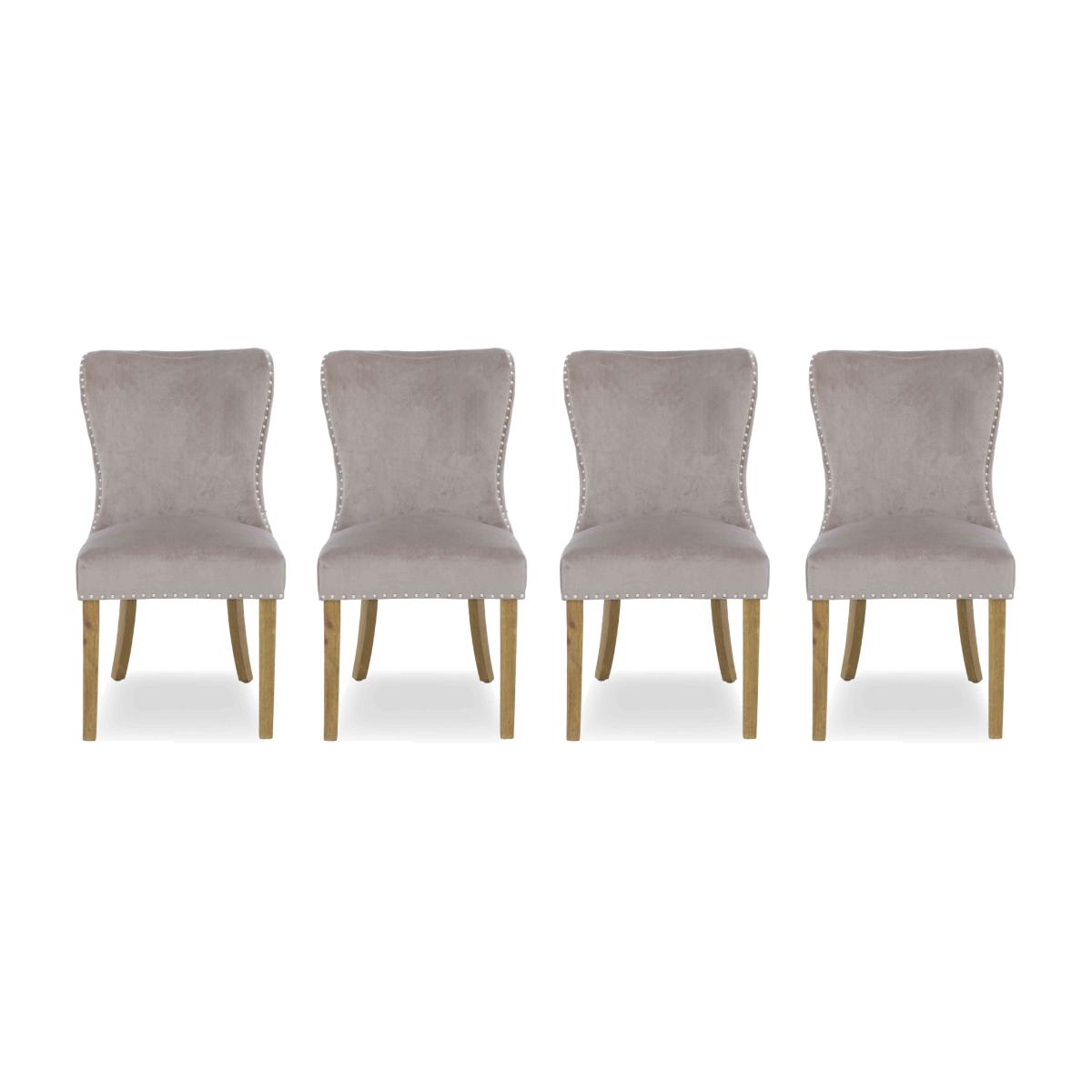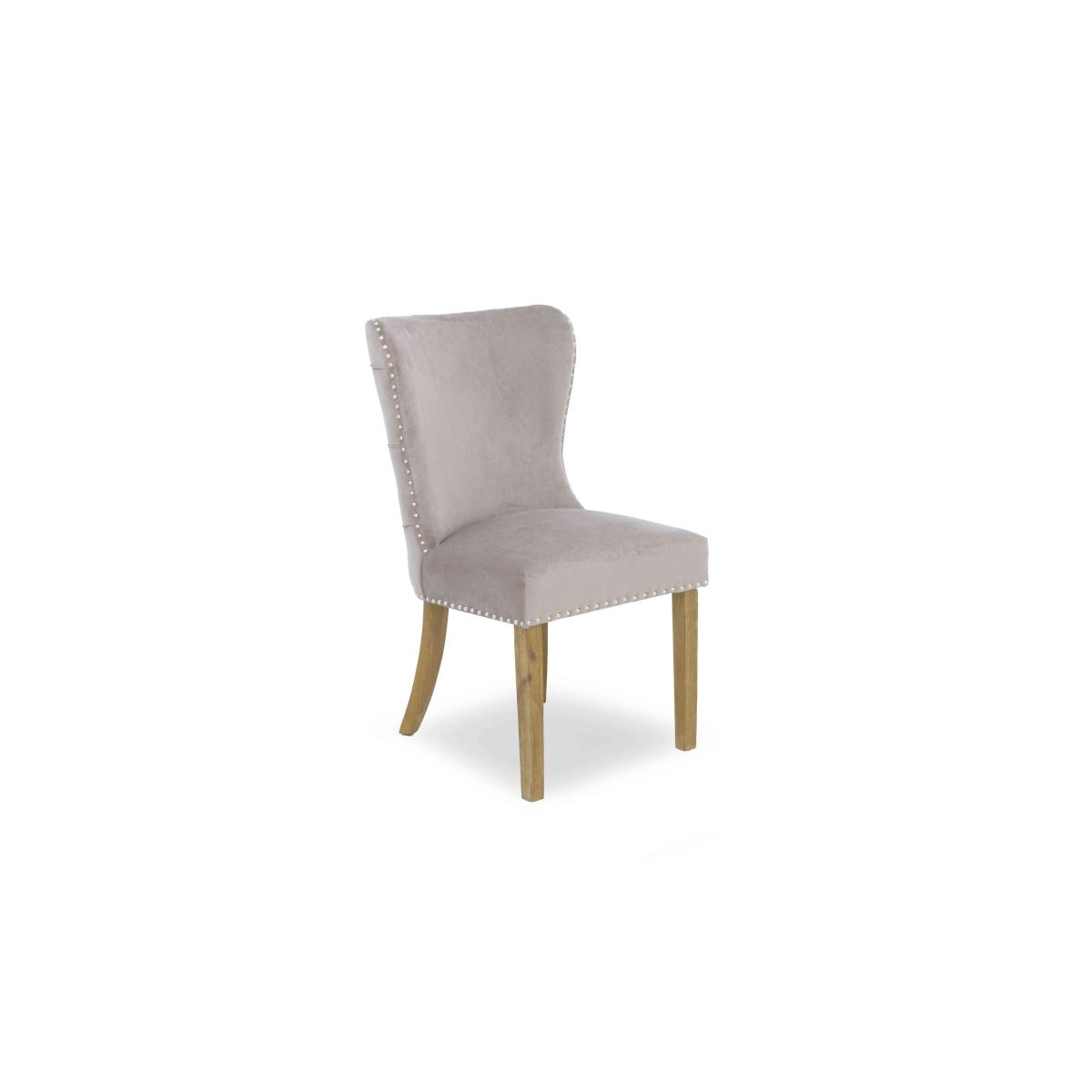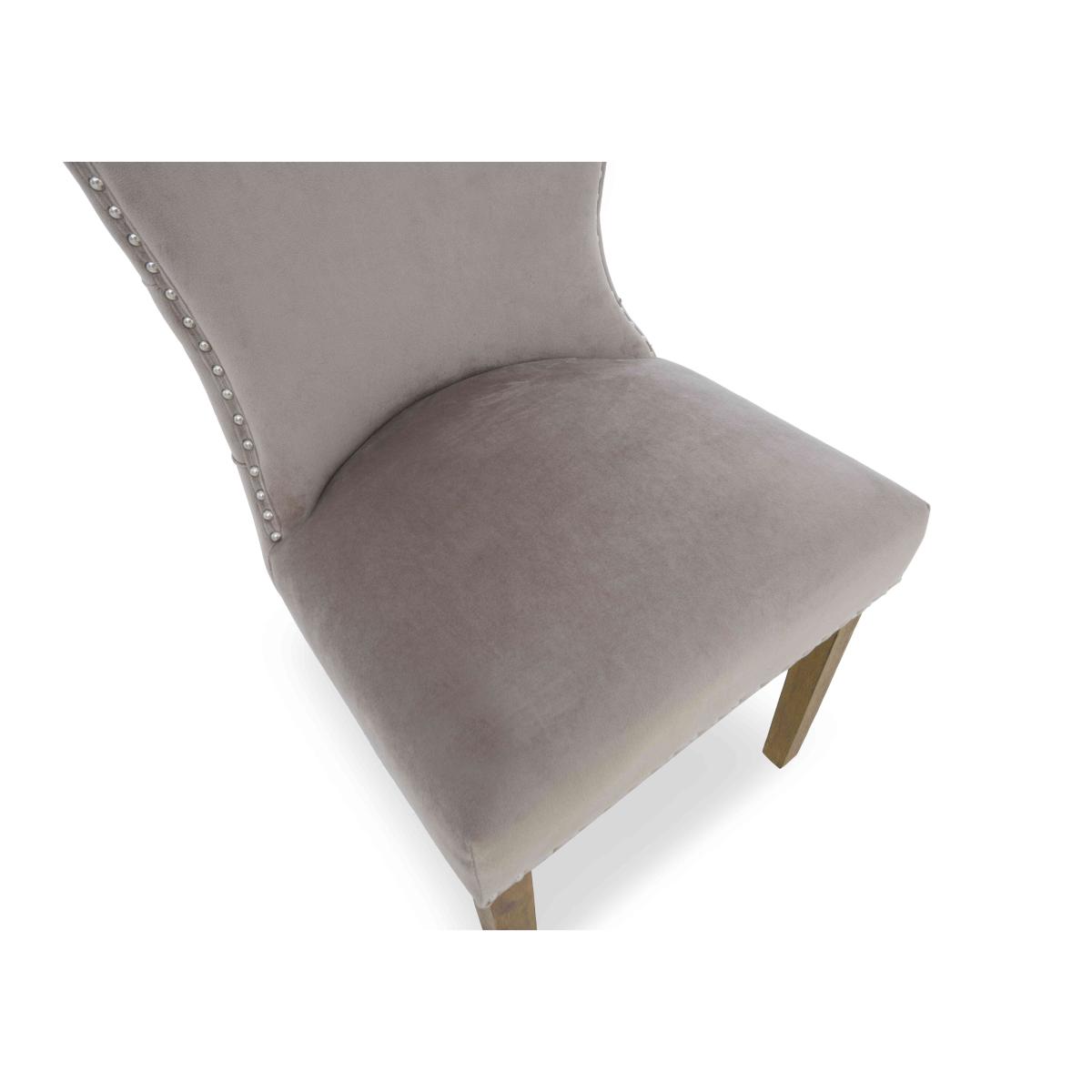 Handcrafted from reclaimed railway sleepers sourced from India and showcasing a creative and striking combination of wood, glass and metal, the furniture in our Kiara collection will appeal to anyone who loves rustic, vintage or bohemian furniture that has a more ethical footprint. Dining tables and living room tables are topped with glass for a touch of sleek style – and to better appreciate the glorious woodgrain beneath – and have sturdy metal bases. This extensive range features a wide selection of dining tables, dining sets, storage furniture and occasional tables for a characterful look that you can enjoy in both your living room and dining room. This set of four luxe dining chairs makes any dining space more elegant. Chairs have curved silhouettes and are embellished with buttoning and metallic studding. Why you'll love it This set of 4 luxe fabric dining chairs. Wonderfully comfortable and very stylish. Statement dining style for any home. Elegantly curved silhouettes. With buttoning and metallic studding detail. Soft fabric upholstery in a versatile taupe colour. Also available individually and in a set of 6 dining chairs. This set of 4 luxe fabric dining chairs is part of the Kiara range. What you need to know Oak and ash legs. Cushioned with foam.