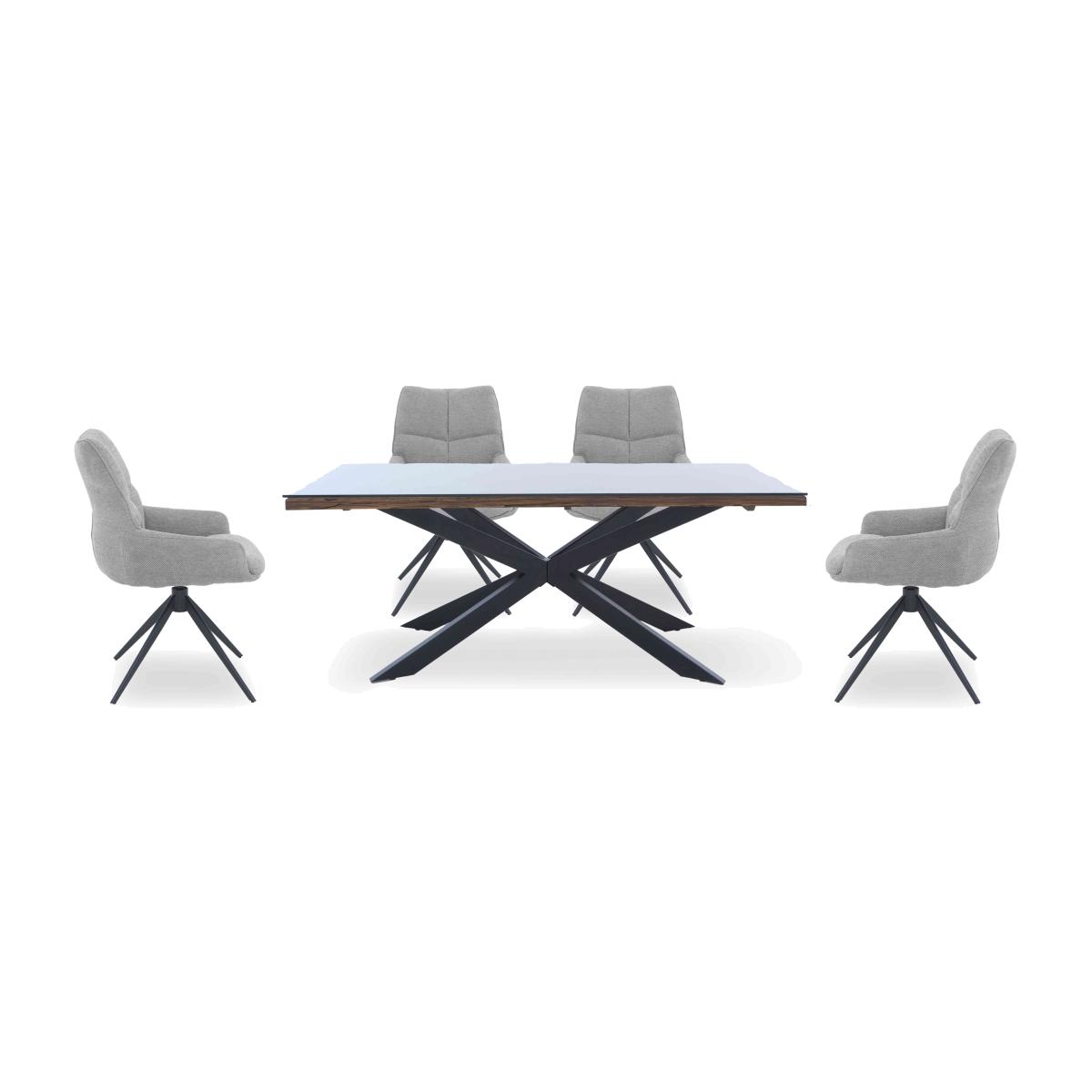 Handcrafted from reclaimed railway sleepers sourced from India and showcasing a creative and striking combination of wood, glass and metal, the furniture in our Kiara collection will appeal to anyone who loves rustic, vintage or bohemian furniture that has a more ethical footprint. Dining tables and living room tables are topped with glass for a touch of sleek style – and to better appreciate the glorious woodgrain beneath – and have sturdy metal bases. This extensive range features a wide selection of dining tables, dining sets, storage furniture and occasional tables for a characterful look that you can enjoy in both your living room and dining room. This characterful dining set is perfect for a smaller dining room. The handcrafted table is made with reclaimed wood and seats six in comfort and the set includes four swivel dining chairs. Why you'll love it Statement dining style for industrial, eclectic and bohemian homes. Dining table showcases a fabulous combination of wood, glass and metal. Made from reclaimed railway sleepers sourced from India. Every table is unique. The glass top adds contemporary flair and helps preserve the surface. Black metal star-shaped base is a practical design for dining comfort. Dining set includes 4 wonderfully comfortable and very versatile dining chairs. Chairs have ergonomic swivel bases and black metal legs. Soft fabric upholstery in a choice of colours. Handcrafted. This dining set is part of the Kiara range. What you need to know Dining chairs have metal frames and legs and are cushioned with foam. This small 180 cm dining table seats 6. This dining table’s wood top will vary in shade and texture across its surface. Filler is used in certain areas to improve the appearance of the wood. The glass top may not be exactly the same size as the wood table top.