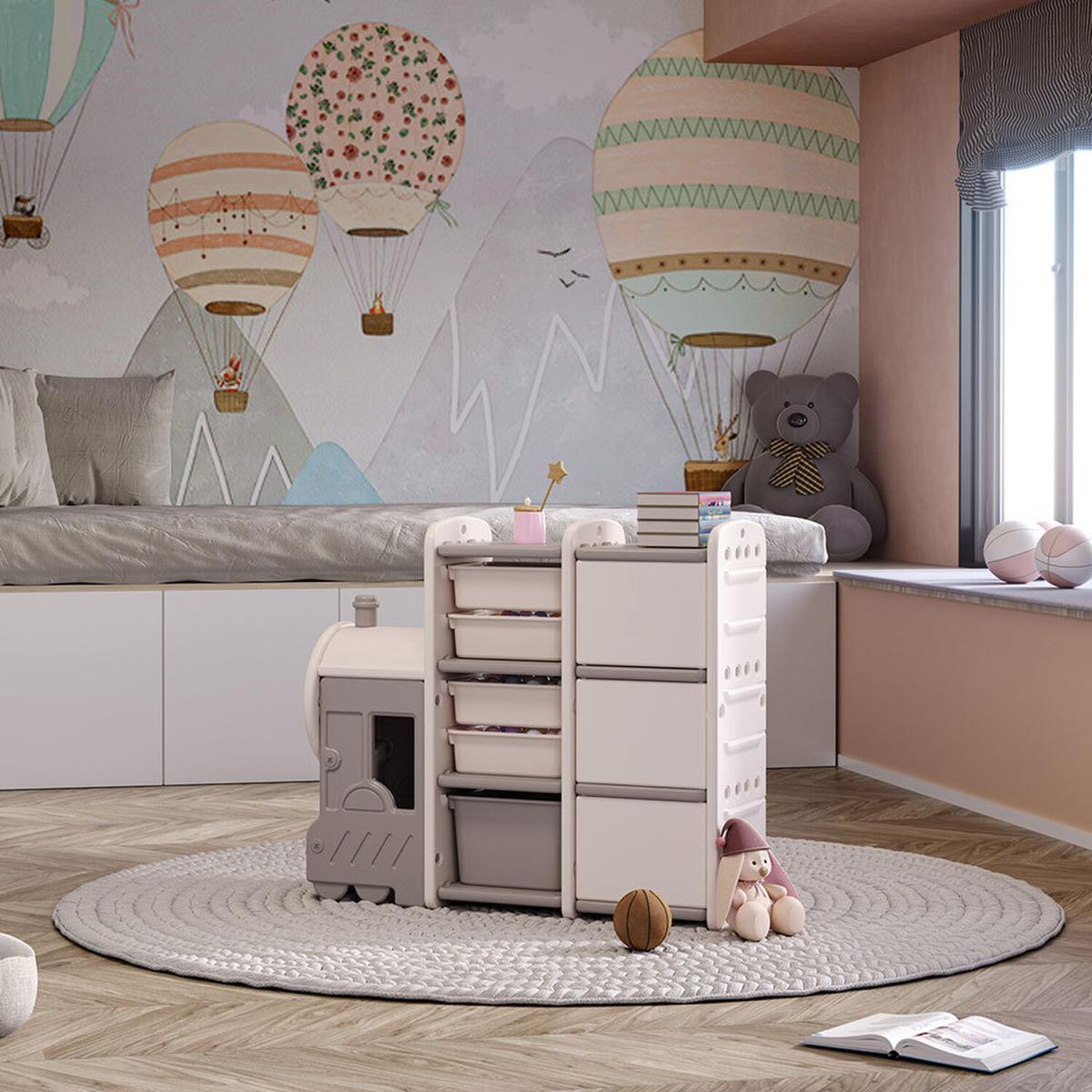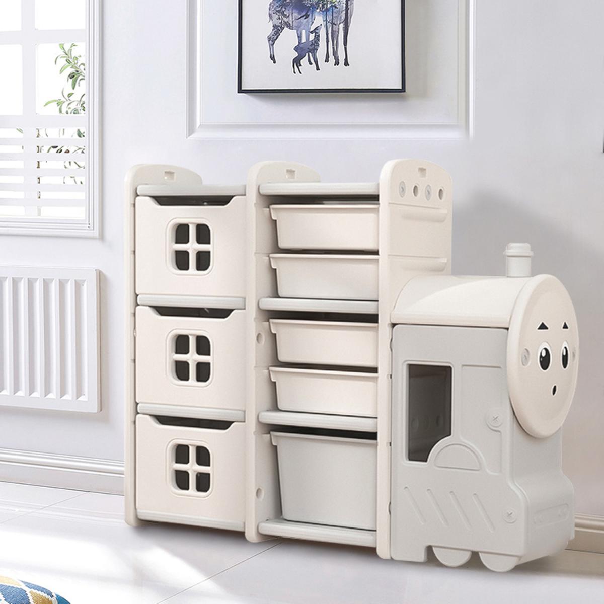 Our multifunctional toy rack is made of high-quality HDPE board, nontoxic and environmentally friendly. The excellent structure has strong stability and can bear a maximum load of 50K G. Rounded corners and no sharp edges are designed to protect children from bumps and scratches. The kids toy storage unit has 5 removable storage bins, 3 privacy cabinets. This toy storage cabinet can provide you with plenty of storage space for toys and books. Cute railway engine toy storage stand unit is attractive to both boys and girls. The height of the storage shelf is suitable for children (96*33*85cm). They can easily pick up their favorite toys and books. It not only a toy storage shelf, but also a very good decoration for the room. Suitable for various occasions such as kindergarten, school, children's room, bedroom and living room.
