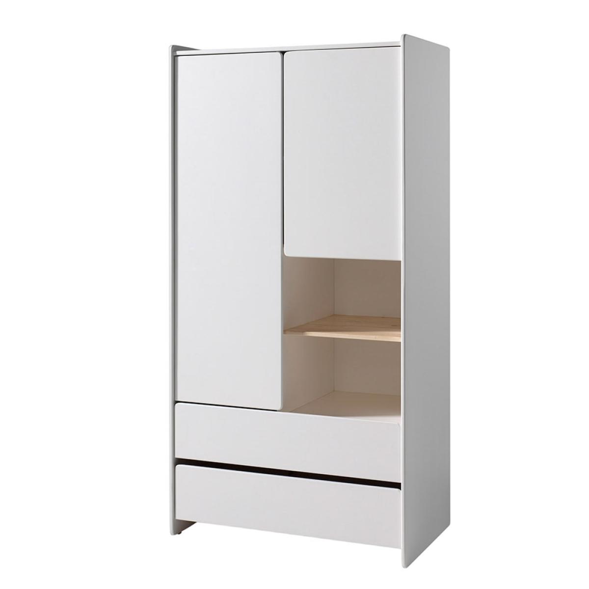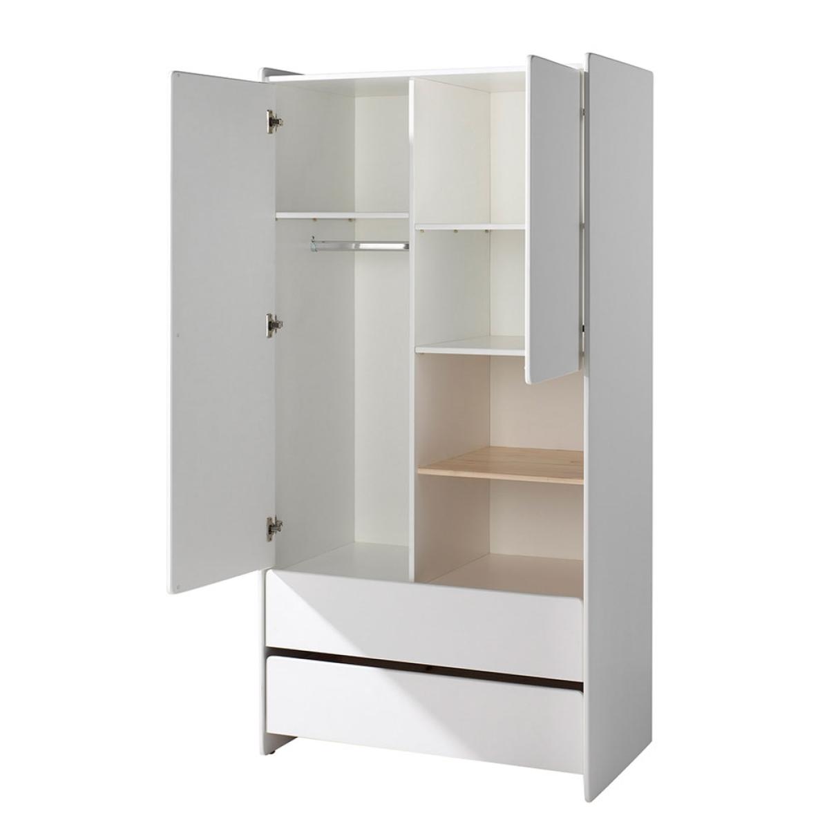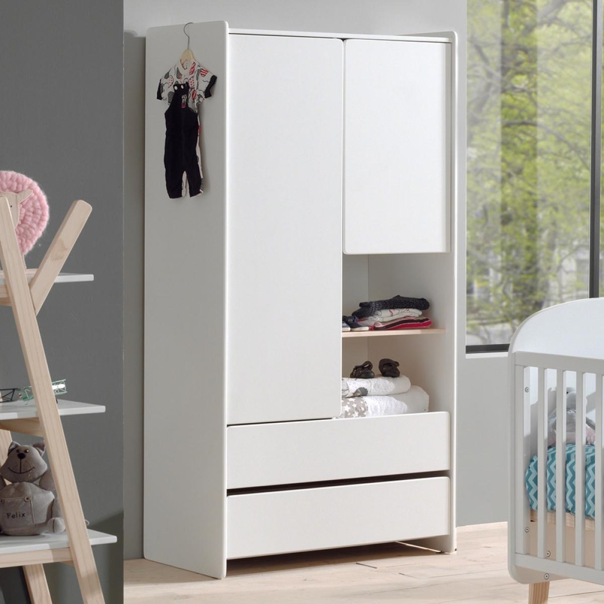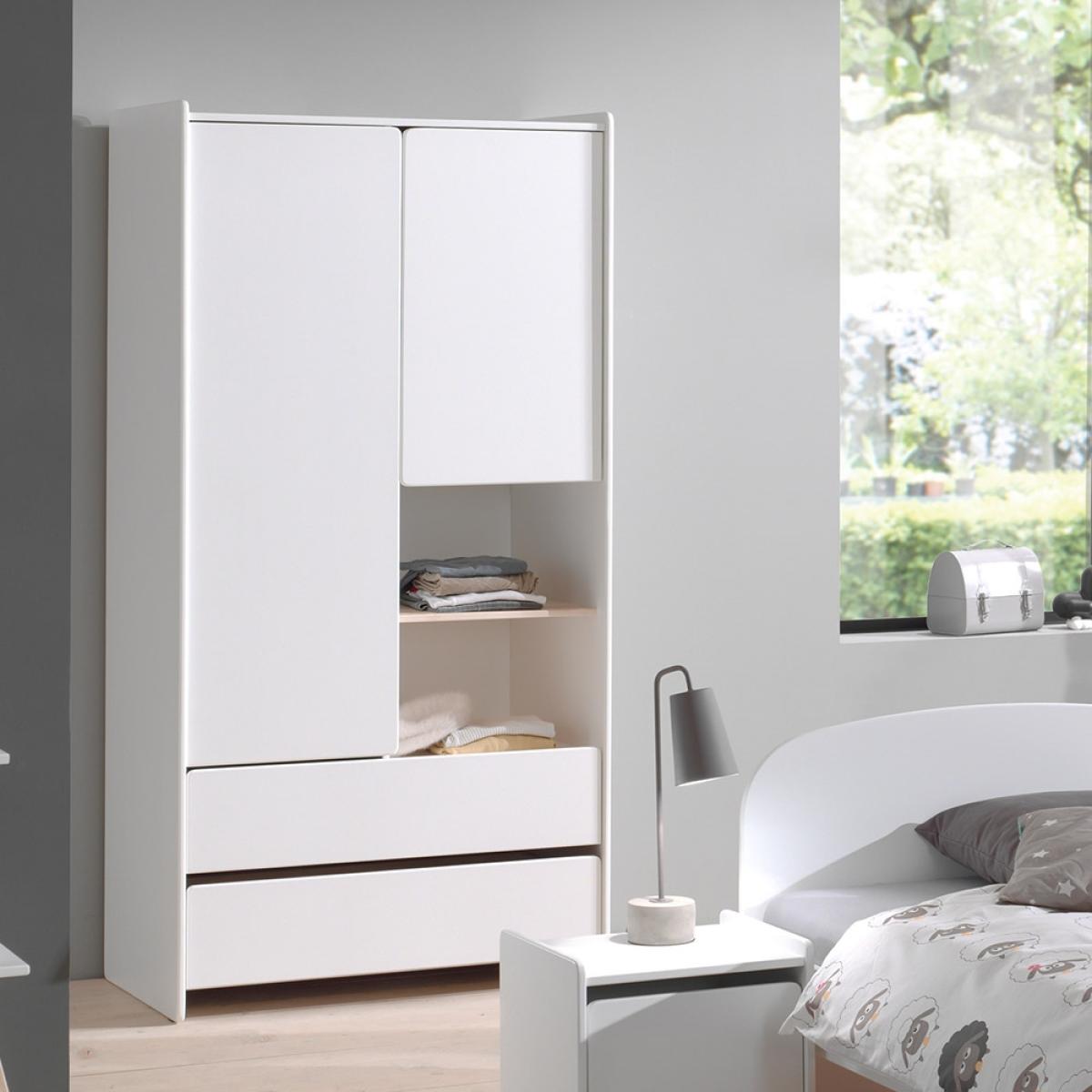 The Kiddy 2 Door Wardrobe, with its simple design and fresh white colour, will have no trouble fitting into your interior style. Manufactured from MDF and solid pine, there's plenty of space for your kiddies clothes in this beauty. With shelves on the right, you can keep those clothes folded to perfection whilst the hanging rail is ideal for keeping those outfits wrinkle free! Whats more, with two drawers beneath there's even more storage for toys and shoes. This wardrobe is the perfect storage solution if you're after contemporary furniture.
