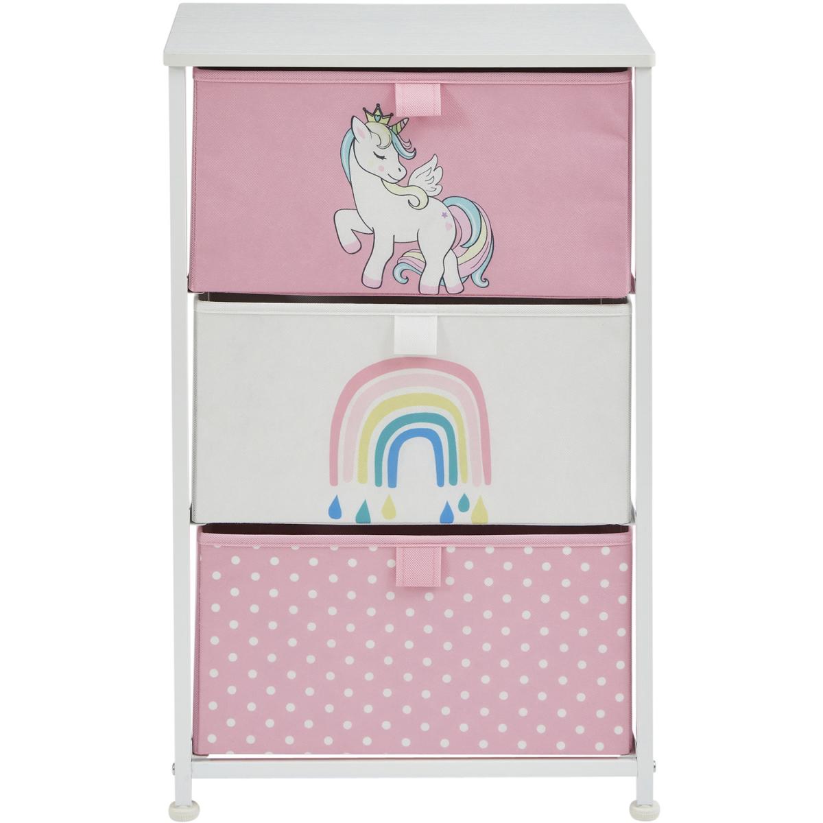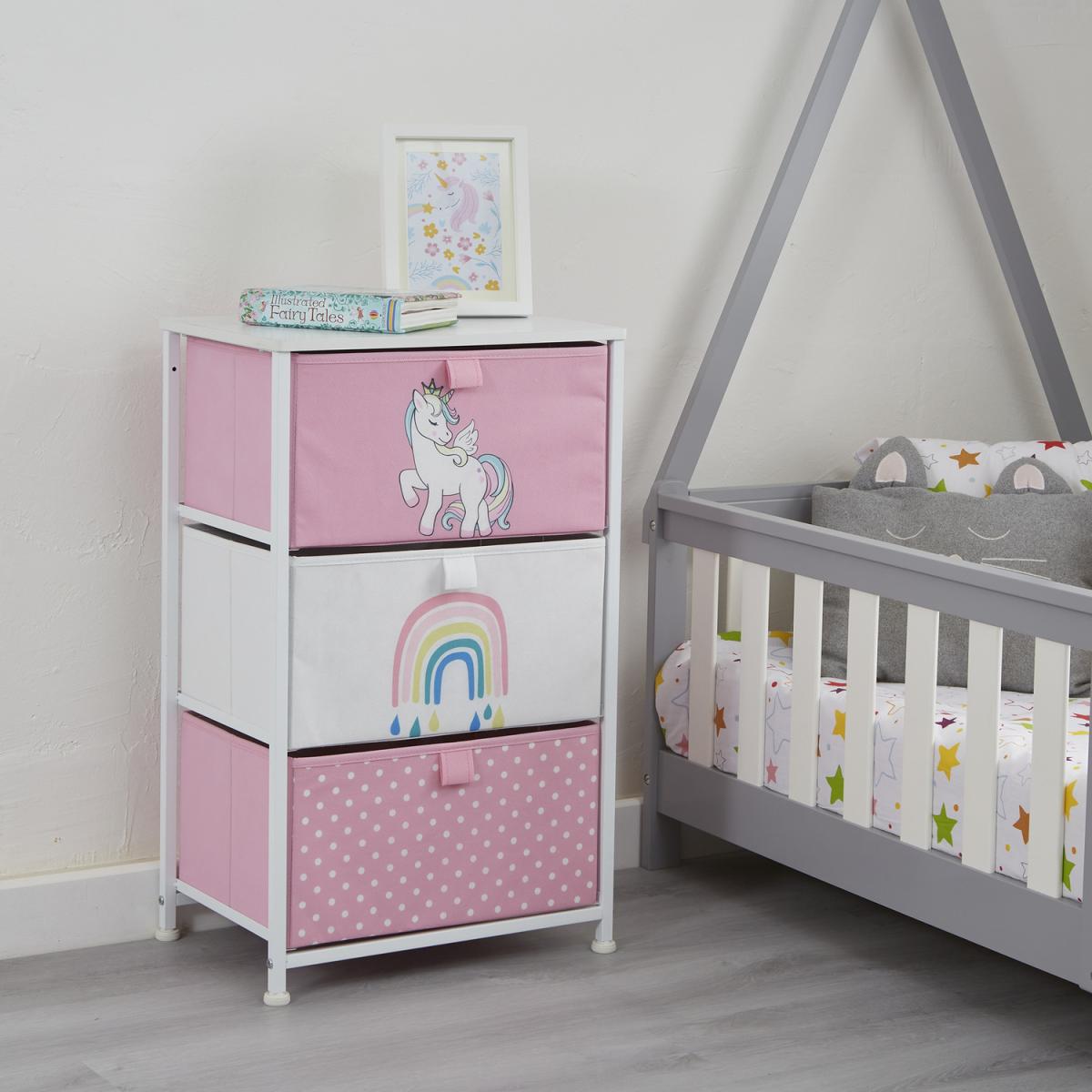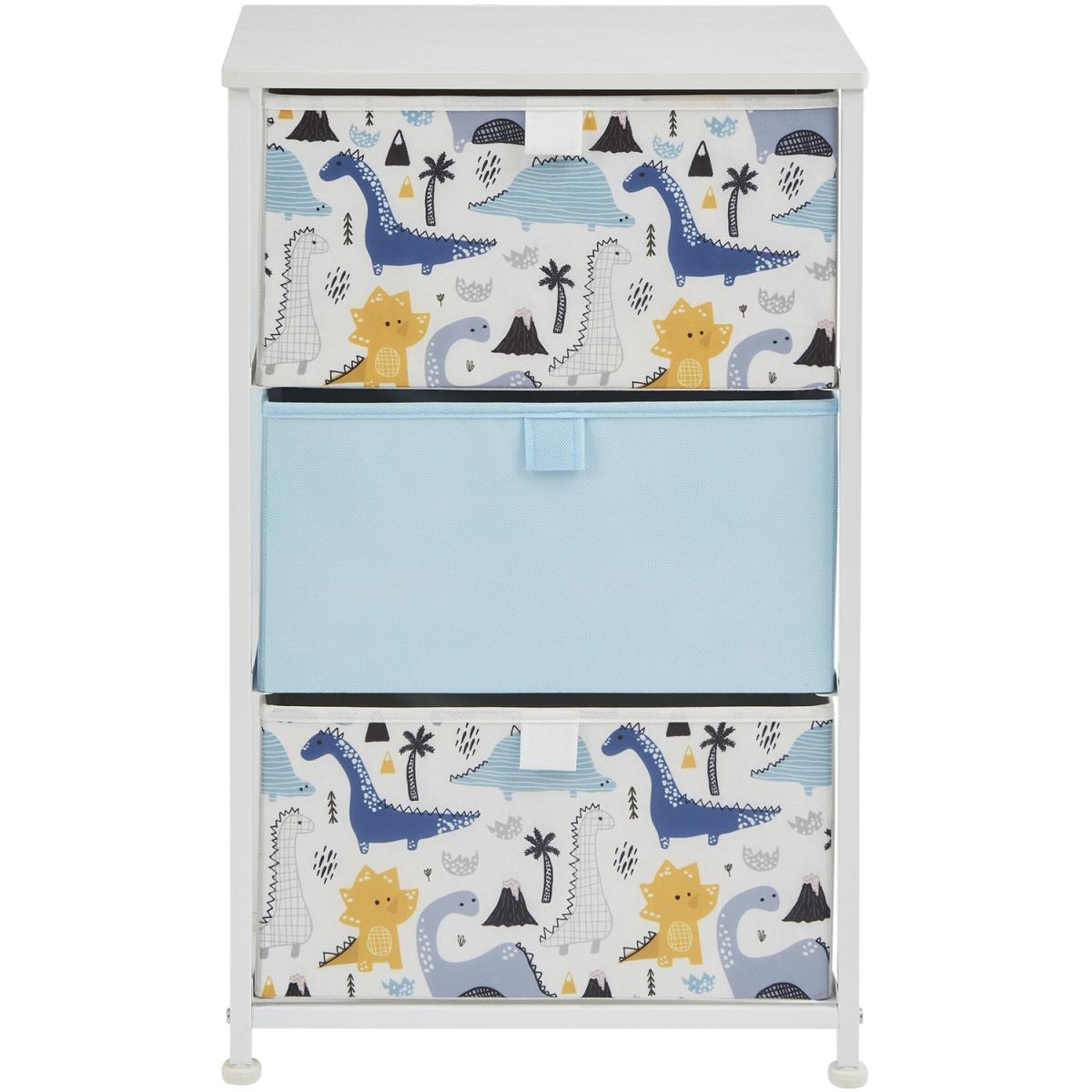 Comes in 3 styles designs dinosaurs, unicorn, and jungle. These adorable storage units come with 3 removable drawers which are great for organising toys and clothes. Alternatively, this could be the perfect nursery furniture, store your babies nappies, blankets, and essentials in this bright drawer unit. Drawers come in modern colours that will match the decor of any room. Drawers simply slide into place and each shelf has a backstop to prevent drawers from sliding out. Drawers are manufactured from breathable non-woven and soft fabric whilst the white wooden top is made from hard-wearing MDF. Our patented frame is manufactured from sturdy white steel and comes with plastic feet to protect floors from scratching. Feet are height adjustable and so uneven floors are not an issue.