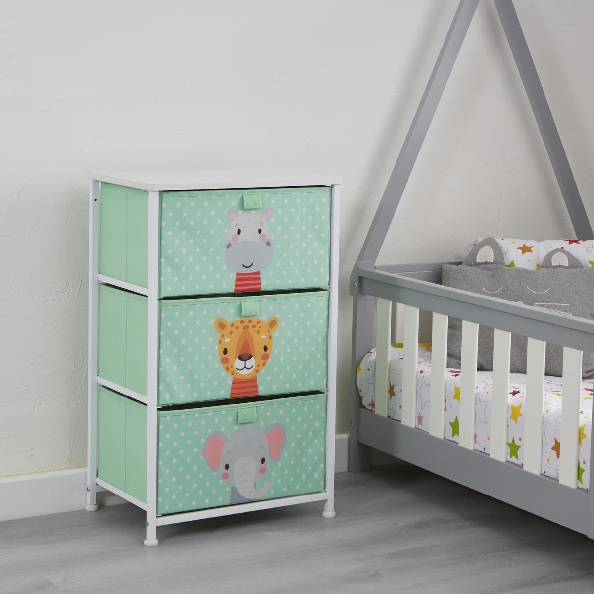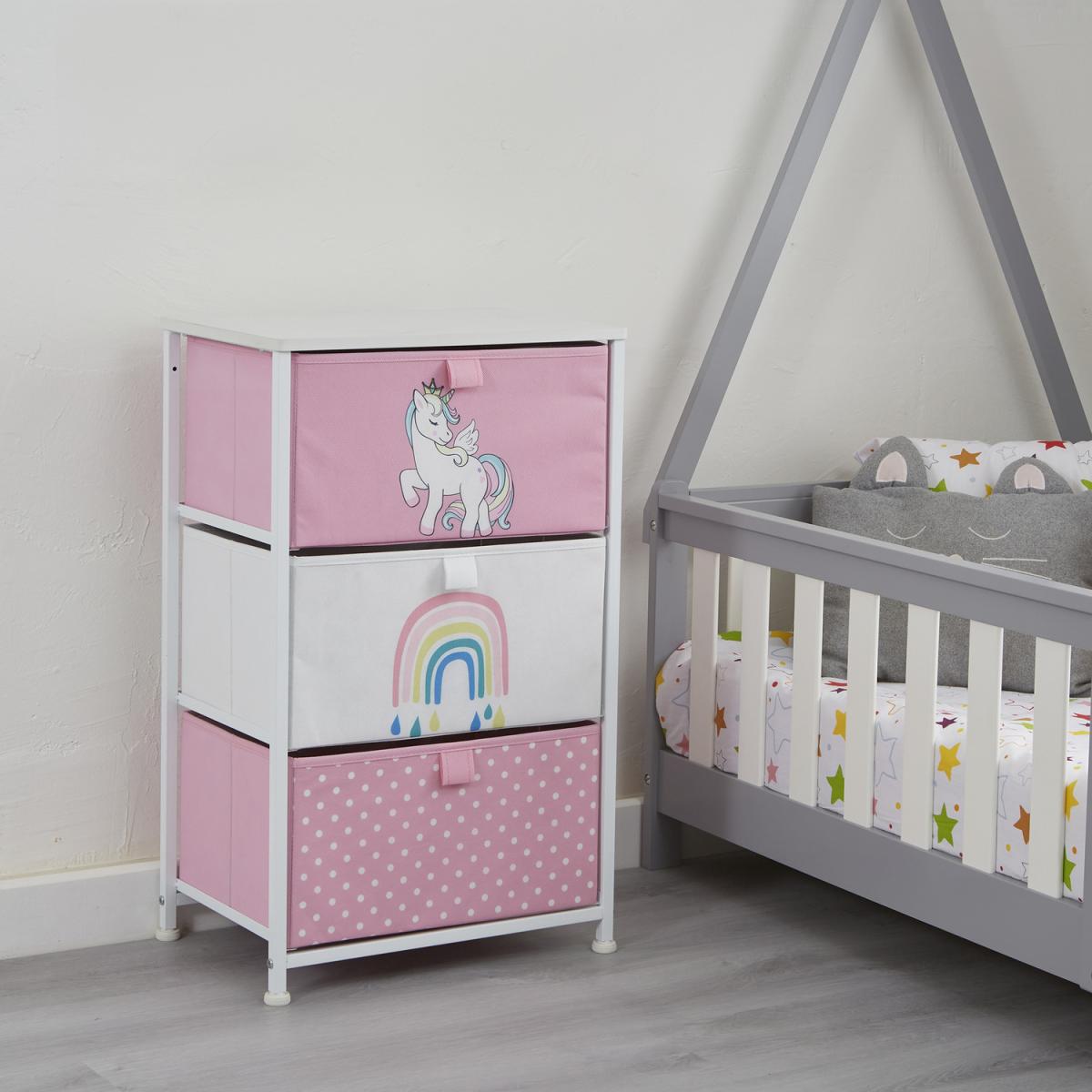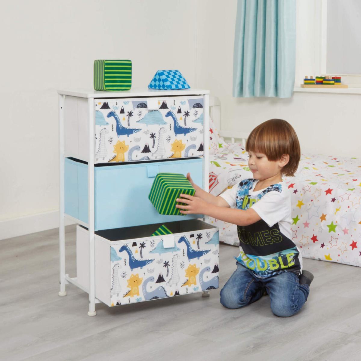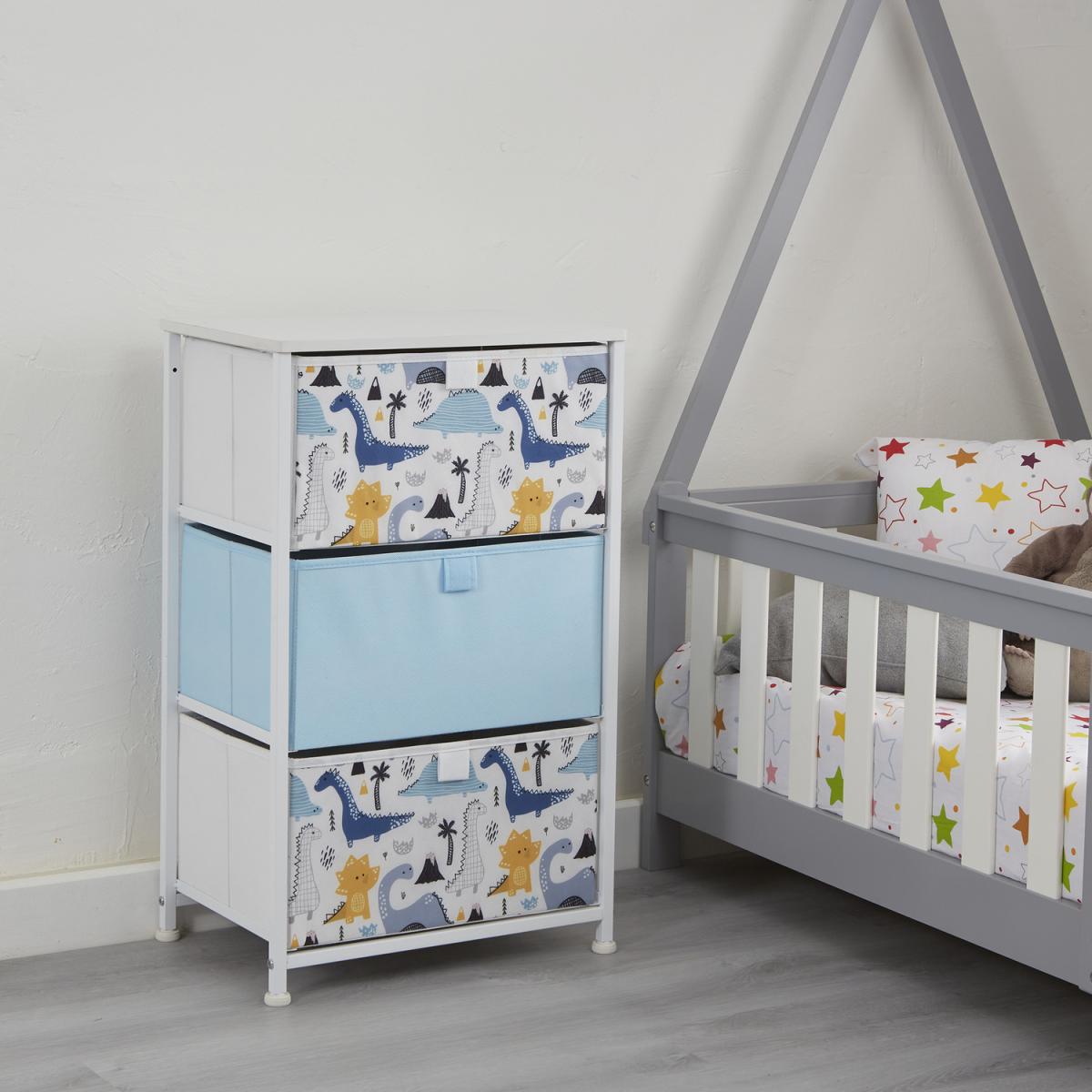 Comes in 3 styles designs dinosaurs, unicorn, and jungle. These adorable storage units come with 3 removable drawers which are great for organising toys and clothes. Alternatively, this could be the perfect nursery furniture, store your babies nappies, blankets, and essentials in this bright drawer unit. Drawers come in modern colours that will match the decor of any room. Drawers simply slide into place and each shelf has a backstop to prevent drawers from sliding out. Drawers are manufactured from breathable non-woven and soft fabric whilst the white wooden top is made from hard-wearing MDF. Our patented frame is manufactured from sturdy white steel and comes with plastic feet to protect floors from scratching. Feet are height adjustable and so uneven floors are not an issue.