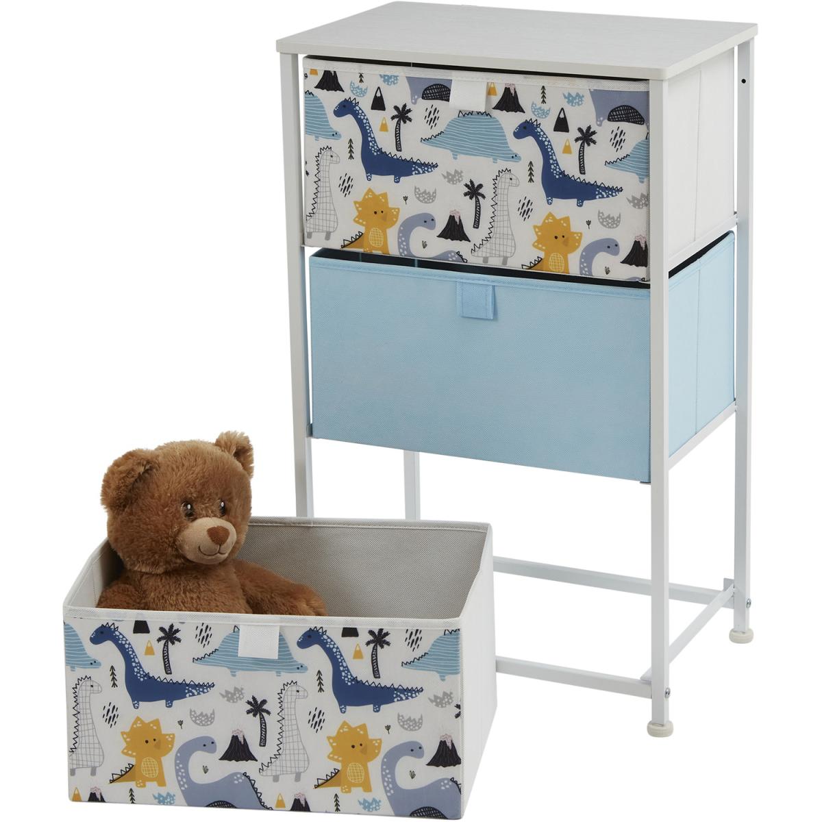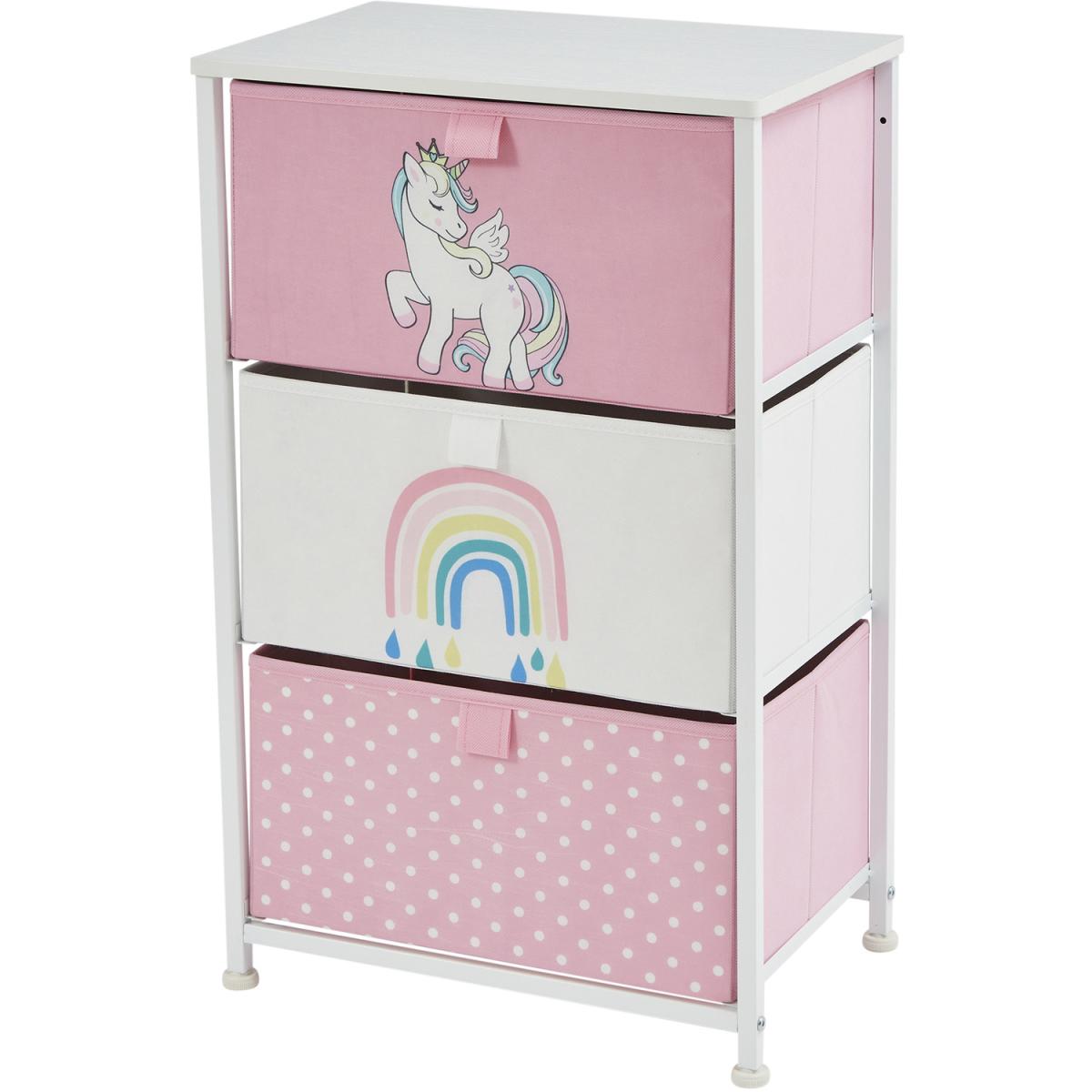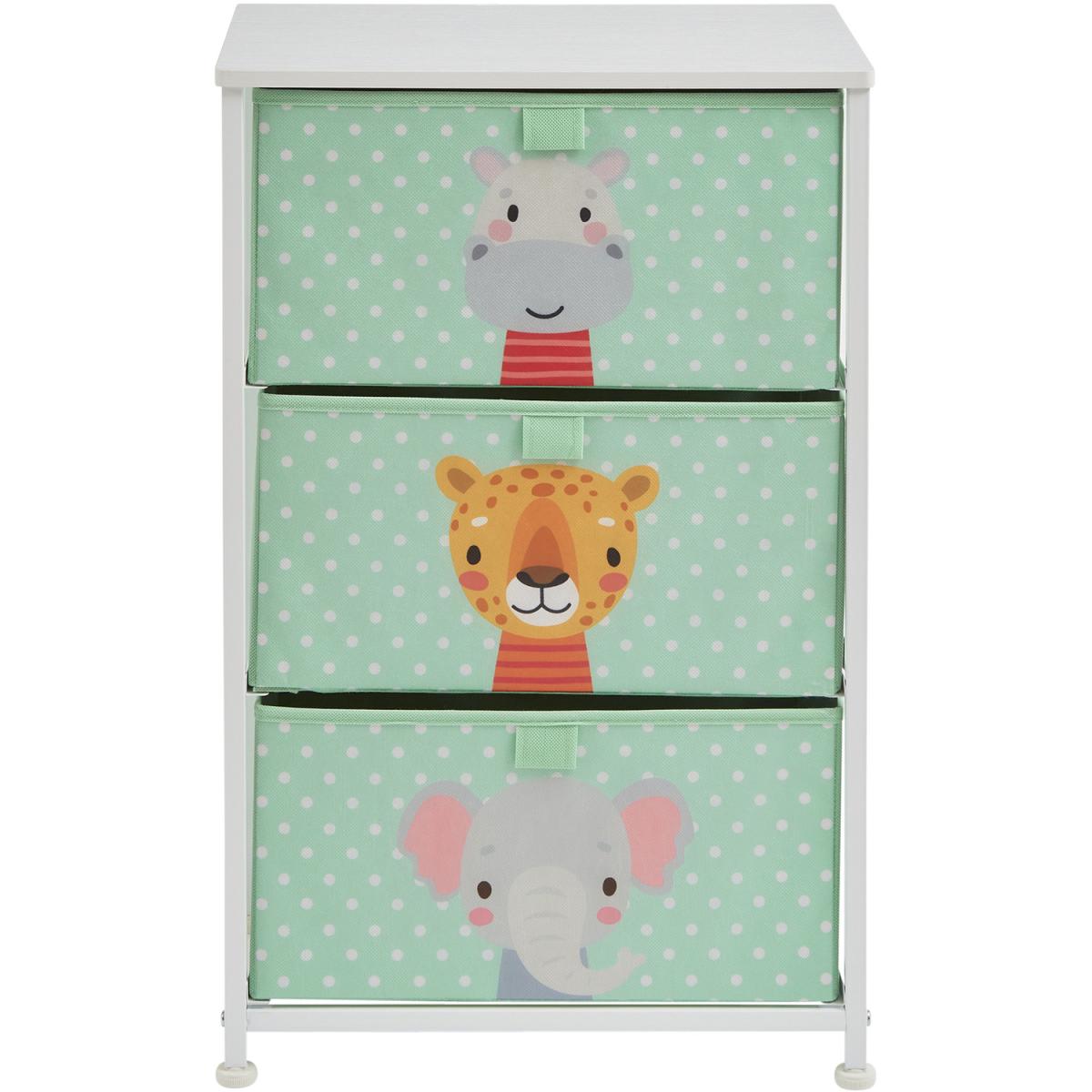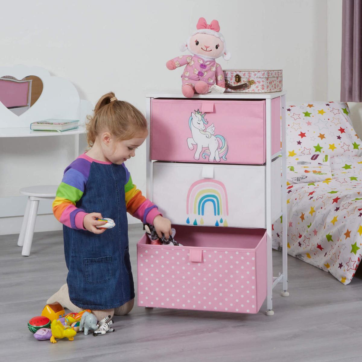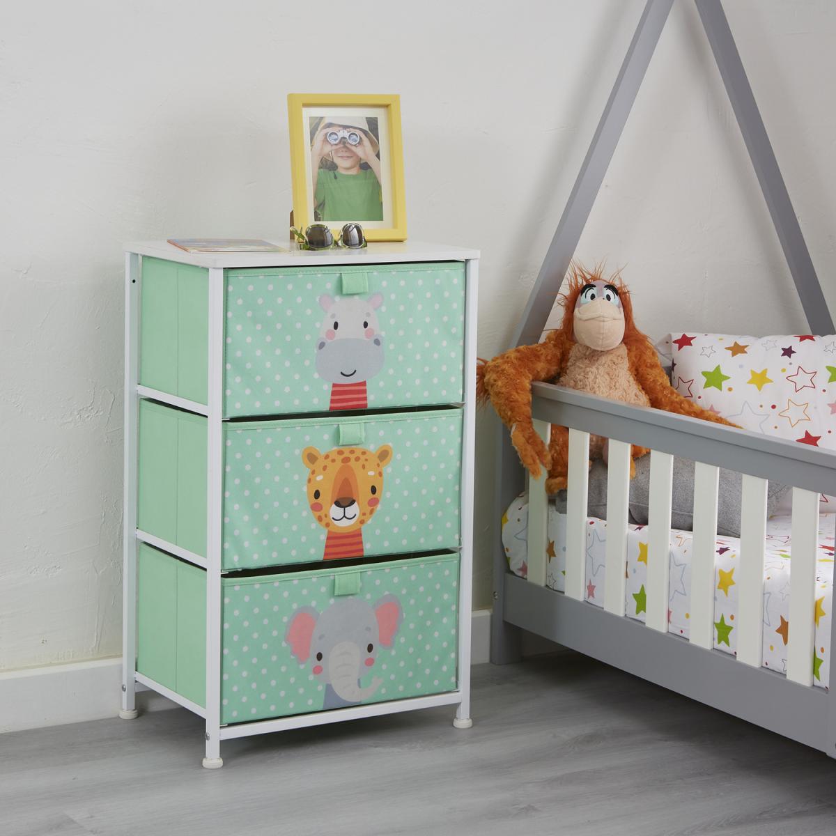 Comes in 3 styles designs dinosaurs, unicorn, and jungle. These adorable storage units come with 3 removable drawers which are great for organising toys and clothes. Alternatively, this could be the perfect nursery furniture, store your babies nappies, blankets, and essentials in this bright drawer unit. Drawers come in modern colours that will match the decor of any room. Drawers simply slide into place and each shelf has a backstop to prevent drawers from sliding out. Drawers are manufactured from breathable non-woven and soft fabric whilst the white wooden top is made from hard-wearing MDF. Our patented frame is manufactured from sturdy white steel and comes with plastic feet to protect floors from scratching. Feet are height adjustable and so uneven floors are not an issue.