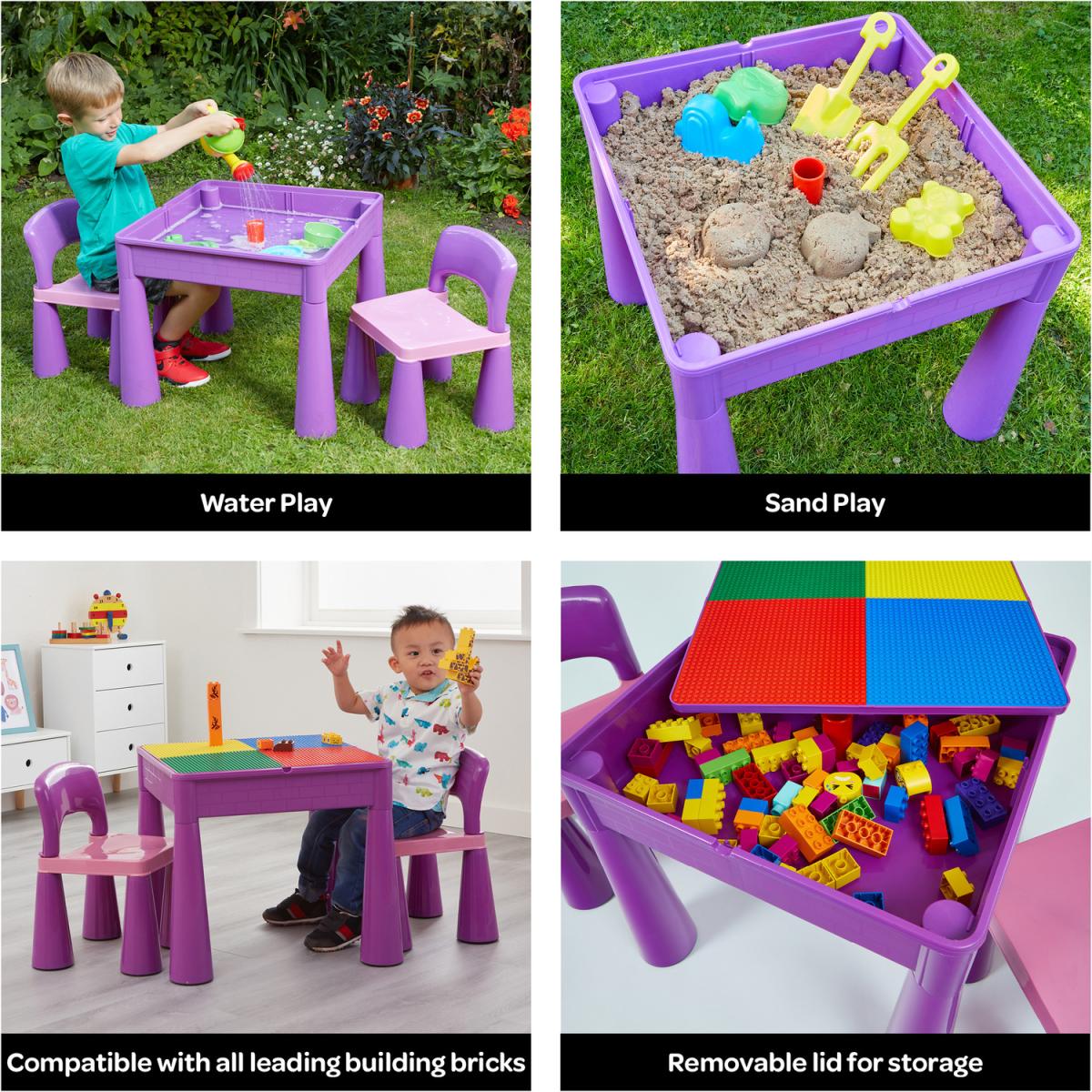 This Kids 5 in 1 Activity Table and 2 Chairs is ideal for ages 2 years and older. The set comes with a reversible tabletop smooth side that is good for writing, eating and playing on. The other side includes a construction tabletop that is compatible with all leading brick brands. The deep base can hold small toys, pens or pencils. Alternatively, it can be used for sand or water play, the table includes a plug in the middle of the table to make cleaning up quick and easy. The set is simple to put together no tools are needed simply click the pieces together. The table, tabletop, plug and chairs are made from non-toxic plastic. The set has been safety tested for durability and stability. This set has trumpet style legs to give additional stability. The whole set is lightweight so can be safely lifted and can be moved indoors or outdoors.