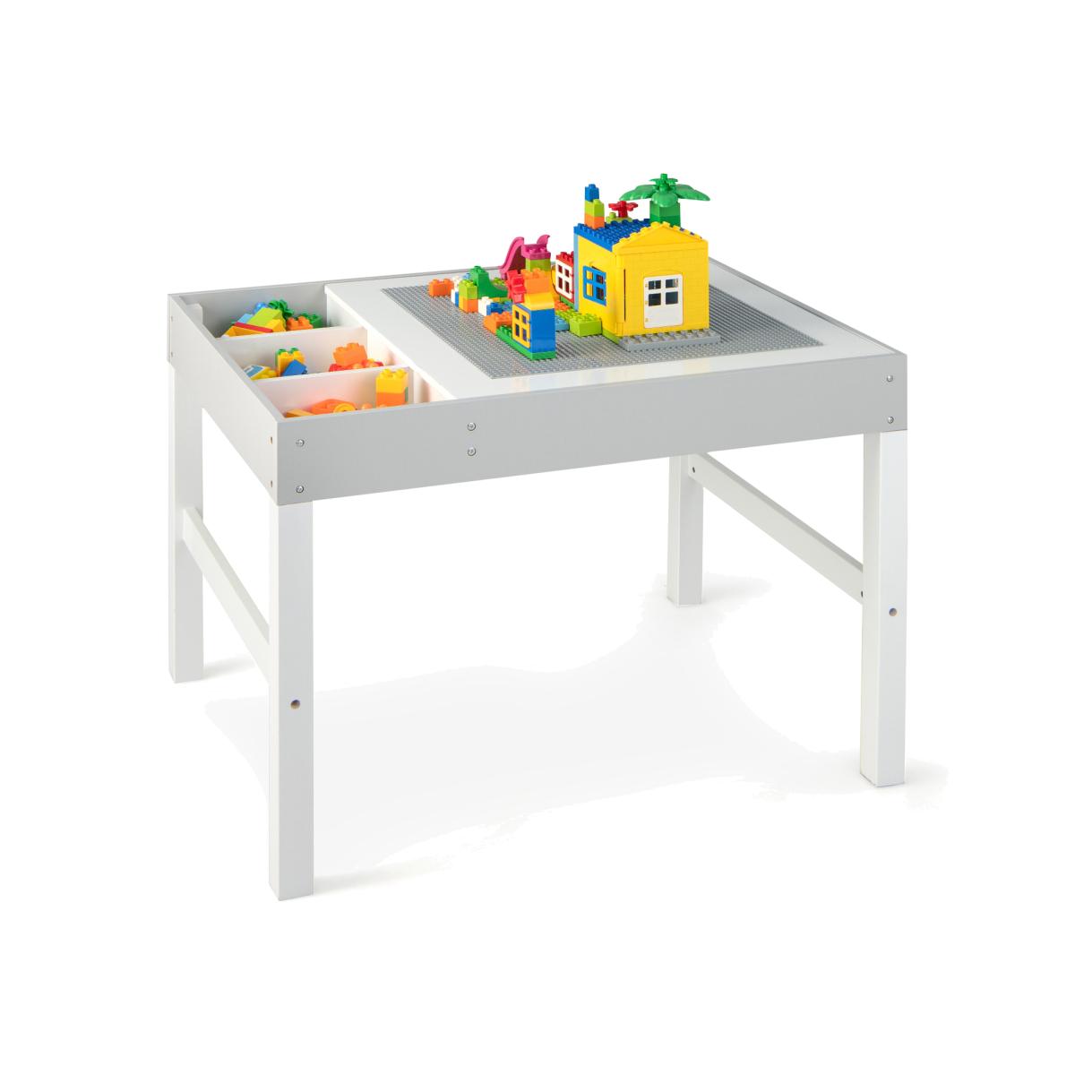 This multifunctional kid's activity table is sure to be a kid's favourite piece of furniture. The 2-in-1 reversible tabletop fulfils kids' playing and studying requirements, and helps to develop children's concentration, hand-eye coordination, imagination and creativity. The small particle building block desktop is designed for stacking blocks, while the smooth desktop offers a wide area for drawing or writing. Plus, when the playtime is over, kids can conveniently remove the lid and store the blocks or drawing tools in the classified storage space, including 1 large compartment and 3 small compartments. What's more, our toddler play table is made of selected wood material, which ensures long-term use and great support. It will be a perfect gift for your little ones and accompany them through a happy childhood.