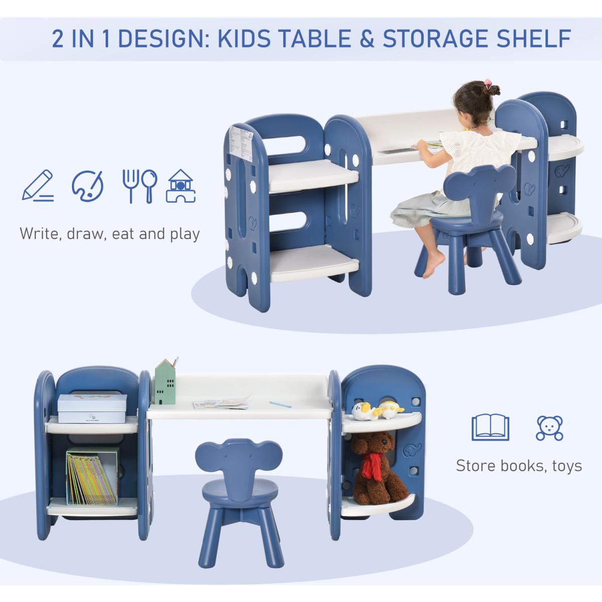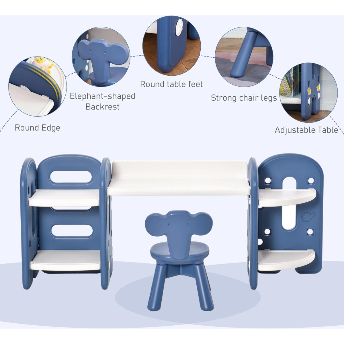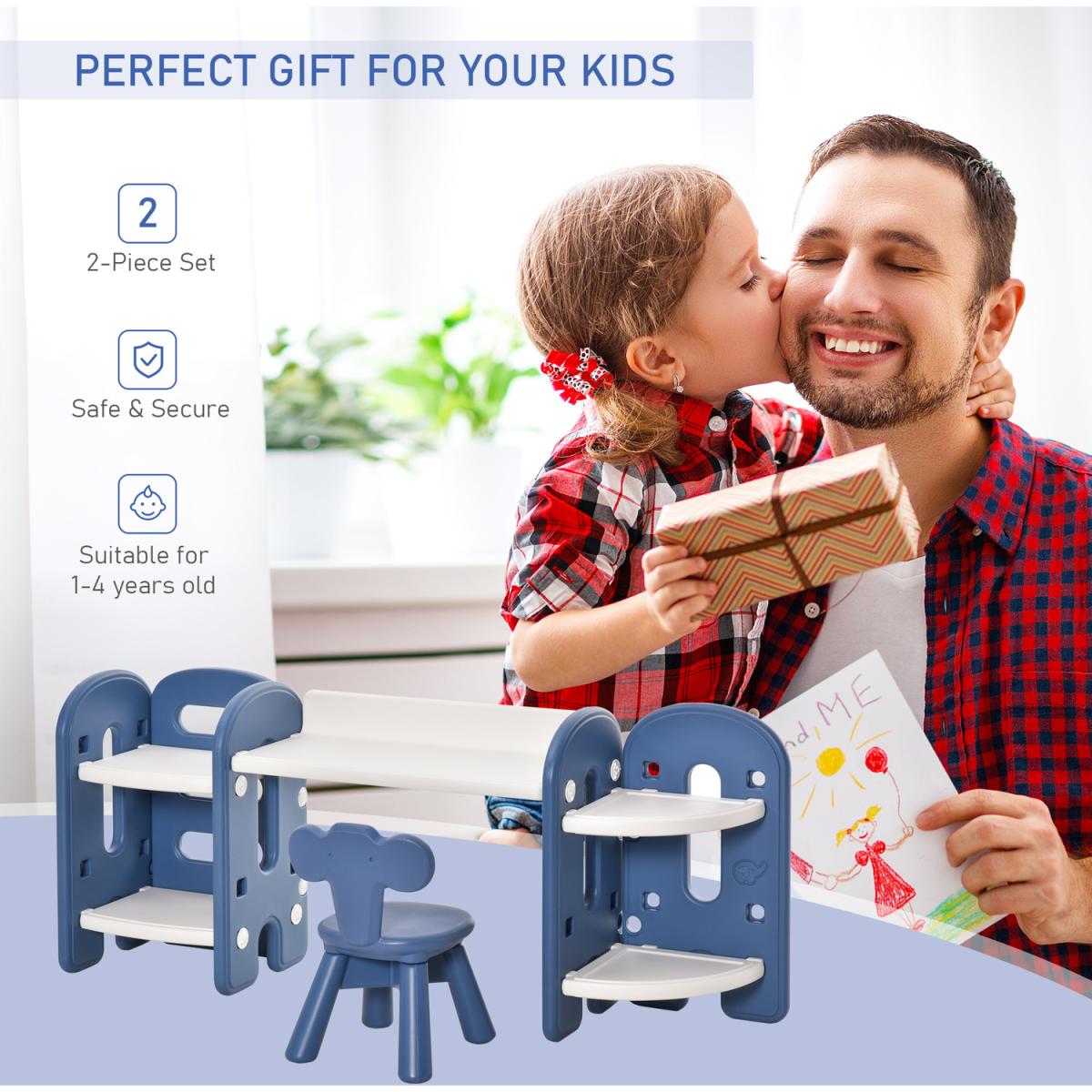 From homework to arts and crafts, this HOMCOM kids table and chair set gives your child a spot of their own. Made with solid and non-toxic polypropylene for a safe and solid structure. The round polishing edge helps prevent your kids from getting injured. Each side of the table is designed with shelves so that your kids can put their toys in order and gain a sense of responsibility and organization. Due to its light weight, you can easily move the table and chair, as well as easily disassemble.