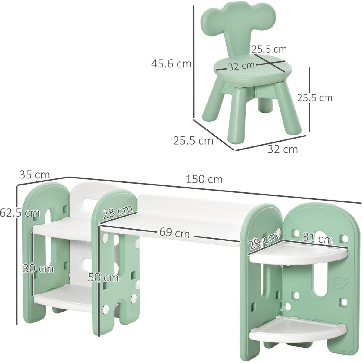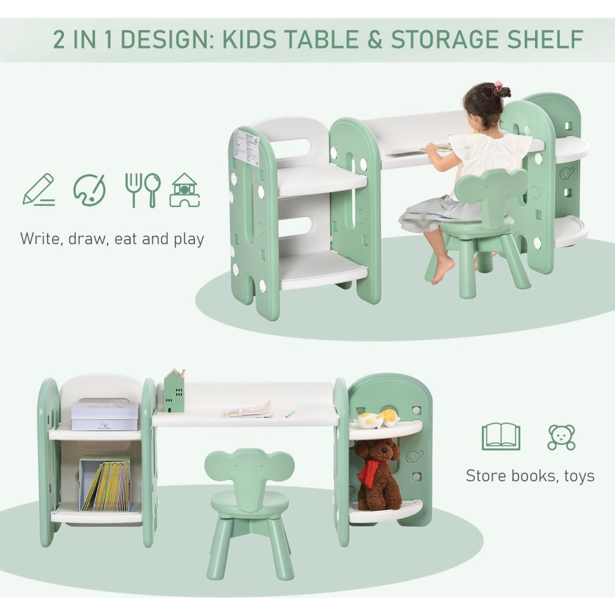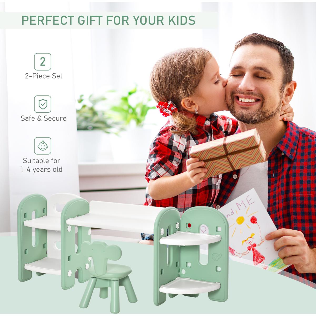 From homework to arts and crafts, this HOMCOM kids table and chair set gives your child a spot of their own. Made with solid and non-toxic polypropylene for a safe and solid structure. The round polishing edge helps prevent your kids from getting injured. Each side of the table is designed with shelves so that your kids can put their toys in order and gain a sense of responsibility and organization. Due to its light weight, you can easily move the table and chair, as well as easily disassemble.