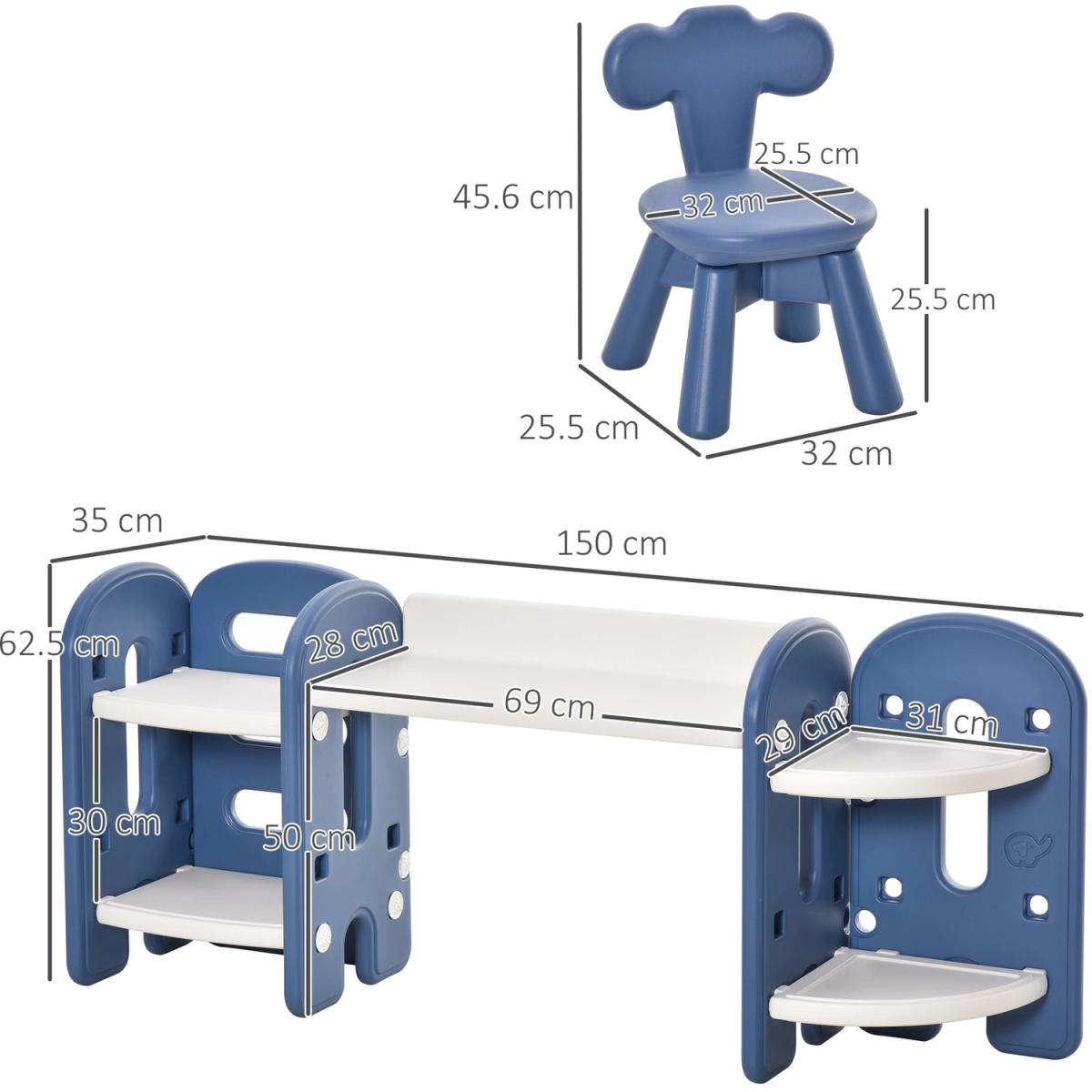 From homework to arts and crafts, this HOMCOM kids table and chair set gives your child a spot of their own. Made with solid and non-toxic polypropylene for a safe and solid structure. The round polishing edge helps prevent your kids from getting injured. Each side of the table is designed with shelves so that your kids can put their toys in order and gain a sense of responsibility and organization. Due to its light weight, you can easily move the table and chair, as well as easily disassemble.