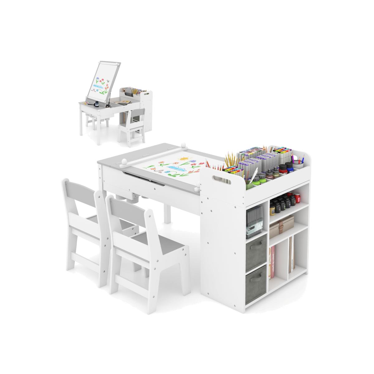 Encourage your child's creativity with this versatile kids art table set, a perfect activity center for drawing, crafting, and more. Featuring a flip-up tabletop that transforms into an easel and various storage compartments, this table organizes art supplies efficiently. The integrated paper roll dispenser offers endless creativity, with a roll of paper included for immediate use. Safety is prioritized with this EN71 compliant kids desk and chairs set, ensuring a sturdy and safe workspace.