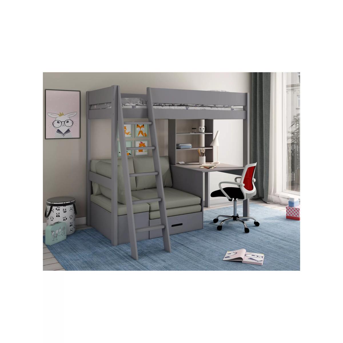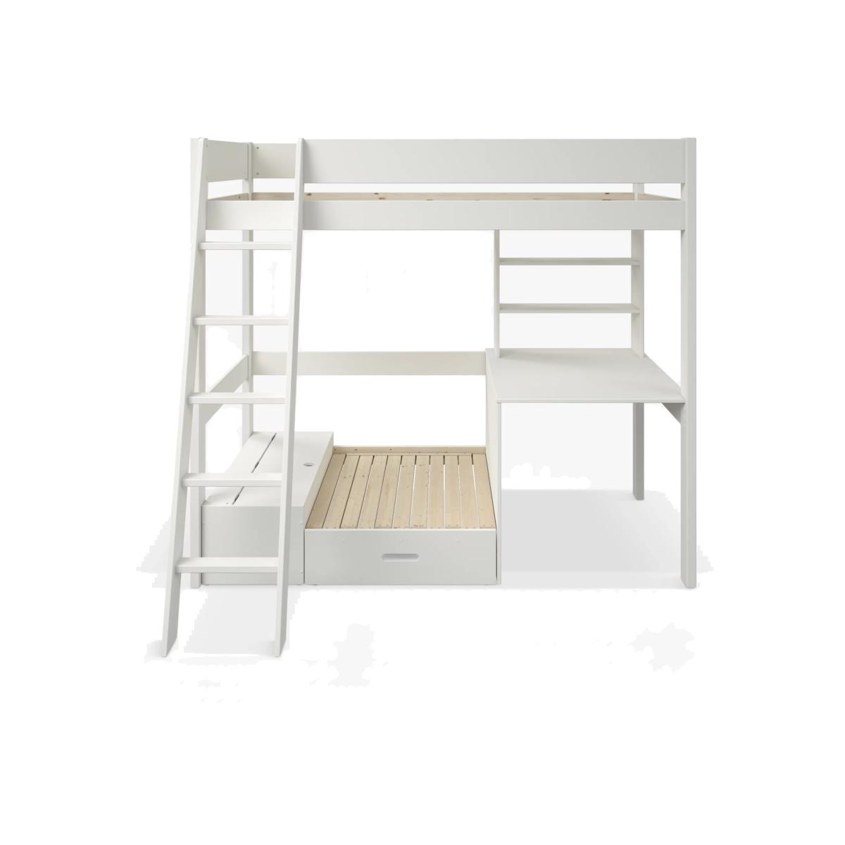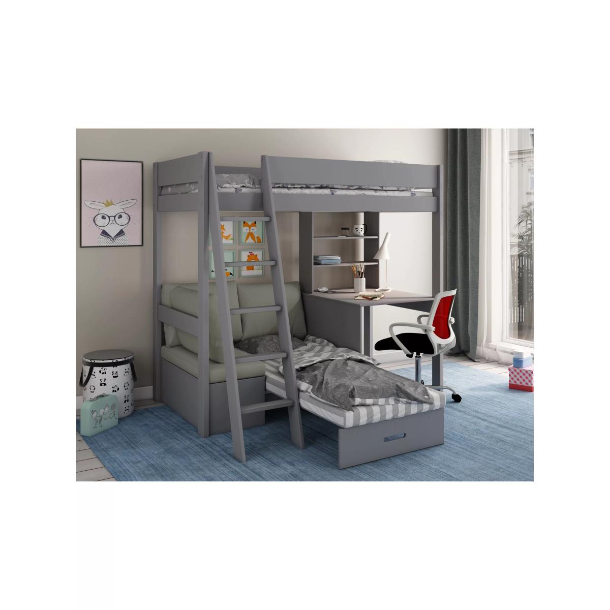 The Kids Avenue Estella 4 High Sleeper Bed is a fantastic new addition to the Estella range and is made from pinewood. The design features a ladder that can be fitted either to the left or right, depending on the layout of your bedroom and takes a standard UK-sized single mattress. The Estella 4 High Sleeper comes with a built-in desk and shelving unit as well as a pull-out bed, storage box and futon. This bed also features a hidden storage box which is located underneath the corner sofa, which is great for storing away books or additional bedding.