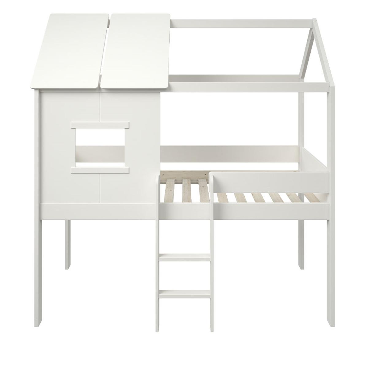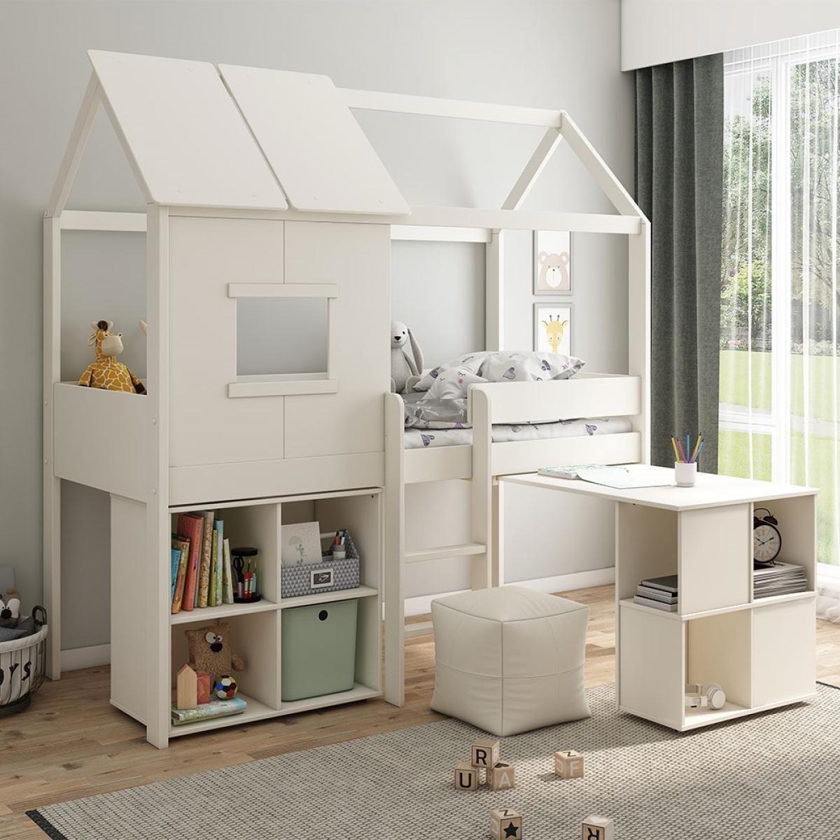 The bed all kids dream of - the Kids Avenue Midi Playhouse Bed with Desk & Cube has everything on their checklist! A bookcase, pull-out desk, a wooden canopy with peek-a-boo window and a crawl space?! Check, check and double check! The cabin bed doubles up as a playhouse in the daytime. Kiddies will love climbing up to their den to relax, play and read their favourite stories from the cube bookcase! Encouraging creativity, the pull-out desk becomes a crafting corner. Fill the hidden storage compartments and shelves with art materials, and your kiddies will make sure your fridge is never without artwork! With space to spare behind the desk and storage, kiddies can crawl through to peek between the staircase or use the extra room to store larger toys! Finished in white - style with bedding, fairy lights and removable decals and surprise your little one to the 3 in 1 play house bed!.