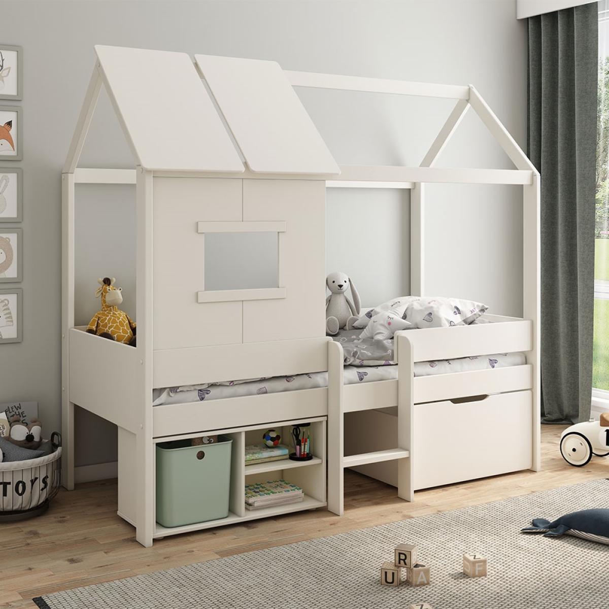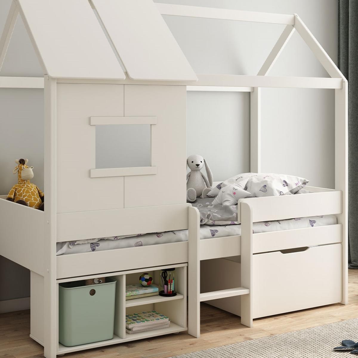 The Kids Avenue Mini Playhouse Bed with Storage will score top marks with your tots! As soon as they wake up, their bed is ready for a day of play! Kiddies can rummage through the pull-out toy box and shelves to find their favourites and then climb the central ladder to play house under the wooden canopy! Peek-a-boo! They'll love poking out of the windows and roof. Move out the underbed storage to create a cosy crawl space for reading and hiding out. And after a fun-filled day, they can snuggle up in their European single bed. Style with twinkling fairy lights or glow in the dark decals and they'll feel like they're camping out under the stars! Finished in white, the Mini Playhouse Bed is ready to be personalised to fit any theme!.