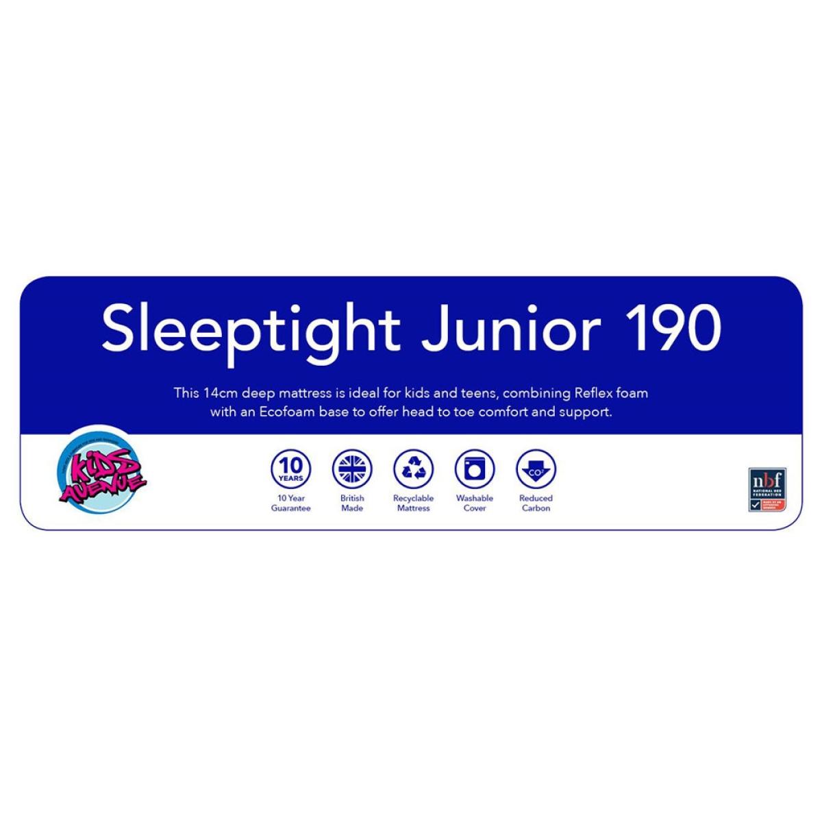The Sleeptight Junior Sprung Mattress is ideal for. Cabin. , mid and high sleeper beds  as it maximises safety without compromising comfort. It features a supportive Ecofoam and Reflex foam layers and fibre fillings. It's finished in a soft cotton mix all over fabric for comfort.