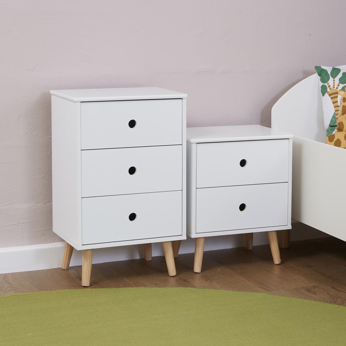 These compact and stylish storage cabinets add elegant simplicity to your kids bedroom or playroom. Ideal as bedside cabinets or multipurpose kids drawers for clothes, toys and any other smaller accessories that can clutter the bedroom or playroom. With solid wood feet and sliding white doors these units will look so cute and the child friendly design and height will even encourage your children to join in during tidy up time.