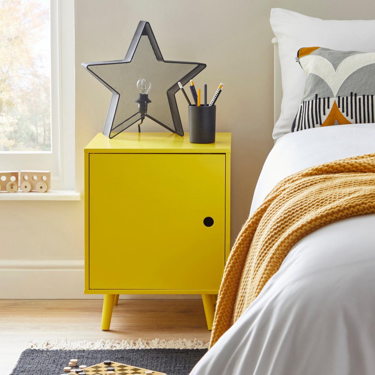 I love this mustard bedside cube for its vibrant colour and simple, modern silhouette. It works particularly well in contemporary or eclectic interiors, bringing a pop of colour to neutral schemes or complementing other bold hues. Its compact size makes it perfect for children's rooms or cosy bedrooms, providing practical storage without sacrificing style. To style it effectively, consider pairing it with decorative lamps, playful accessories, or colourful bedding to create a lively, coordinated look. The clean lines and cheerful tone make it a versatile piece that can easily be integrated into various design themes while adding a cheerful touch to the space.