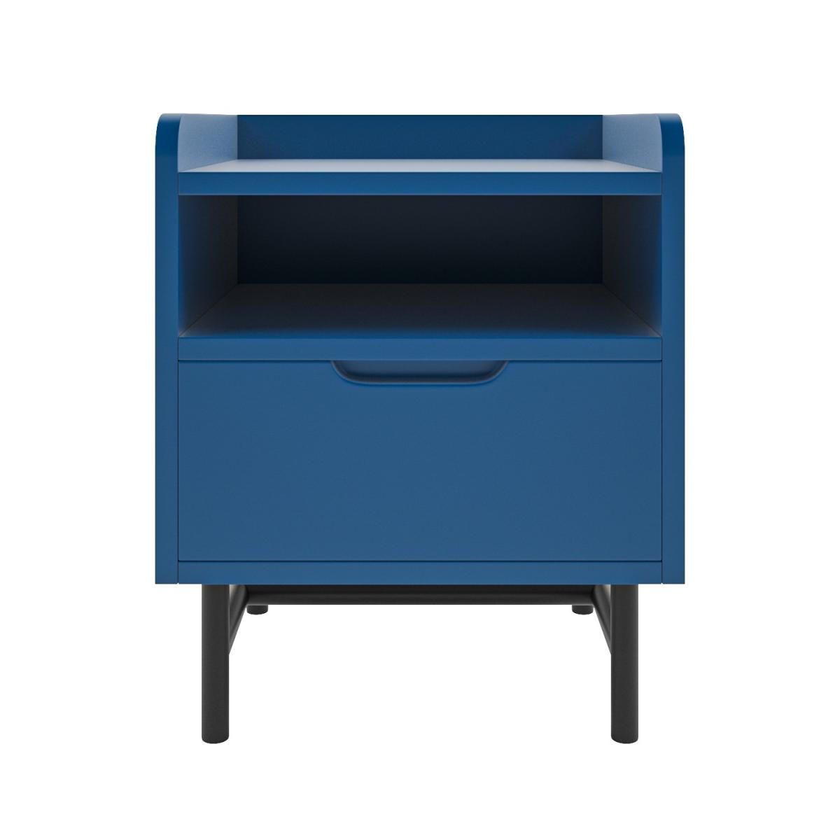 Refresh your growing child's bedroom with the Rueben bedside table. It features a shelf and a drawer, with a collar around the top to keep essentials from being knocked off. Black metal legs contrast with lacquered blue for a modern finish. Also available in green and yellow.
