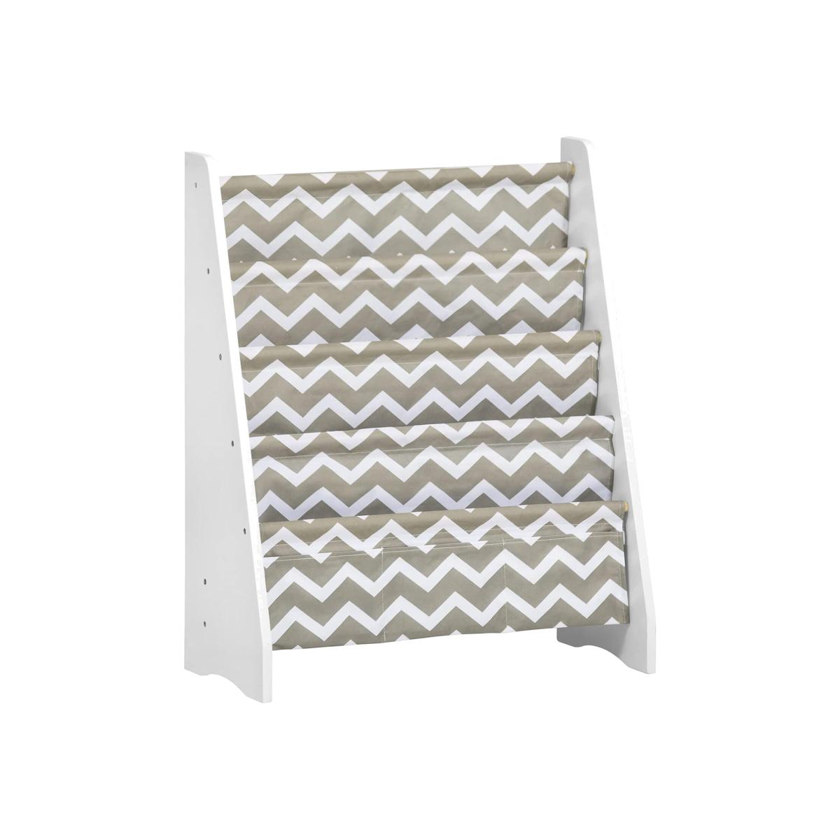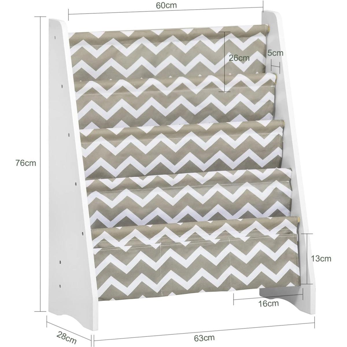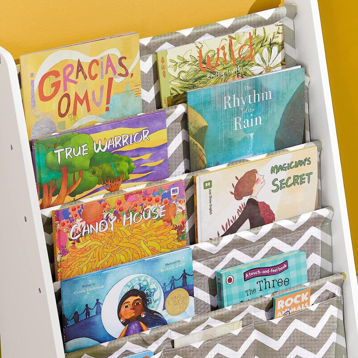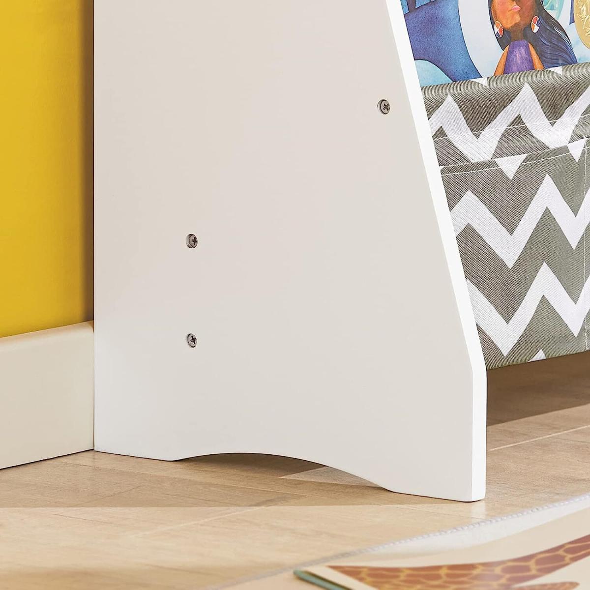 Modern design storage shelf is perfect for childrens room and living room.4 shelves provide ample storage space for the books, toys, etc.3 pockets on the bottom tier provide additional storage space for you. The sturdy MDF frame is connected with 5 strong pine wood cross bars which hold the durable polyester fabric. Durable fabric keep books from being damaged, flexible for books of varying size and thickness. Suitable for children ages 3 and up, promotes organisation and reading skills. Space saving and easy installation, good choice for organizing books.