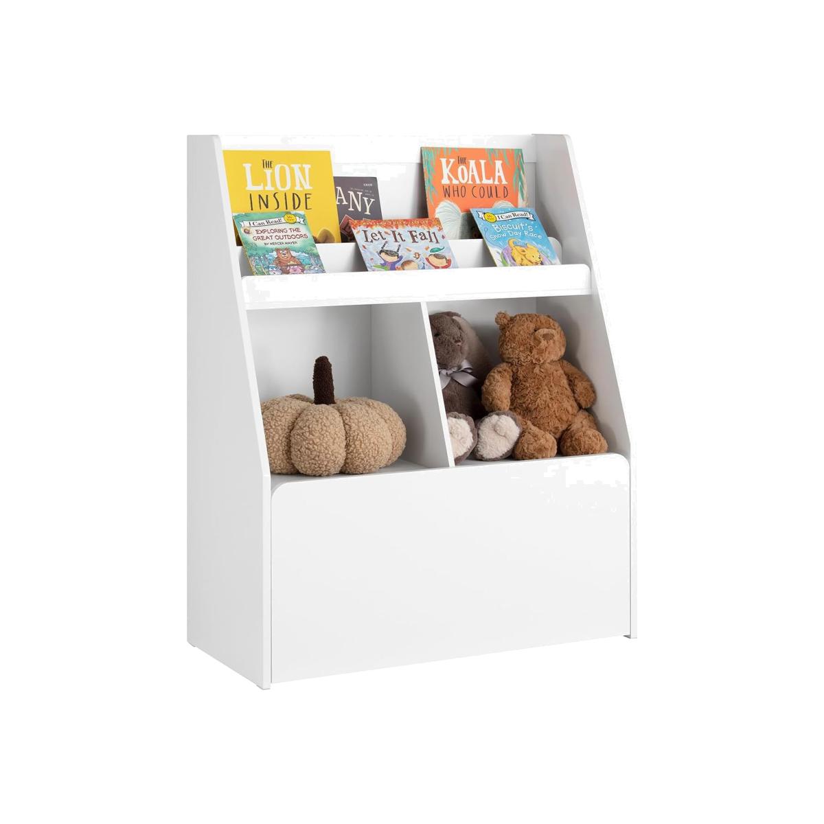 Modern design children storage shelf will blend perfectly with any decor. An ideal addition to any playroom and childrens room. 2 shelves on the top are ideal for storing books. 2 open compartments offer enough storage space for books and toys. The large-capacity storage chest also provides ample storage space for the toys, books and the other items. There are 4 wheels under the storage chest, easy to move. It can be pulled out completely as a great storage solution. Suitable for children ages 3 and up, it can help your kids develop a good habit of organizing. Sturdy wood with environmental protection paint and the anti-tipping device, ensure good stability and safety, an ideal choice for daycare, classroom and children's room.