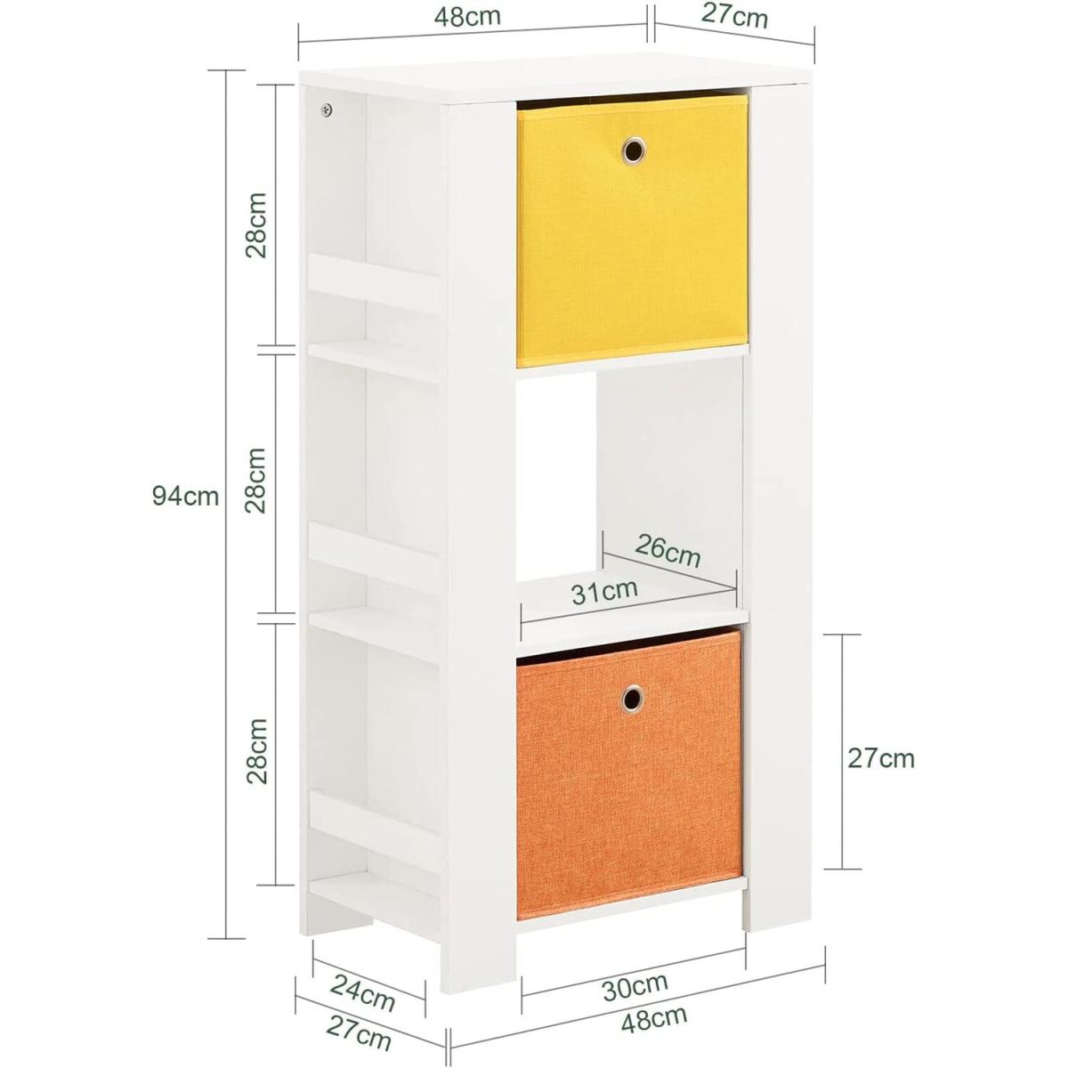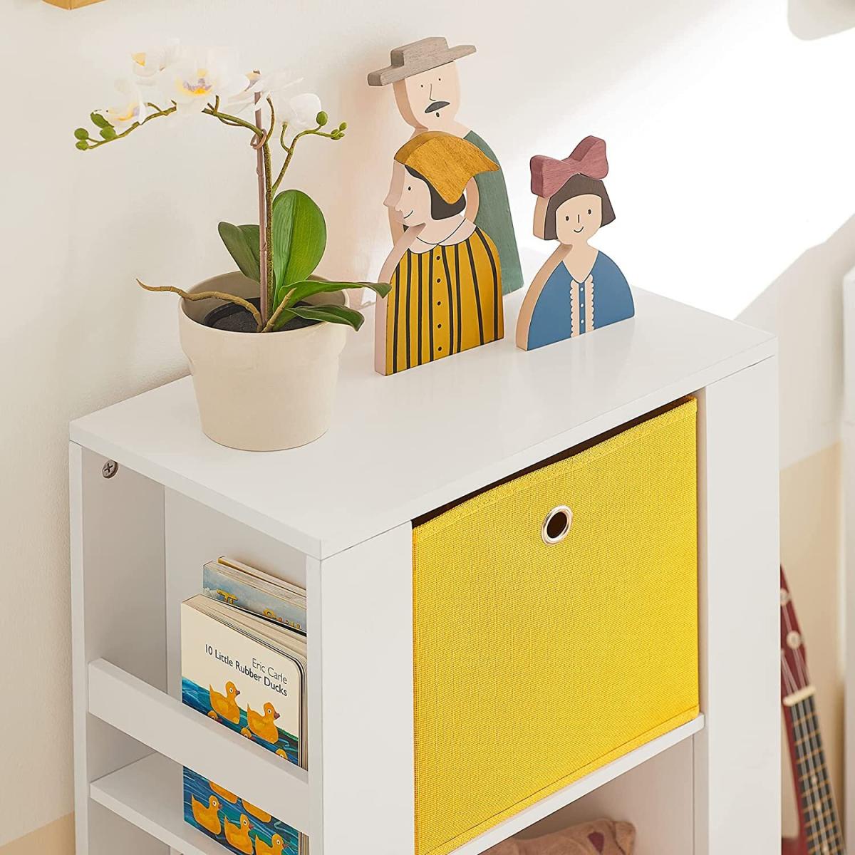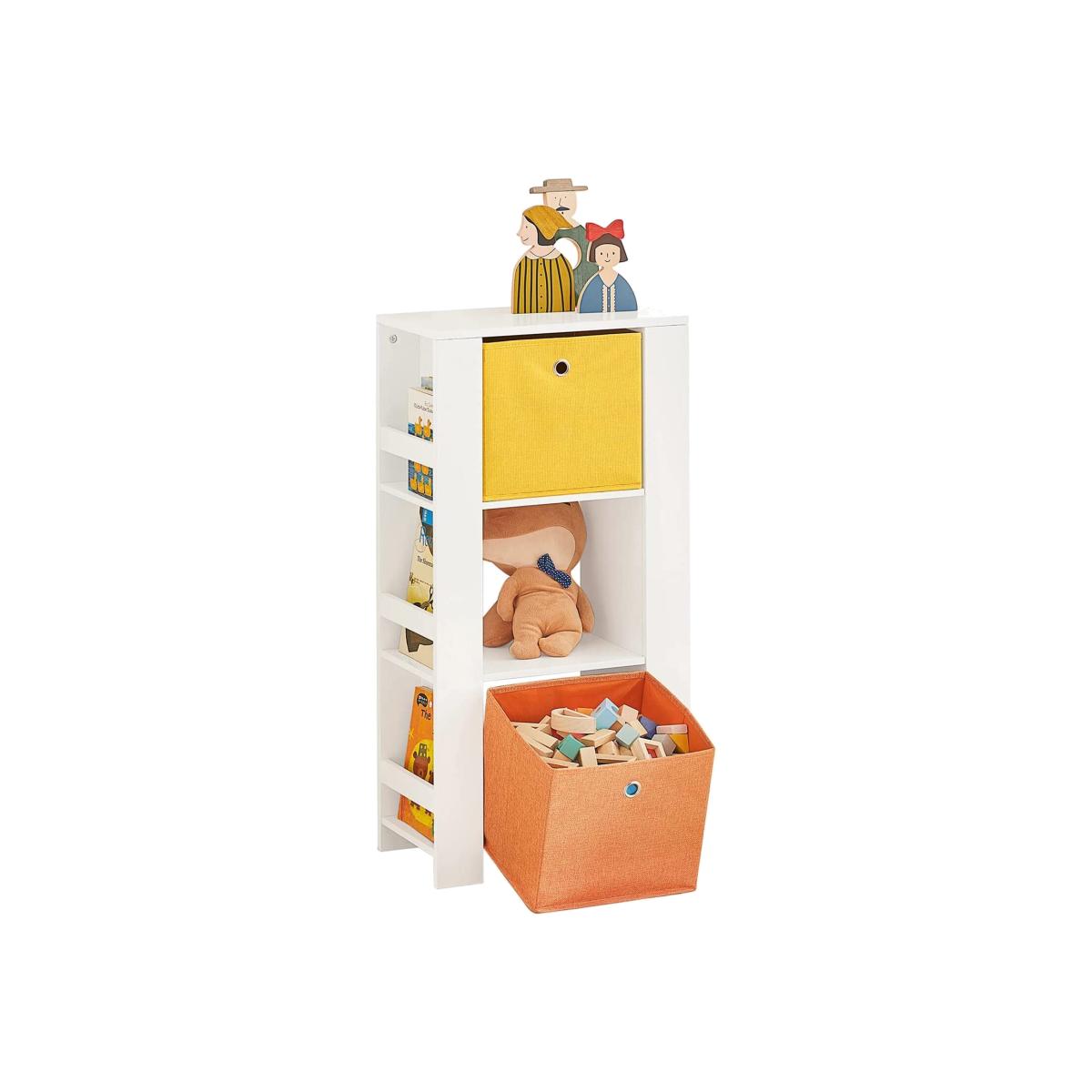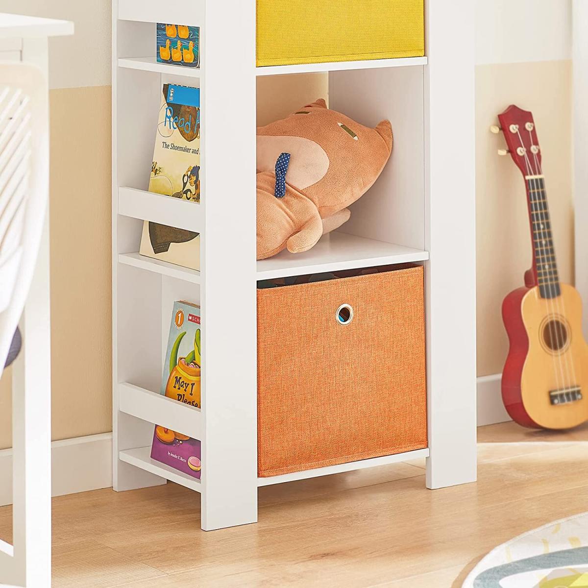Modern design children storage shelf will blend perfectly with any decor. It will keep your room nicely organized.6 side shelves (3 on each side) keep books from being damaged, flexible for books of varying size and thickness.2 fabric drawers can be pulled out completely as a great storage solution. The open compartment offers additional storage space for the books and toys. Made of high quality MDF in white lacquer. The 2 drawers are made of non-woven fabric---one is yellow and one is orange. Suitable for children ages 3 and up, promotes organisation and reading skills. Sturdy wood with environmental protection paint and the anti-tipping device, ensure good stability and safety, an ideal choice for daycare, classroom and children's room.
