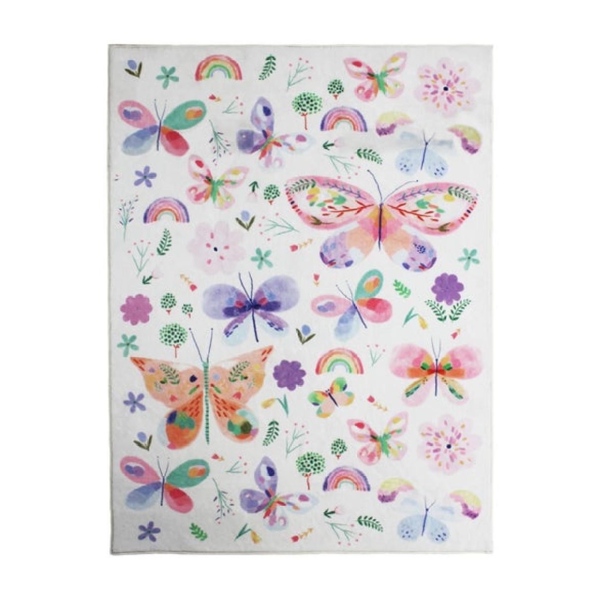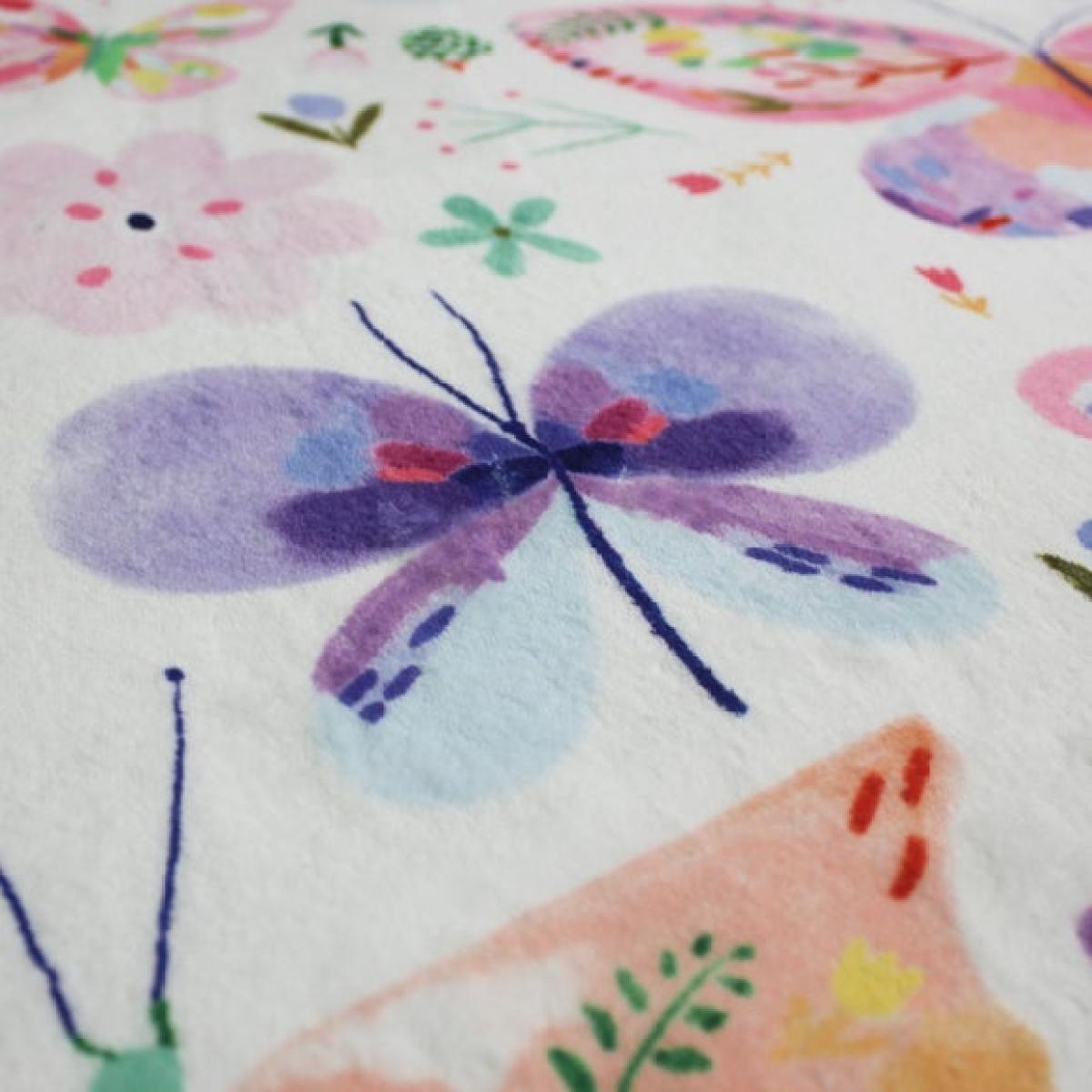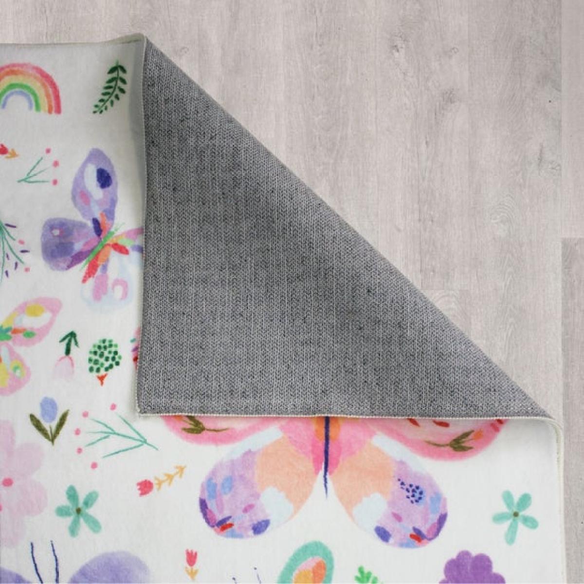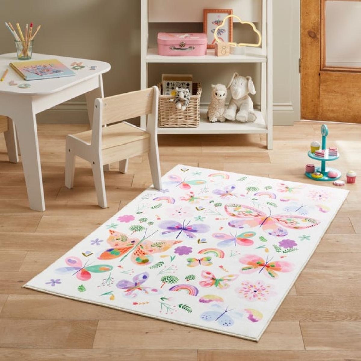 * Machine washable * Delicate butterfly design * Soft touch * Cotton blend The Painted Butterflies Washable Faux Fur Kids Rug features a delicate, colourful butterfly design to add a cheerful pop of colour to any space. Crafted from a soft-touch faux fur cotton blend, it offers a plush, comfortable feel that’s perfect for little feet. Not only is it incredibly soft, but it’s also machine washable, making it easy to care for, no matter the stains or messes. Designed for durability in children’s spaces, this rug is built to withstand the daily adventures of young ones while adding a magical element to their bedroom or playroom. Care Instructions: Shake or vacuum to remove and loosen fibres, dirt and debris using a nozzle attachment. In the case of spillage, blot with a clean cloth. Place into the washing machine on a gentle cycle at 30 degrees and air-dry flat. Due to the nature of cotton expect a small amount of shrinkage after washing. For best results lay flat and reshape as soon as possible. We recommend our small and medium size washable rugs up to 120 x 170 will fit most washing machines sizes between 8 - 10kg. Please check your manufacturer guidelines before washing and do not overload the drum. For Large and High pile washable rugs a laundrette service may be required.