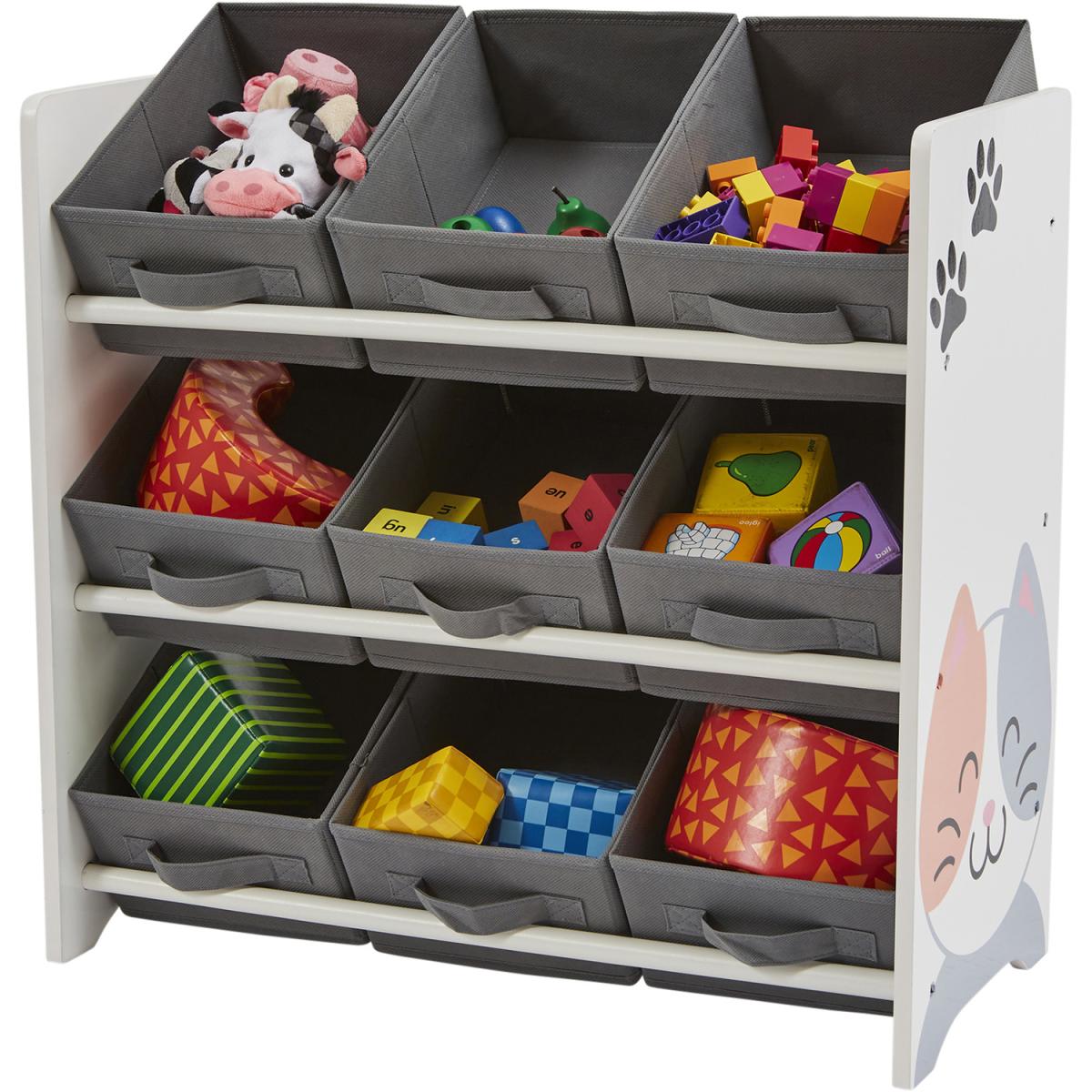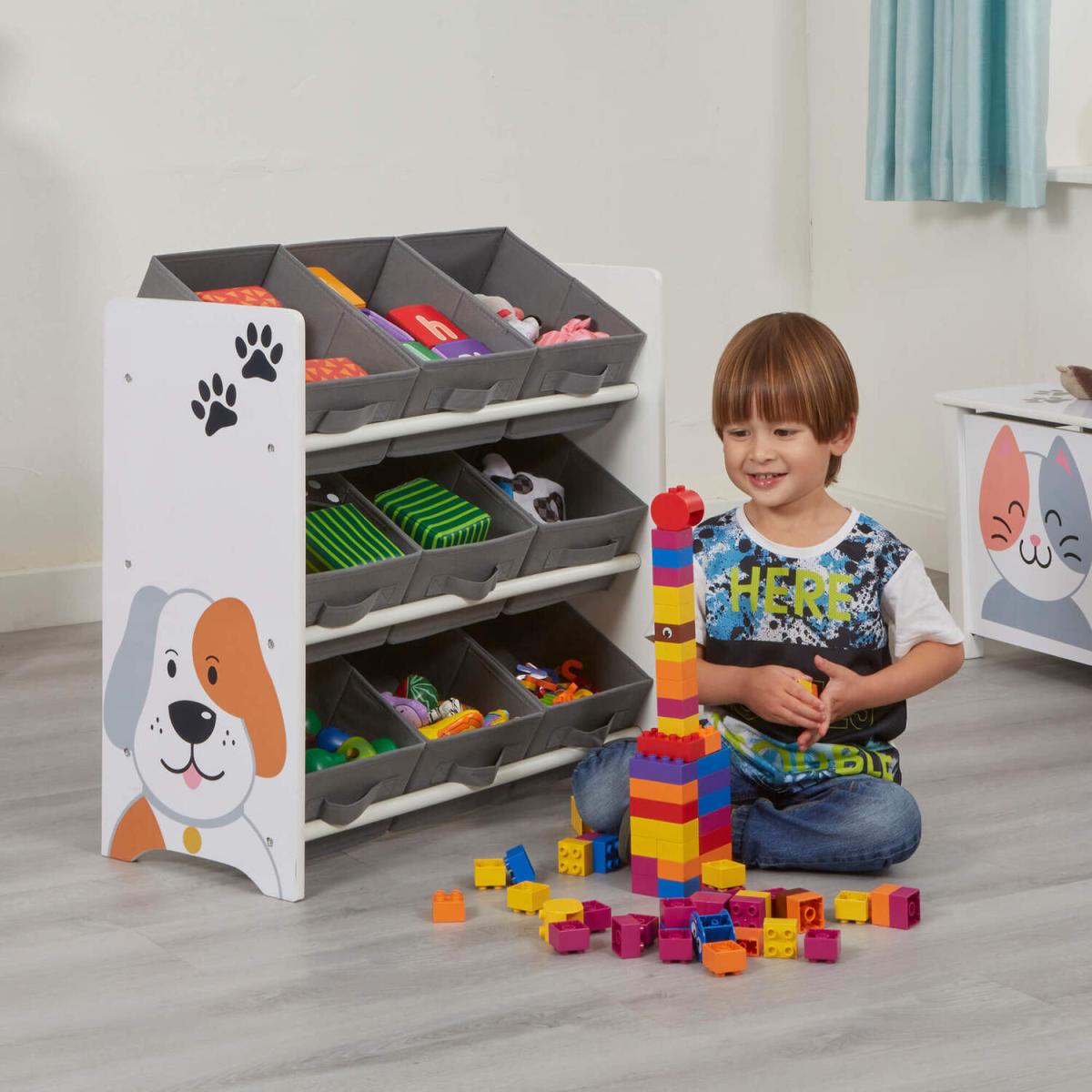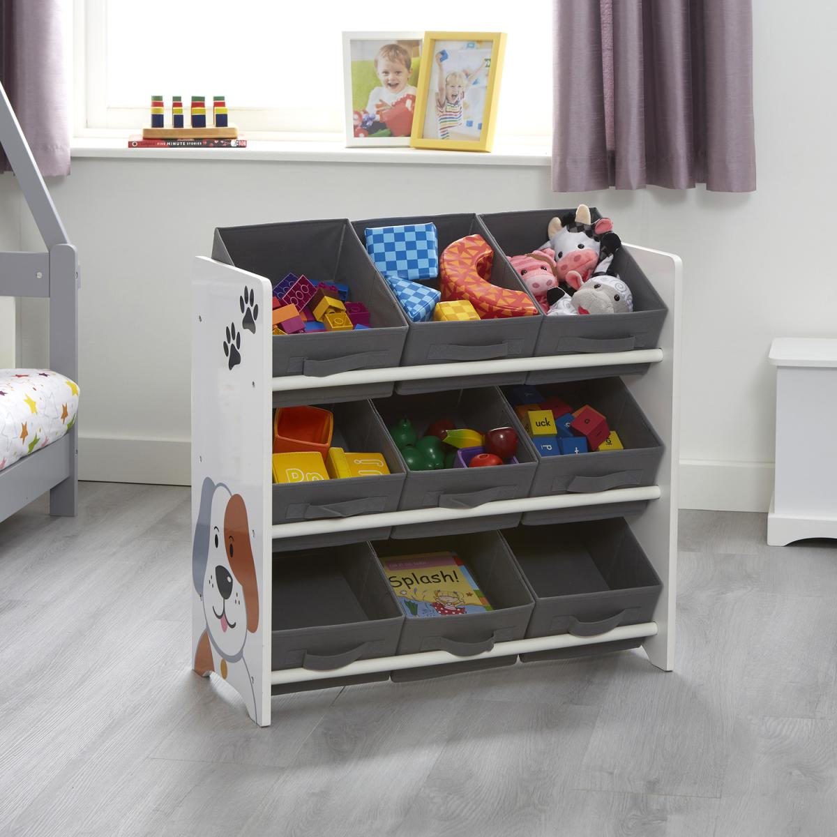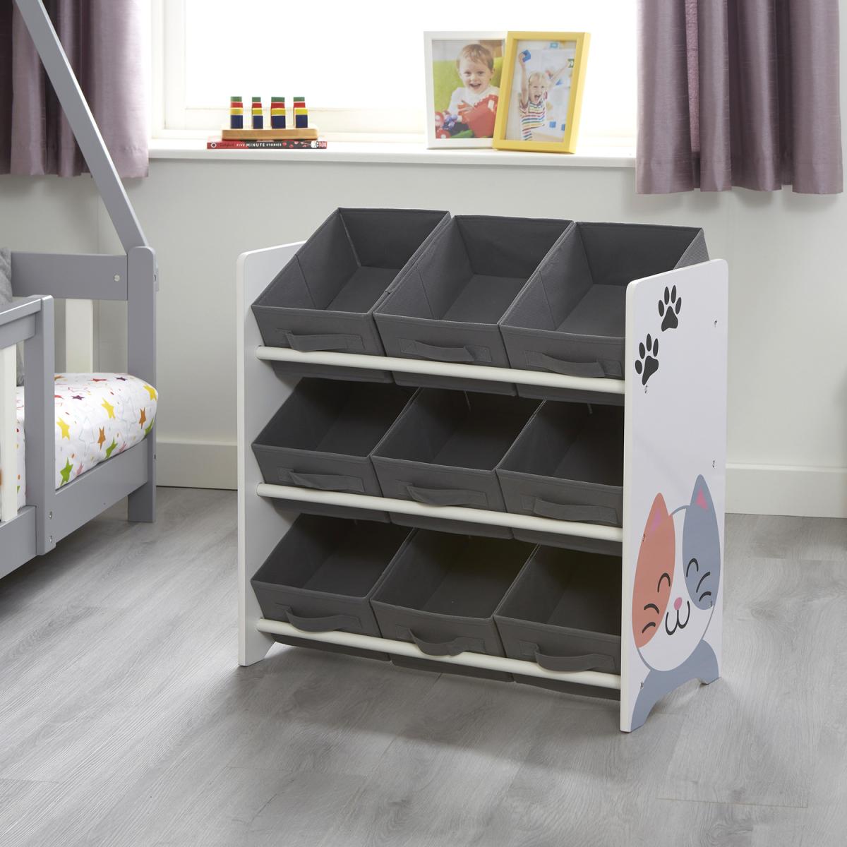 Attractive, fun, practical storage solution for your child's bedroom or playroom. With family favourite pets of cat and dog on the unit, this will make a lovely addition to your child's space. Includes 9 bin fabric storage boxes and a wooden unit. The fabric storage boxes with handles sit across 3 shelves. The storage boxes are removable and lightweight, making playtime and tidying up quick and easy. The storage boxes can also be stored flat or at a display angle. Made from sturdy, long-lasting wood materials and durable non-woven fabrics. This children's storage unit is durable, robust, and designed with children in mind, so has no sharp edges. A durable lacquer finish gives the unit a nice sheen whilst also providing added protection against scratching. Unit and storage boxes are super easy to clean by using a damp cloth. Item comes supplied flat packed and coordinating items are available.