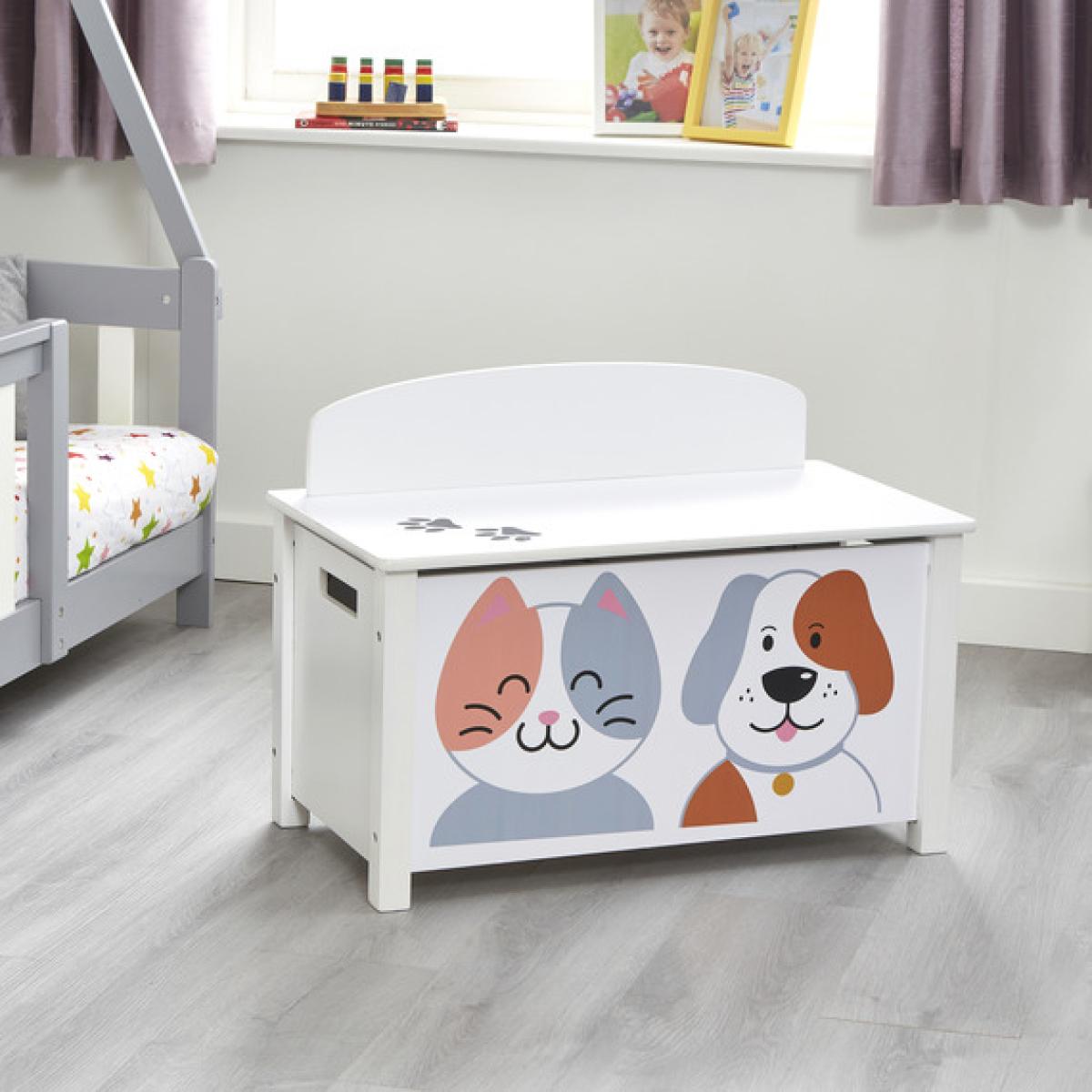 I love this kids’ toy box because it adds a playful touch while remaining practical and stylish. The white and grey tones make it versatile enough to blend seamlessly into various nursery or children’s room schemes, especially those with Scandinavian or modern minimalistic themes. The fun animal illustrations make it appealing without overwhelming the space, making it perfect for a child’s room or play area. Styling tips include placing it alongside soft pastel or neutral-toned furniture to keep the room light and airy, and adding cuddly cushions or colourful rugs nearby to create a cosy, welcoming environment. Its sturdy build also means it can double as a seat or low table when needed, making it a real functional piece in your child’s space.