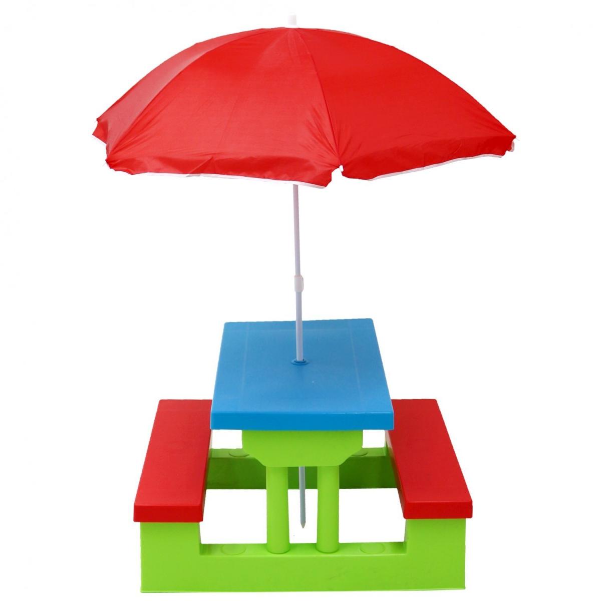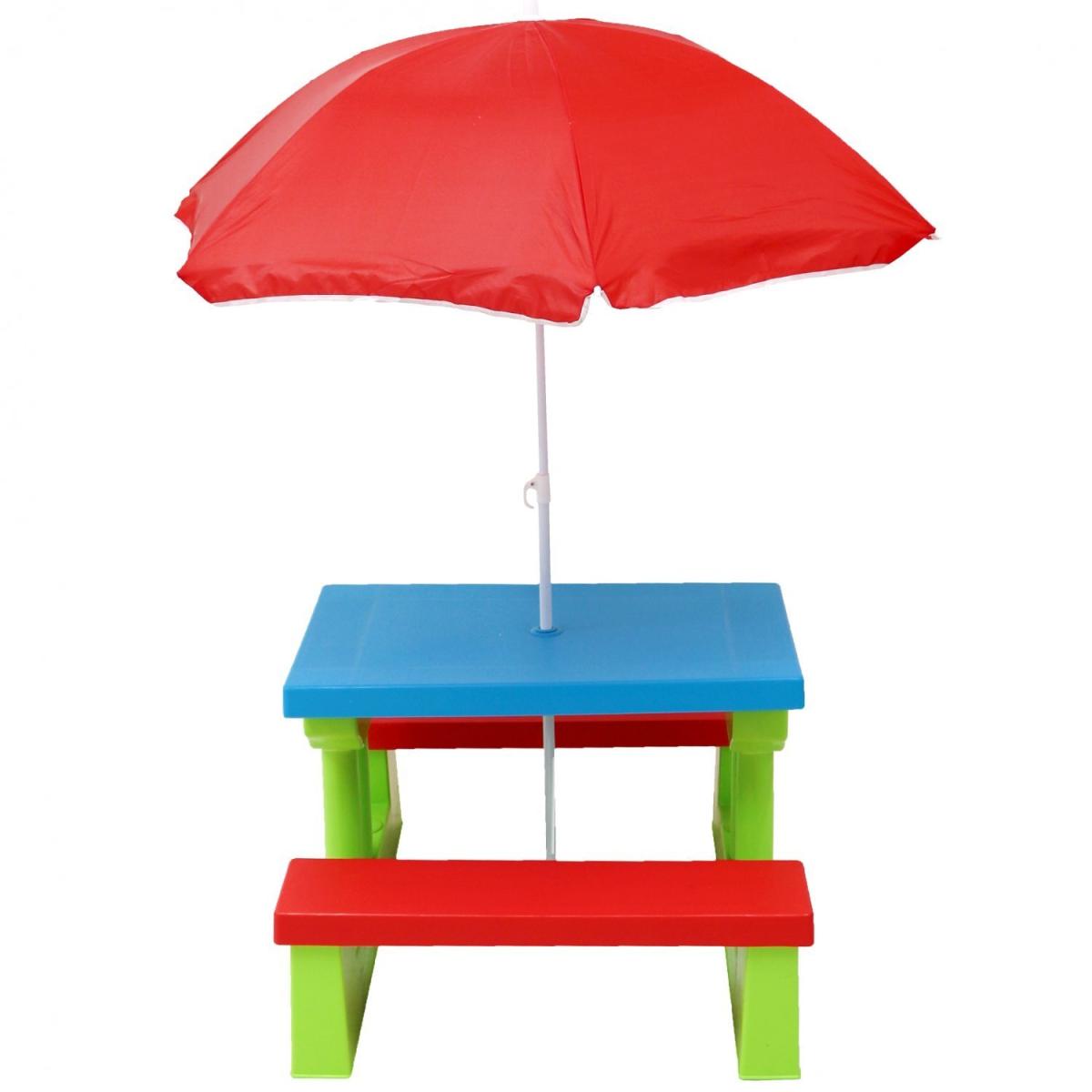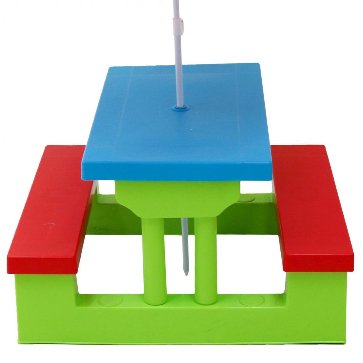 Kids Childrens Picnic Bench Table Set Outdoor Parasol Furniture. This colourful picnic bench set for children offers comfortable seats for younger members of the family to eat and play in the garden or indoor. It is great for any event, and fits in almost anywhere, providing a little extra seating for little visitors. It can seat up to four small children!The set consists of two fixed benches a table and a sun parasol. It is made of durable waterproof plastic, which makes it easy to clean and well-suited to outdoor use, and is a colourful and cheerful addition to any home. Whether you are hosting a birthday party or just spending a family day in the garden together, this toy is great for parents and children alike. Dimensions: 67cm (L) x 41cm (W) x 47cm (H)Parasol Size: 135cm (H) x 107cm (D)Product is EN71 Certified.