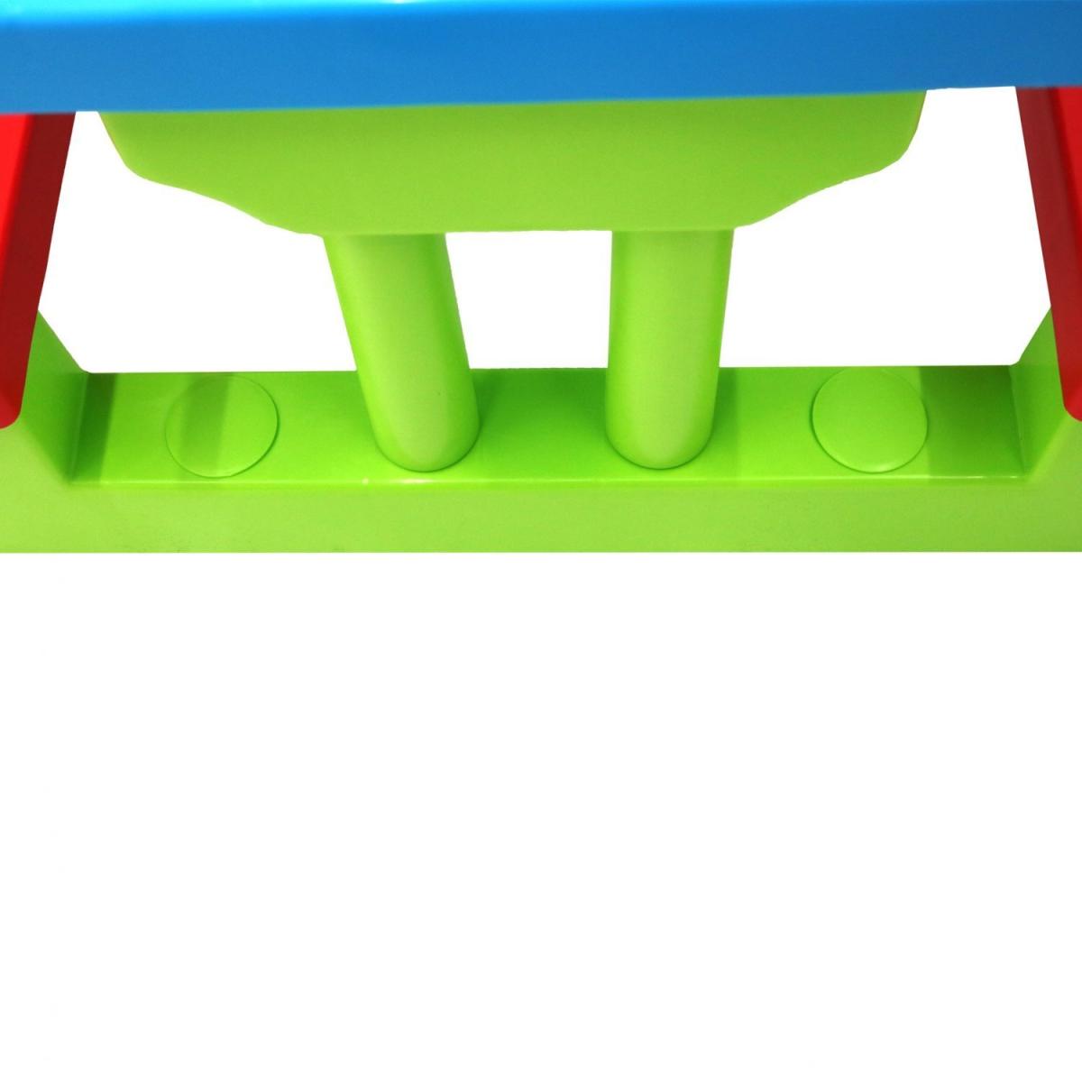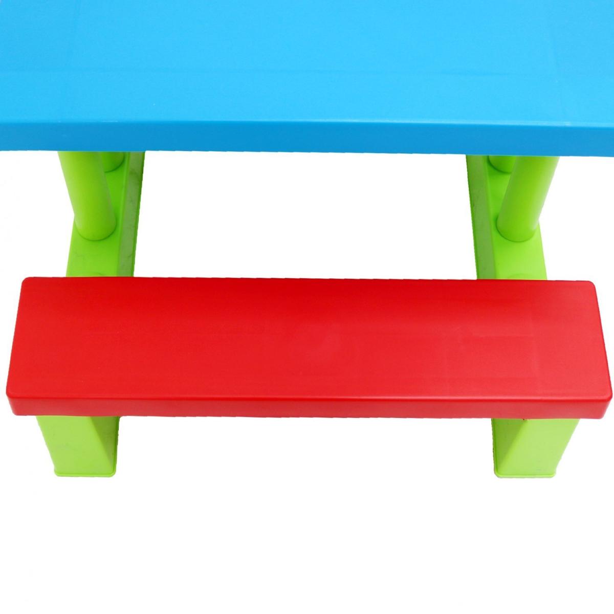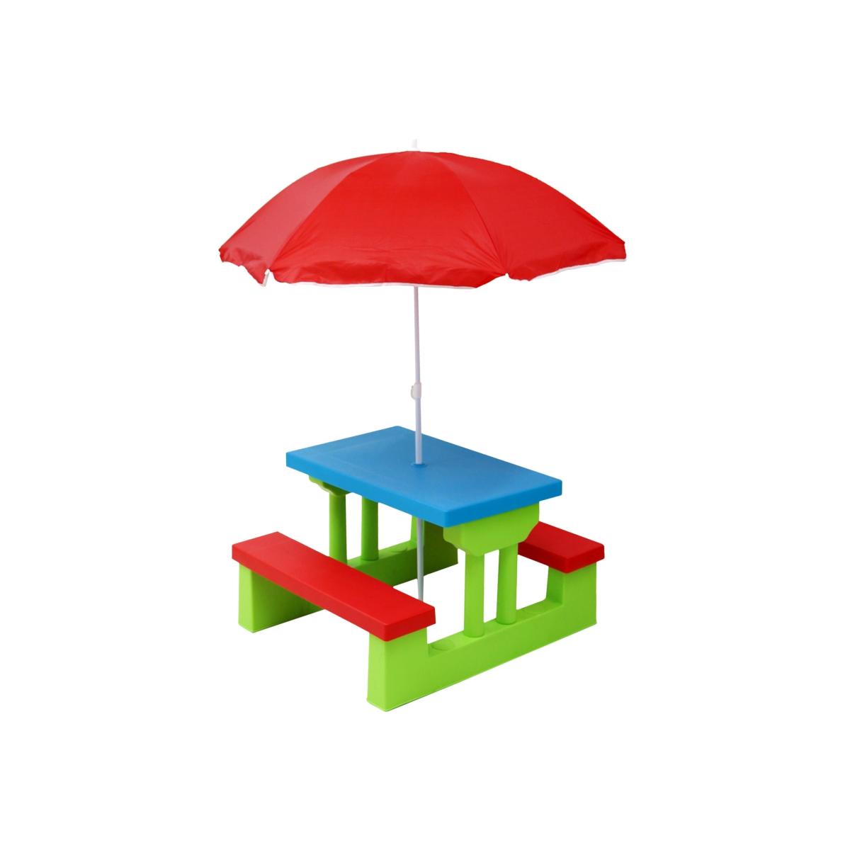 Kids Childrens Picnic Bench Table Set Outdoor Parasol Furniture. This colourful picnic bench set for children offers comfortable seats for younger members of the family to eat and play in the garden or indoor. It is great for any event, and fits in almost anywhere, providing a little extra seating for little visitors. It can seat up to four small children!The set consists of two fixed benches a table and a sun parasol. It is made of durable waterproof plastic, which makes it easy to clean and well-suited to outdoor use, and is a colourful and cheerful addition to any home. Whether you are hosting a birthday party or just spending a family day in the garden together, this toy is great for parents and children alike. Dimensions: 67cm (L) x 41cm (W) x 47cm (H)Parasol Size: 135cm (H) x 107cm (D)Product is EN71 Certified.