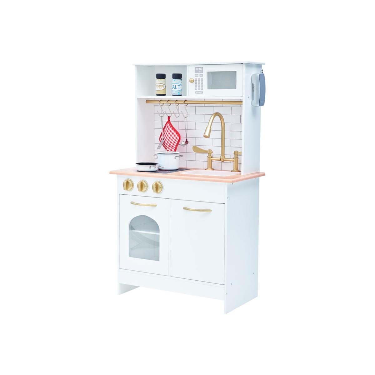 This modern wooden play kitchen features retro touches, like a deep farmhouse sink and tap and a faux subway tile backsplash. Interactive tap handles and oven dials that turn and click for a realistic play experience and ample storage space.