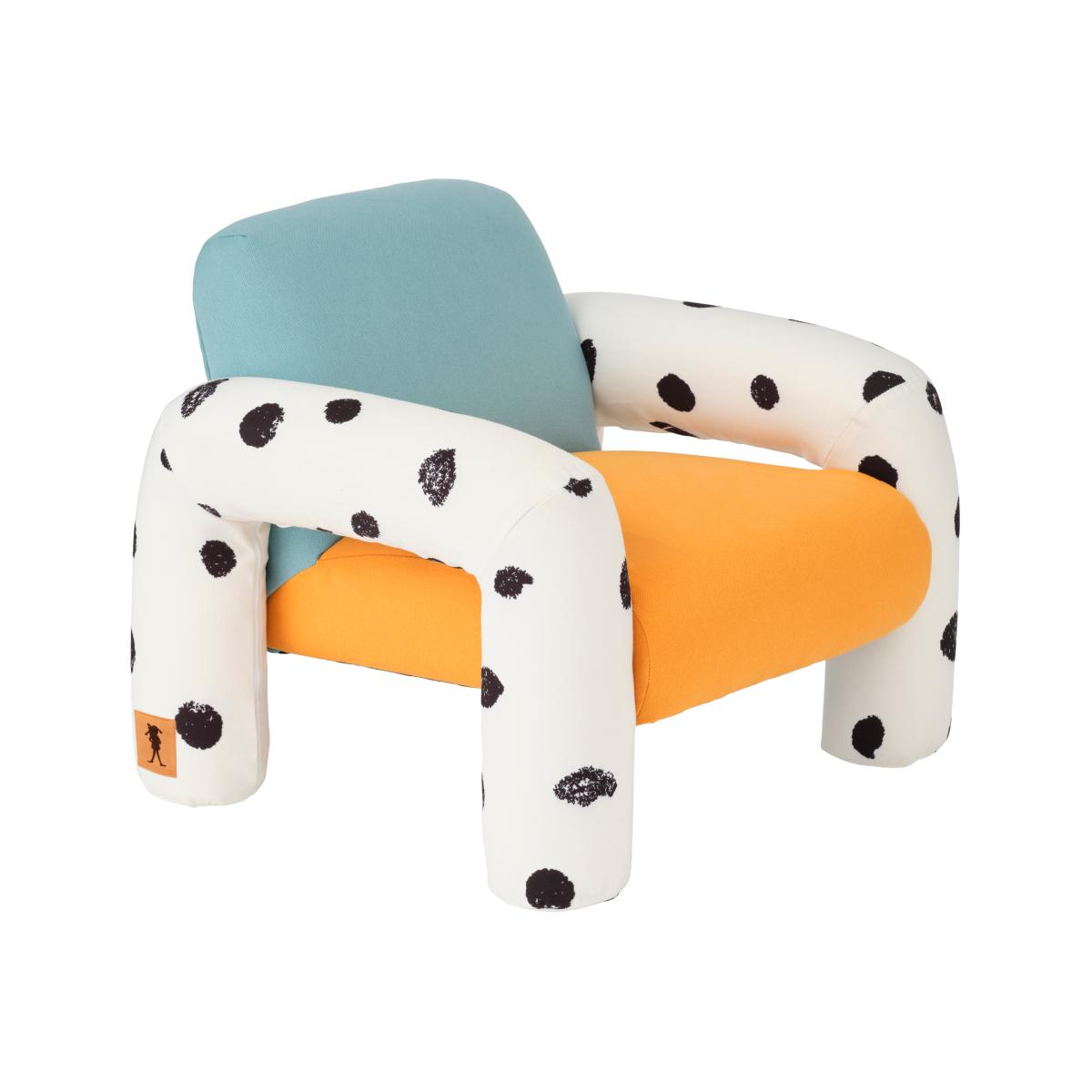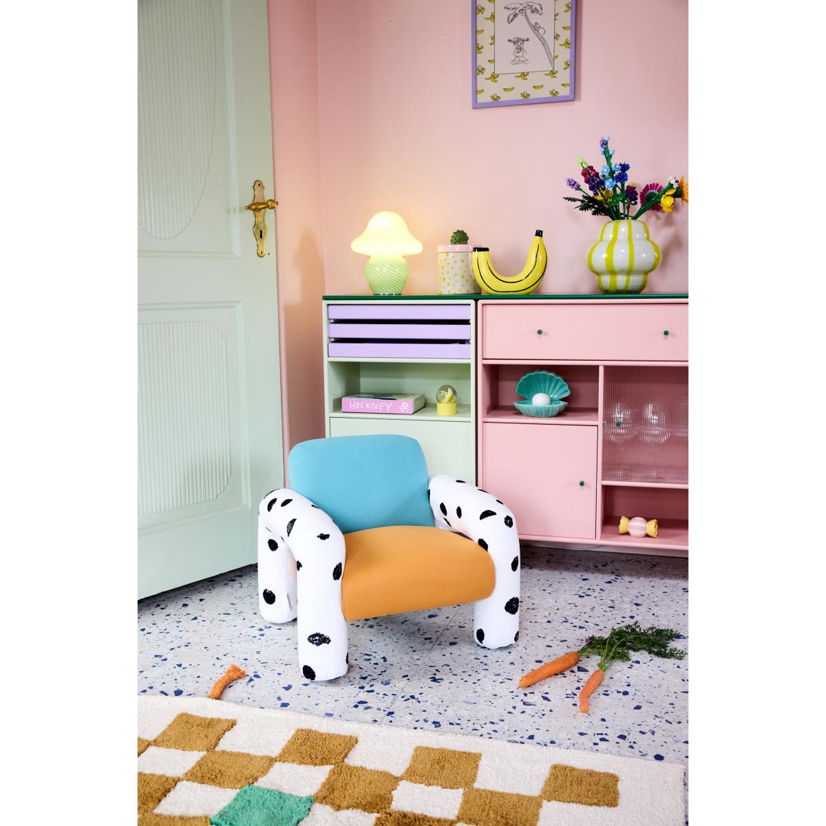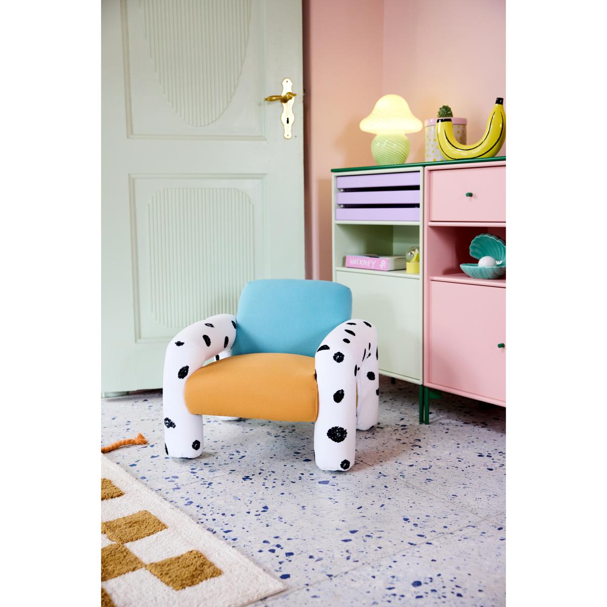 I love this little chair for adding a fun, playful touch to a child's room or family space. Its bold colour blocks and Dalmatian print make it a versatile piece that works well in modern, Scandi or eclectic interiors. The rounded, cushioned design ensures comfort, while its size makes it ideal for smaller spaces or as a cosy reading nook. For styling, try pairing it with neutral or pastel furniture and minimal accessories to let the chair stand out, or add a few colourful cushions for extra personality. It also works well in a collaborative playroom, bringing both function and fun into the space.