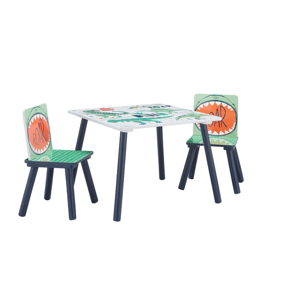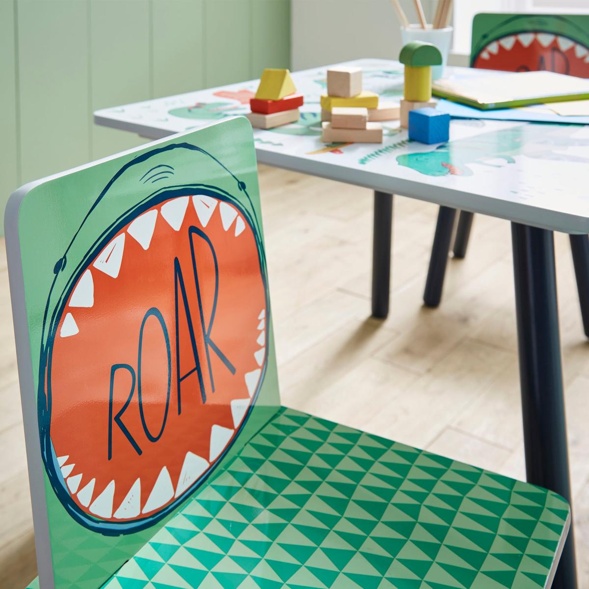 The Kids Dino Table and Chairs Set is the perfect addition to any bedroom or playroom and is sure to lift the spirits of your little ones and brighten the look of any space. Using a stylish green, blue, and white colour scheme, the table features a colourful design of drawn dinosaurs whilst the chairs feature a 'ROAR' motif and dino mouth design. The chairs tuck away neatly under the table for extra space.
