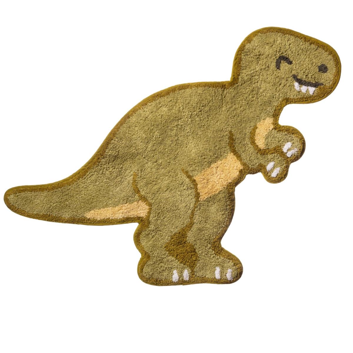 Green Kids Dino-shaped rug. Perfect for children's room and dinosaur fan. They are crafted from cotton.