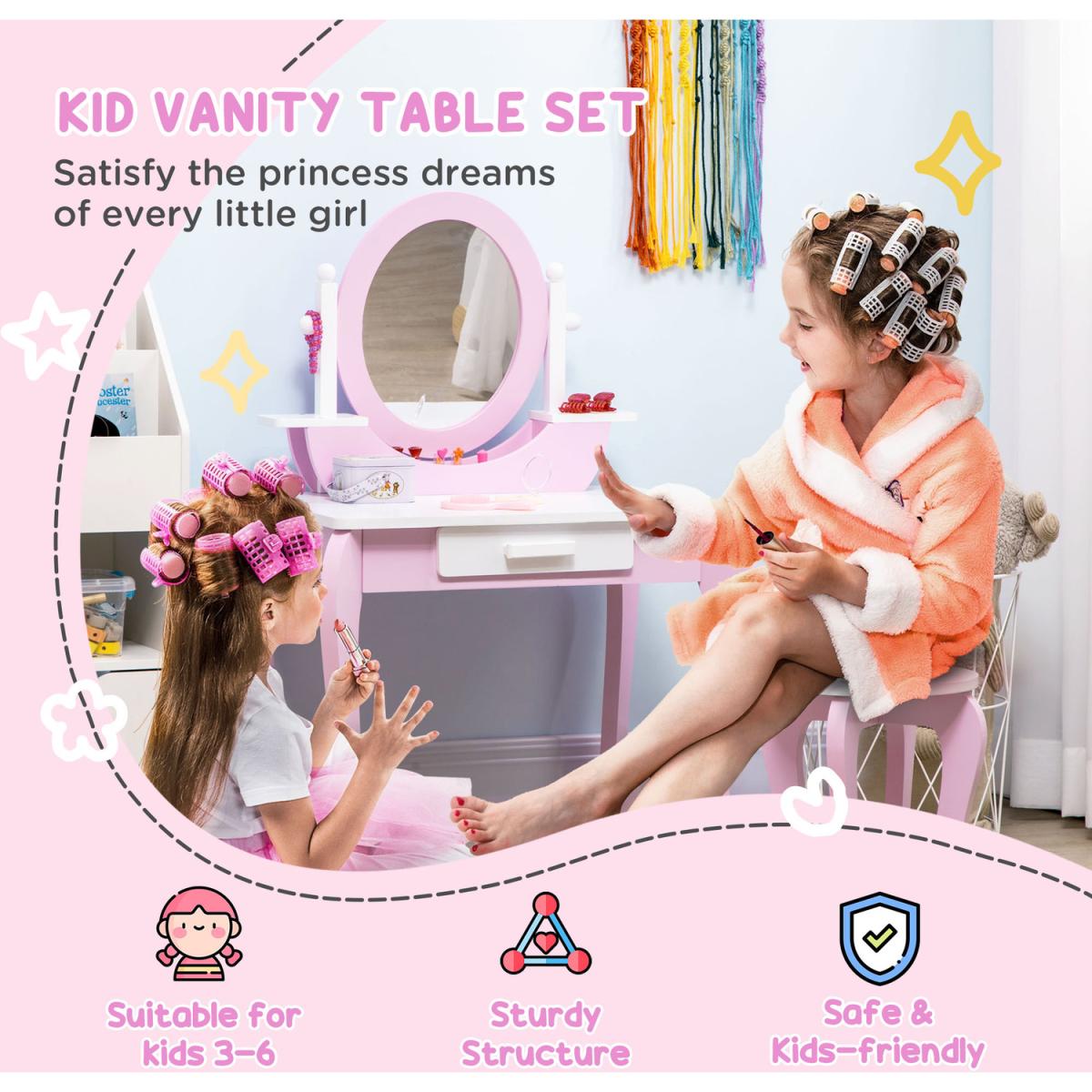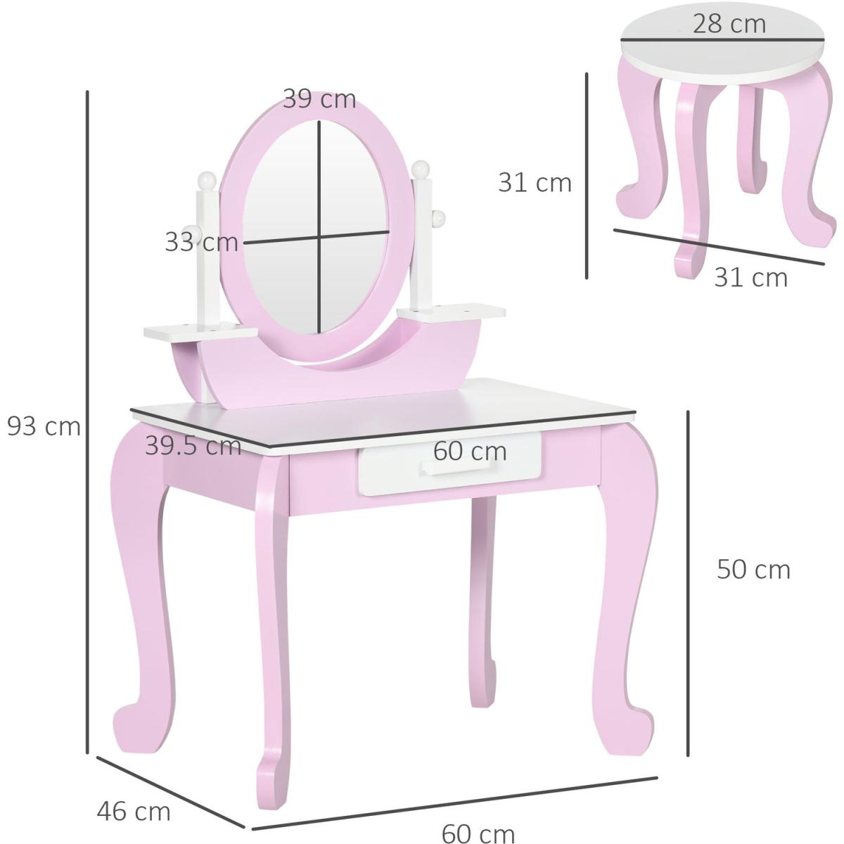 With a table, stool and mirror, this ZONEKIZ vanity set is perfect for your child's room. A cute all-pink appearance, it has a princess feel to it, which sets the tone nicely for their bedroom. A wide tabletop and drawer for keeping loose accessories, their space stays tidy and free of clutter. Made from MDF, all edges are smooth and rounded for safety, whilst the large mirrors are made from acrylic, which don't break easily. Kids have their own space to play, do homework, get ready and more.