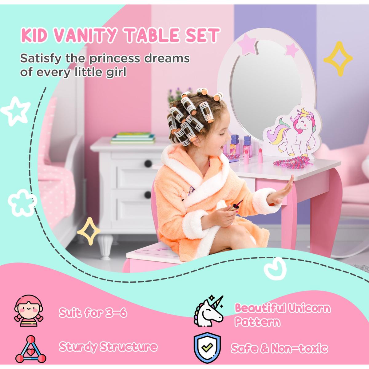 Transform your child's room with this HOMCOM kids vanity table. Vibrant and magical, its pink unicorn theme sets the tone nicely in any room. With a table and stool, they'll use it to get ready for school, do homework and more. Keep loose accessories in the drawer or on the wide tabletop, so everything stays tidy. Made with durable MDF, all edges are rounded for safety, whilst the large mirror is made from acrylic, which don't break easily. Turn fantasy into reality, adding spark to their room.
