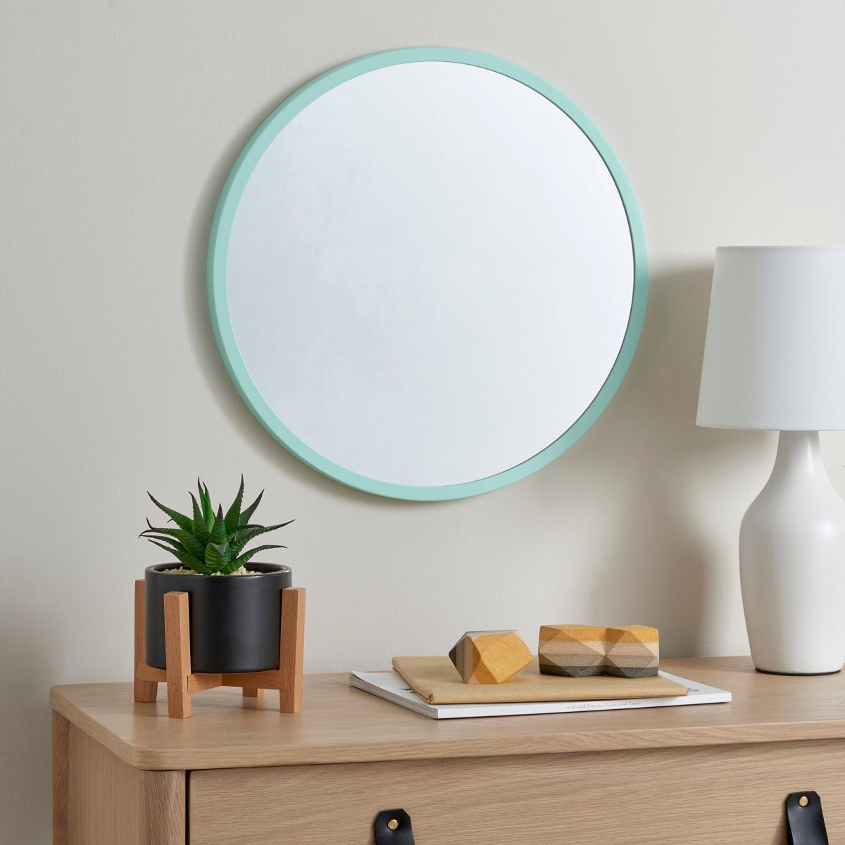 I love this round aqua mirror for its playful yet versatile appeal, making it ideal for a child's bedroom or play area. Its soft colour tone adds a gentle pop of colour without overwhelming the space, and the round shape keeps the look modern and friendly. It works particularly well in interiors that favour minimalist or Scandinavian styles, where clean lines and subtle colour accents are key. For styling tips, consider hanging it above a small desk or dressing table to create a functional and fun reflective space. You could also incorporate it into a gallery wall of framed prints or artwork for a lively, personalised look. Its manageable size and cheerful hue make it a practical choice for adding brightness and visual interest to a child's room or a family space.