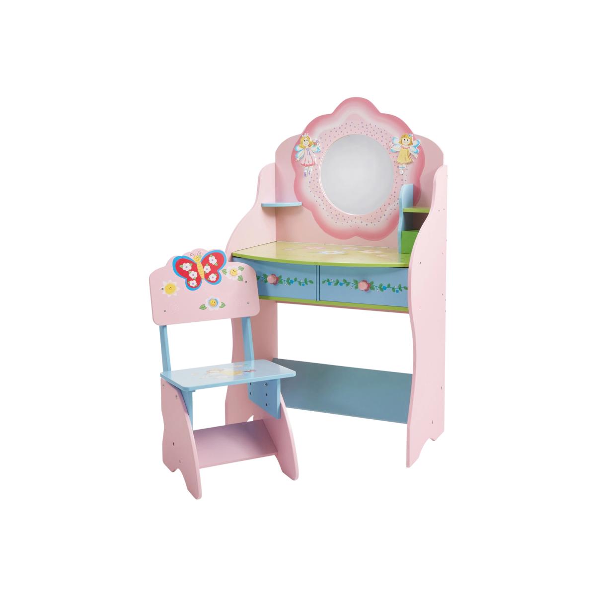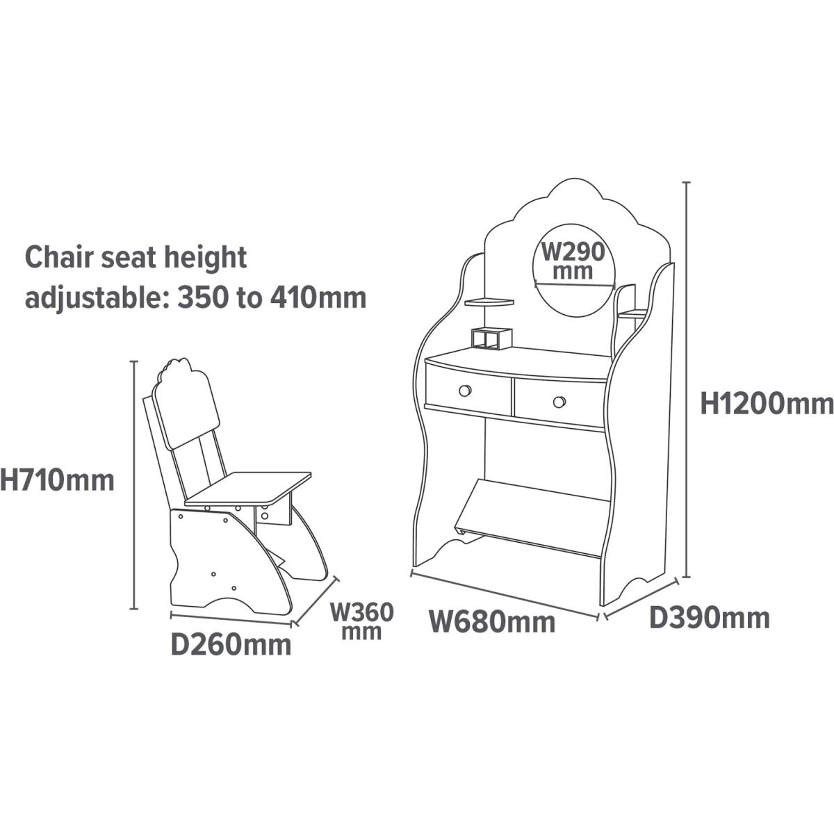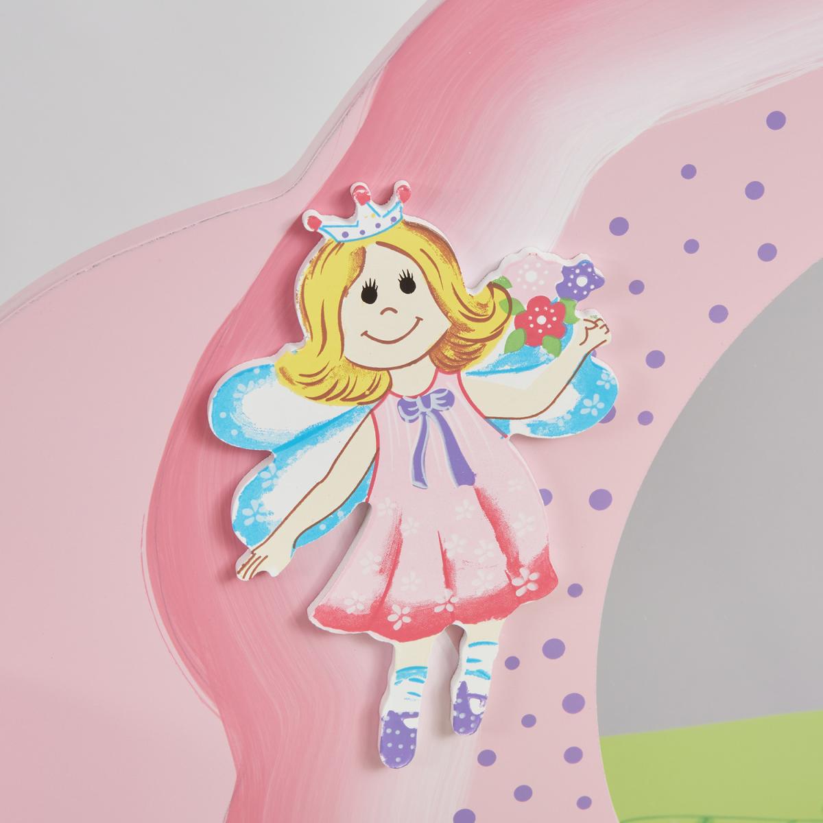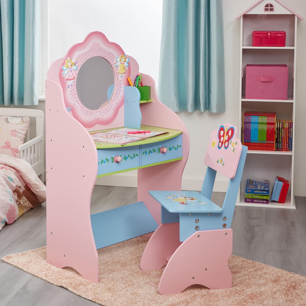 Add a touch of elegance to your childs bedroom with our kids fairy dressing table with matching height adjustable chair. This set comes with a table, height adjustable matching chair, 2 storage drawers, a child safe mirror, a pen pot, and an angled footrest for comfort. Both the dressing table and chair have beautiful hand-painted fairies, flowers, and butterflies. Our fairy dressing table and chair have a lacquer coating to protect against scratching. This makes it super easy to keep clean, simply wipe using a damp cloth. As well as storage drawers, there are 2 small shelves and a cubby hole for even more storage. The child safe mirror is made from acrylic for extra durability. All the corners are rounded for additional safety. Coordinating items are available so you can create a fairy paradise.