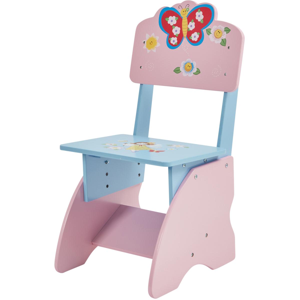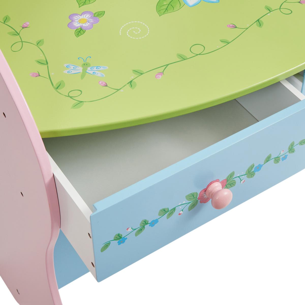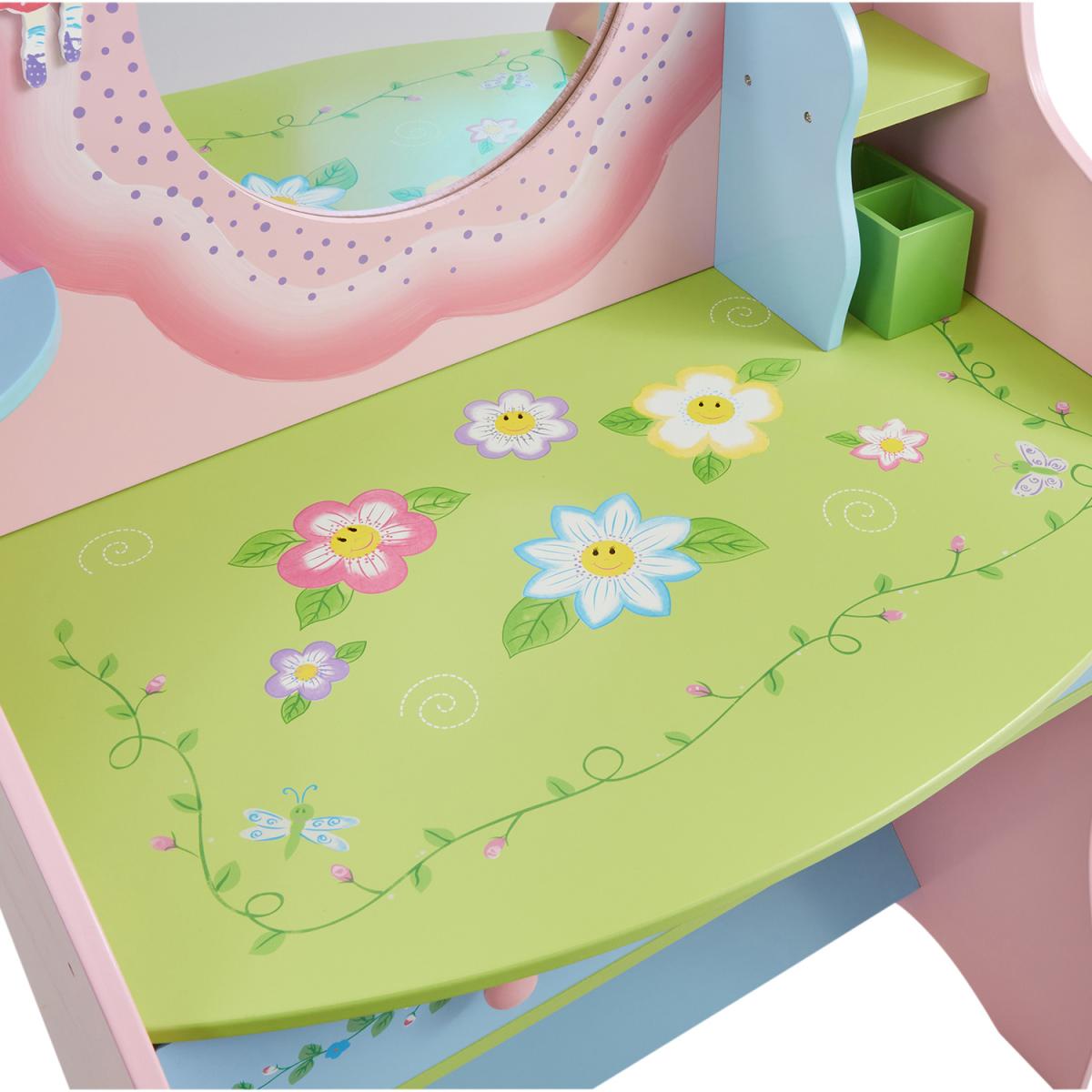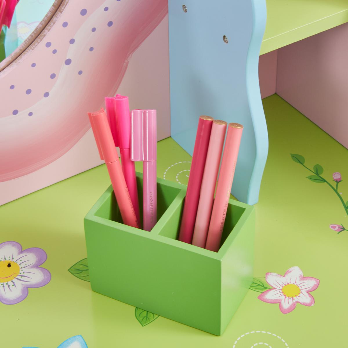 Add a touch of elegance to your childs bedroom with our kids fairy dressing table with matching height adjustable chair. This set comes with a table, height adjustable matching chair, 2 storage drawers, a child safe mirror, a pen pot, and an angled footrest for comfort. Both the dressing table and chair have beautiful hand-painted fairies, flowers, and butterflies. Our fairy dressing table and chair have a lacquer coating to protect against scratching. This makes it super easy to keep clean, simply wipe using a damp cloth. As well as storage drawers, there are 2 small shelves and a cubby hole for even more storage. The child safe mirror is made from acrylic for extra durability. All the corners are rounded for additional safety. Coordinating items are available so you can create a fairy paradise.