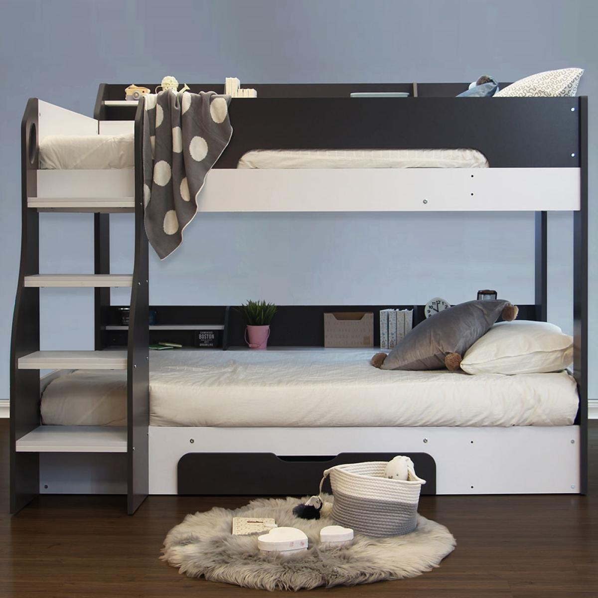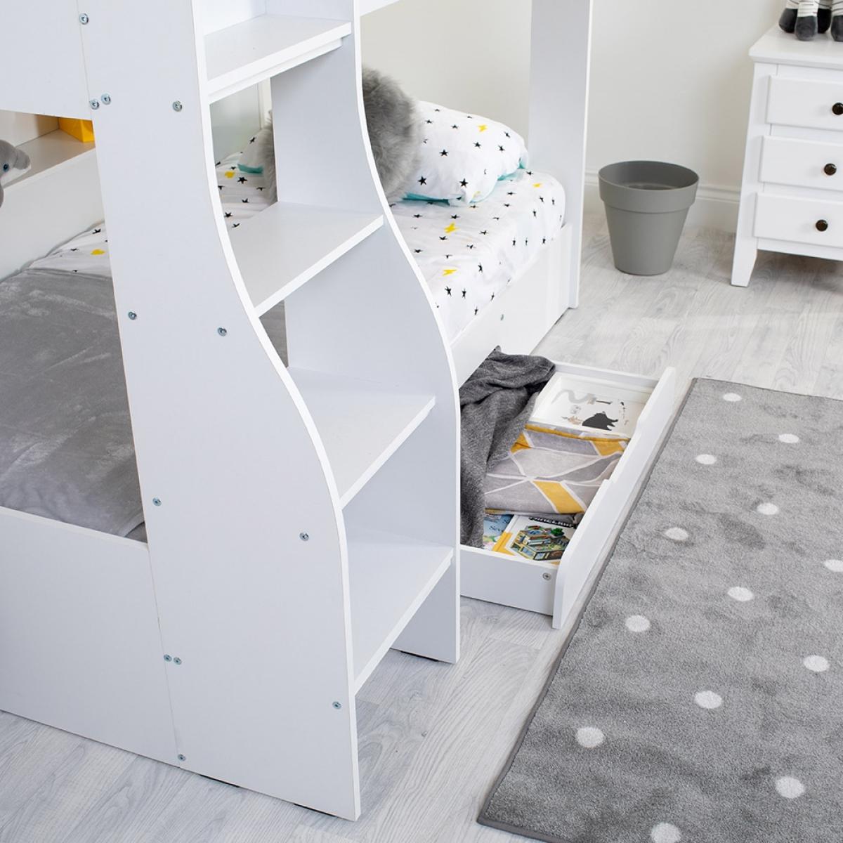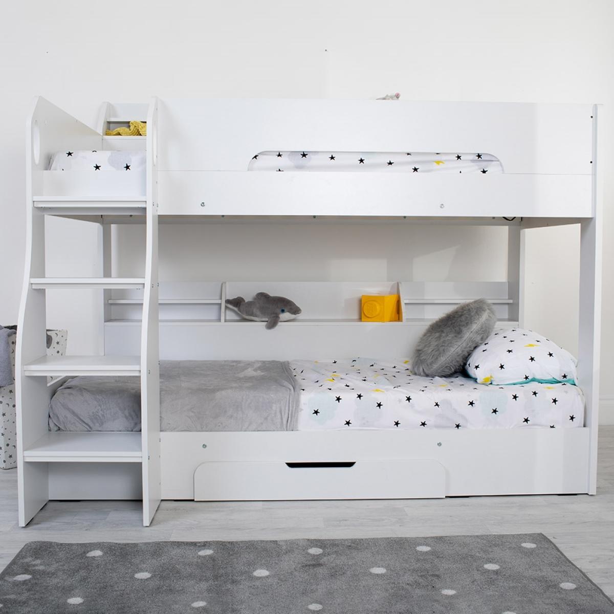 The Kids Flick Bunk Bed from Flair Furnishings, is a sure winner; with plenty of storage and a cool reversible ladder, it will add a contemporary feel to any bedroom. Featuring practical shelving on both the top and bottom bunk, perfect for keeping books, toys and all those little knick-knacks kids love to collect! A built-in under bed drawer, with its cut out handle, is convenient for extra storage of bedding or clothes - or all those teddies! The cool reversible ladder has been designed with both safety and practicality in mind having deep steps and hand holes, making climbing to the top a breeze!.