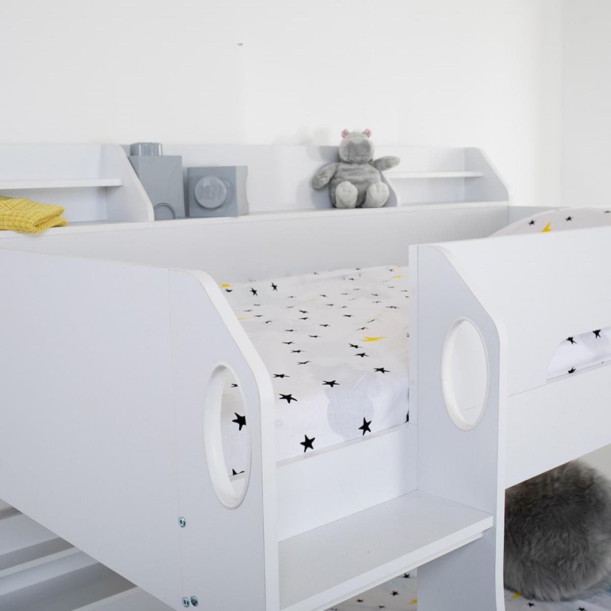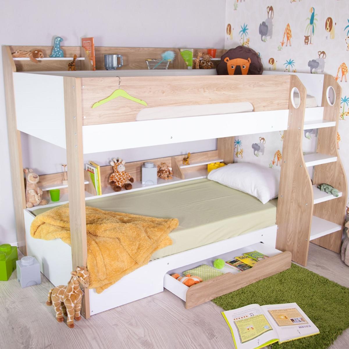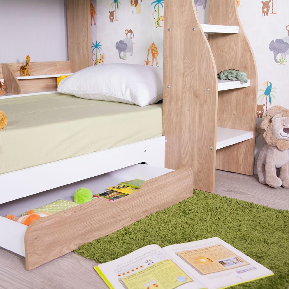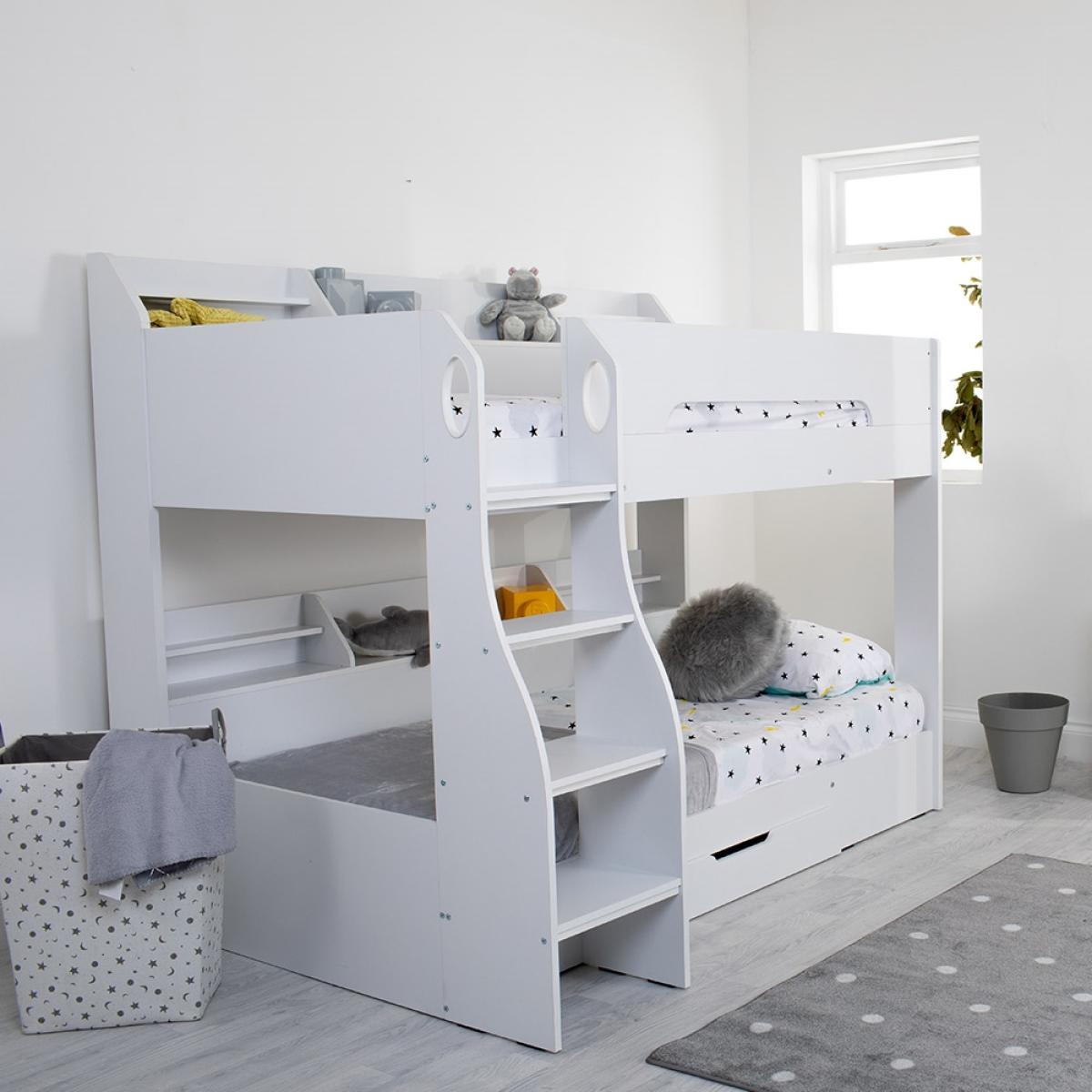 The Kids Flick Bunk Bed from Flair Furnishings, is a sure winner; with plenty of storage and a cool reversible ladder, it will add a contemporary feel to any bedroom. Featuring practical shelving on both the top and bottom bunk, perfect for keeping books, toys and all those little knick-knacks kids love to collect! A built-in under bed drawer, with its cut out handle, is convenient for extra storage of bedding or clothes - or all those teddies! The cool reversible ladder has been designed with both safety and practicality in mind having deep steps and hand holes, making climbing to the top a breeze!.