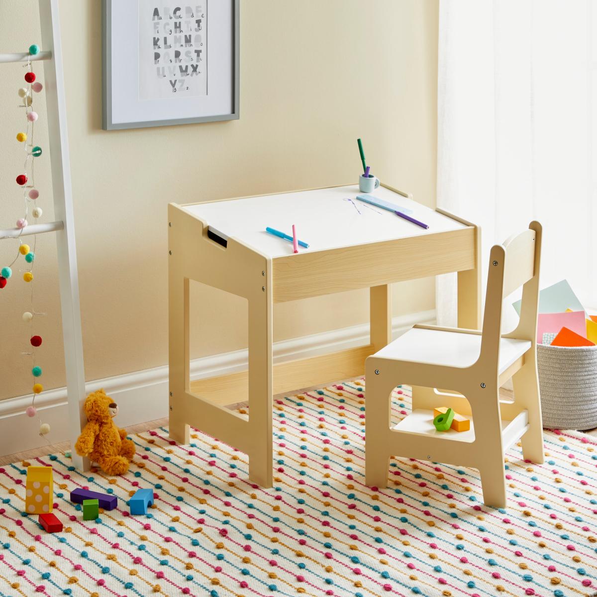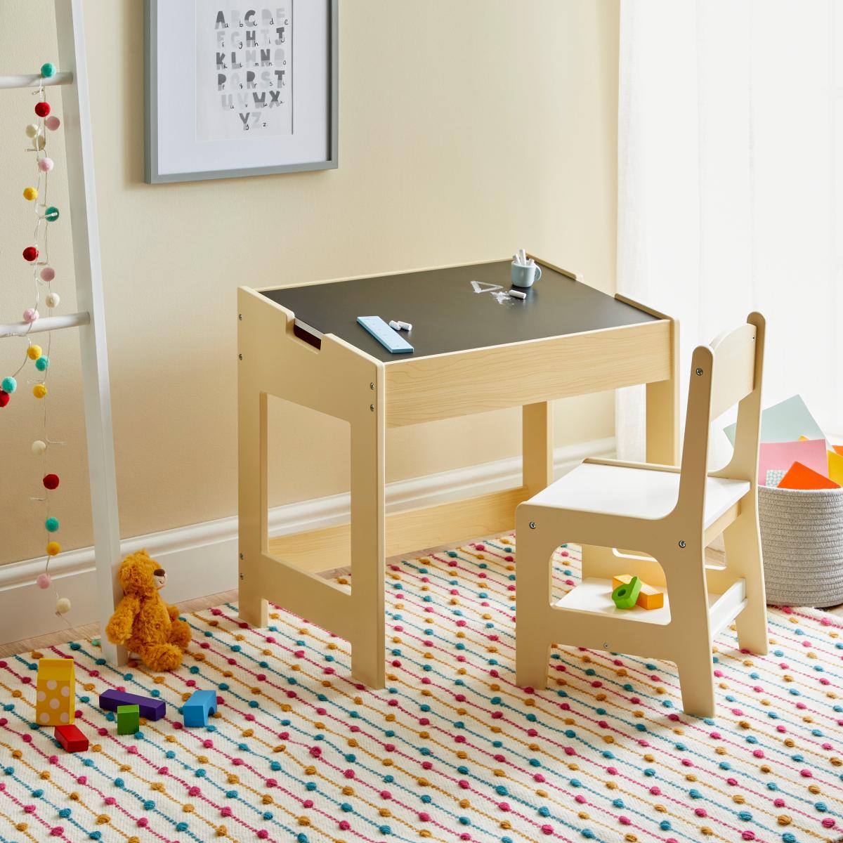 Let your little ones get creative with this desk and chair set with a twist. Sturdy and functional, this wooden desk has a removable top panel with a blackboard and whiteboard side to draw and scribble on to their hearts content. Removing this top panel also provides easy access to storage space, perfect for storing away papers, markers, books, and more. This set will look fantastic in a bedroom or playroom and is sure to be a favourite.