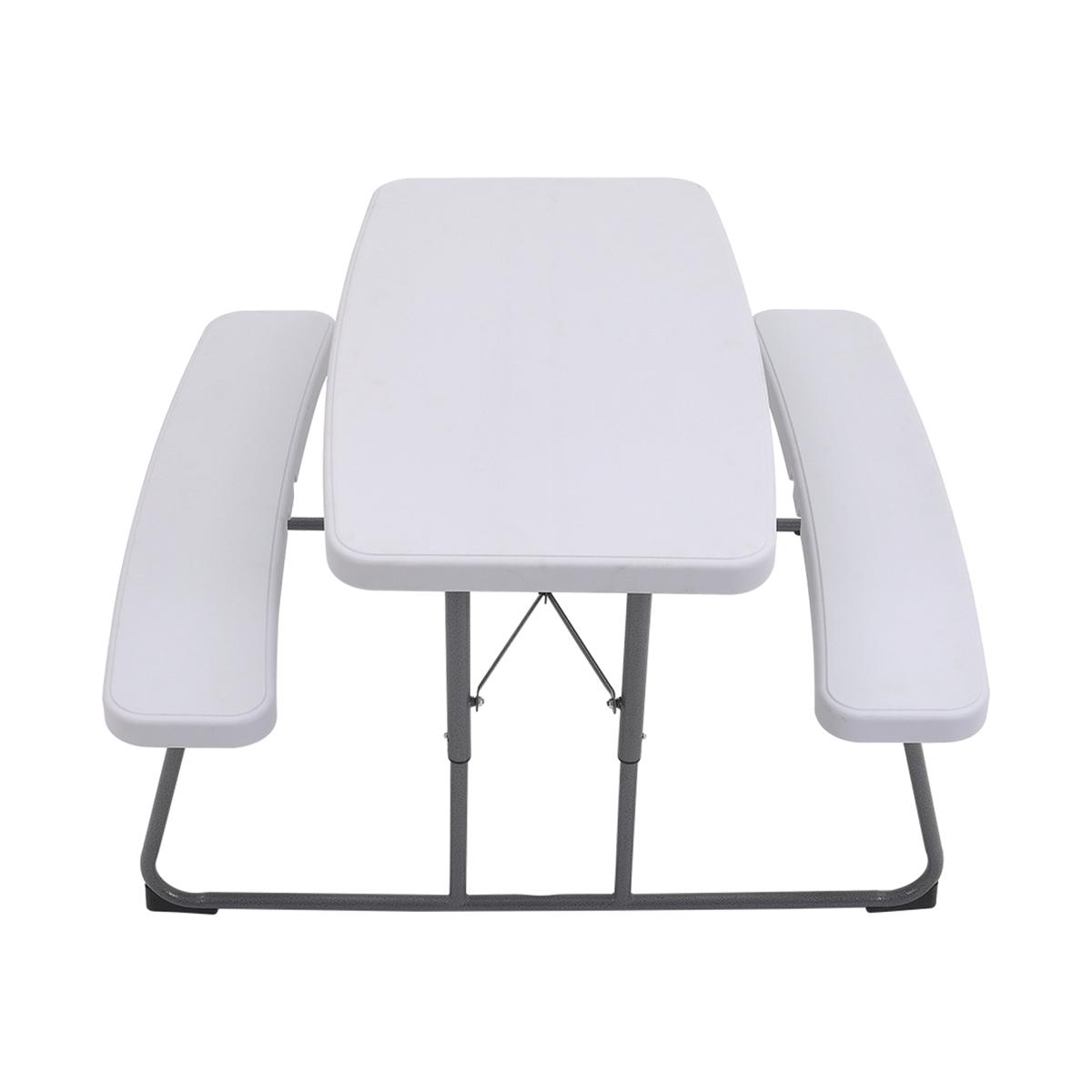 Transform family outings with Livingandhome's Kids Foldable Garden Picnic Table and Bench Set. Crafted from robust high-density polyethylene, supported by sturdy steel legs, and featuring rounded edges for safety, this set ensures a stable and secure sitting experience. Accommodating up to 4 children, it's perfect for games and meals. The tabletop height is easily adjustable, adding to its versatility. With four plastic pads ensuring safe and sturdy use, a lightweight design for travel, and a folding design for space efficiency, this set is a must-have for family camping and travel adventures. Note. There are black and blue spots on the table and chair surface, which increases the anti-aging effect