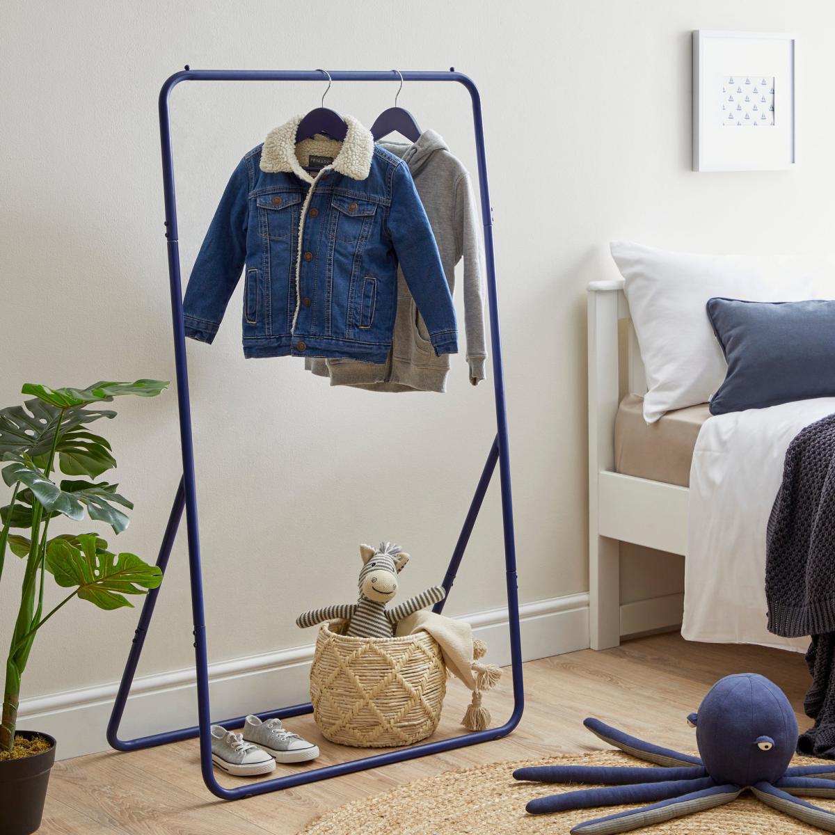 I love the navy kids rail for its sleek and practical design that seamlessly fits into a variety of interiors, from modern minimal to cosy nursery spaces. Its simple frame adds a touch of colour without overwhelming the room, making it a versatile piece that can be styled with hanging storage or layered with baskets on the floor for a fun, organised look. It works particularly well in bedrooms with neutral or soft colour palettes, adding a pop of colour and organisation without clutter. Practical styling tips include pairing it with colourful or patterned hangers to inject personality, or adding small hooks for accessories or bags. It’s ideal for encouraging tidiness while keeping clothes easily accessible for little ones.