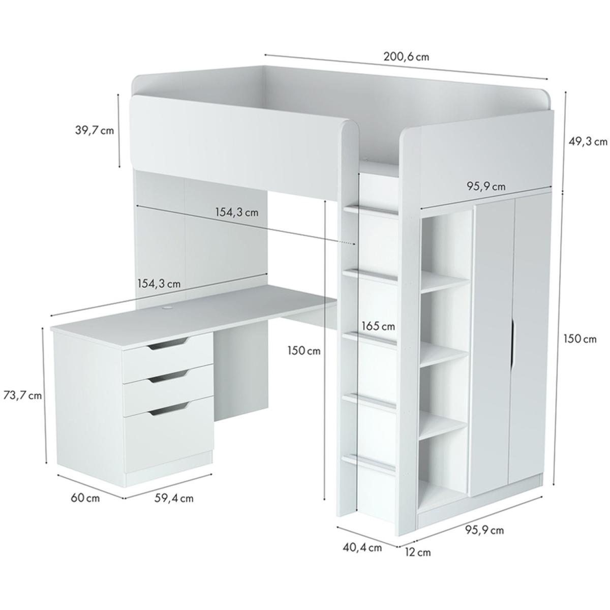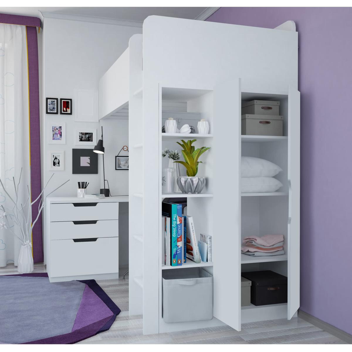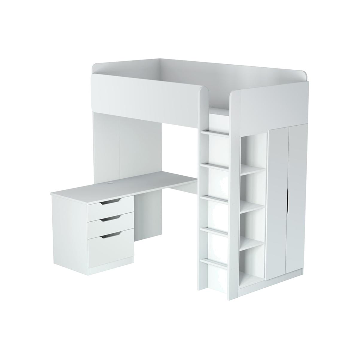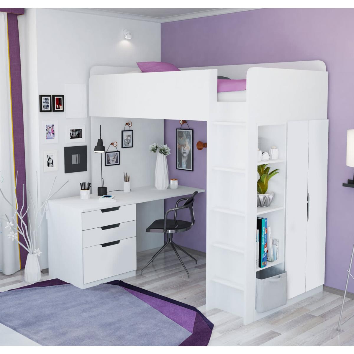 The High Sleeper Loft bed offers a full bedroom solution in a single unit. Taking up no more floor space than a standard-size bed. There's a generous size wardrobe with a hanging rail, a desk and a drawer unit that can be neatly tucked under the space beneath the sleeping area or turned perpendicular to give a little extra space for a chair. Once your child is aloft, the bed has high side rails for added safety. The bed is made from a quality, wood-grained particle board, finished in a durable wipe-clean surface. Mattress and accessories not included. The bed takes a European size, 200cm x 90cm easily available from most stores. This item is delivered on a pallet and will be left on drive way. Please ensure you have 2 people available on delivery day to carry the goods inside the house.